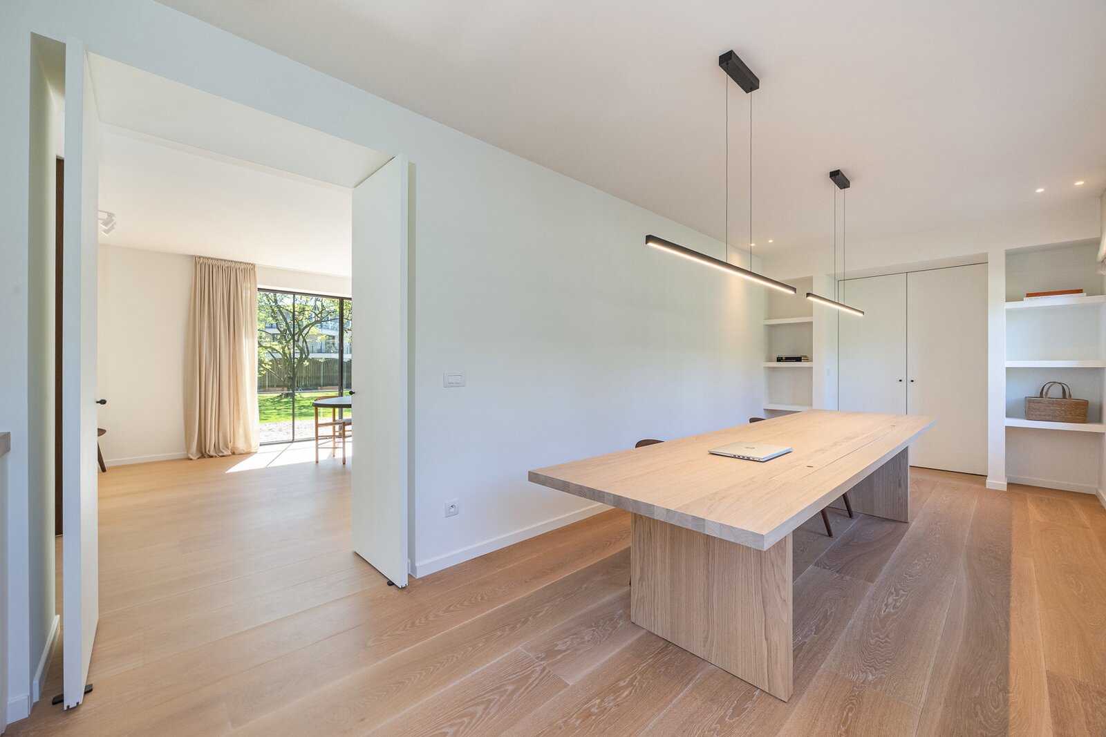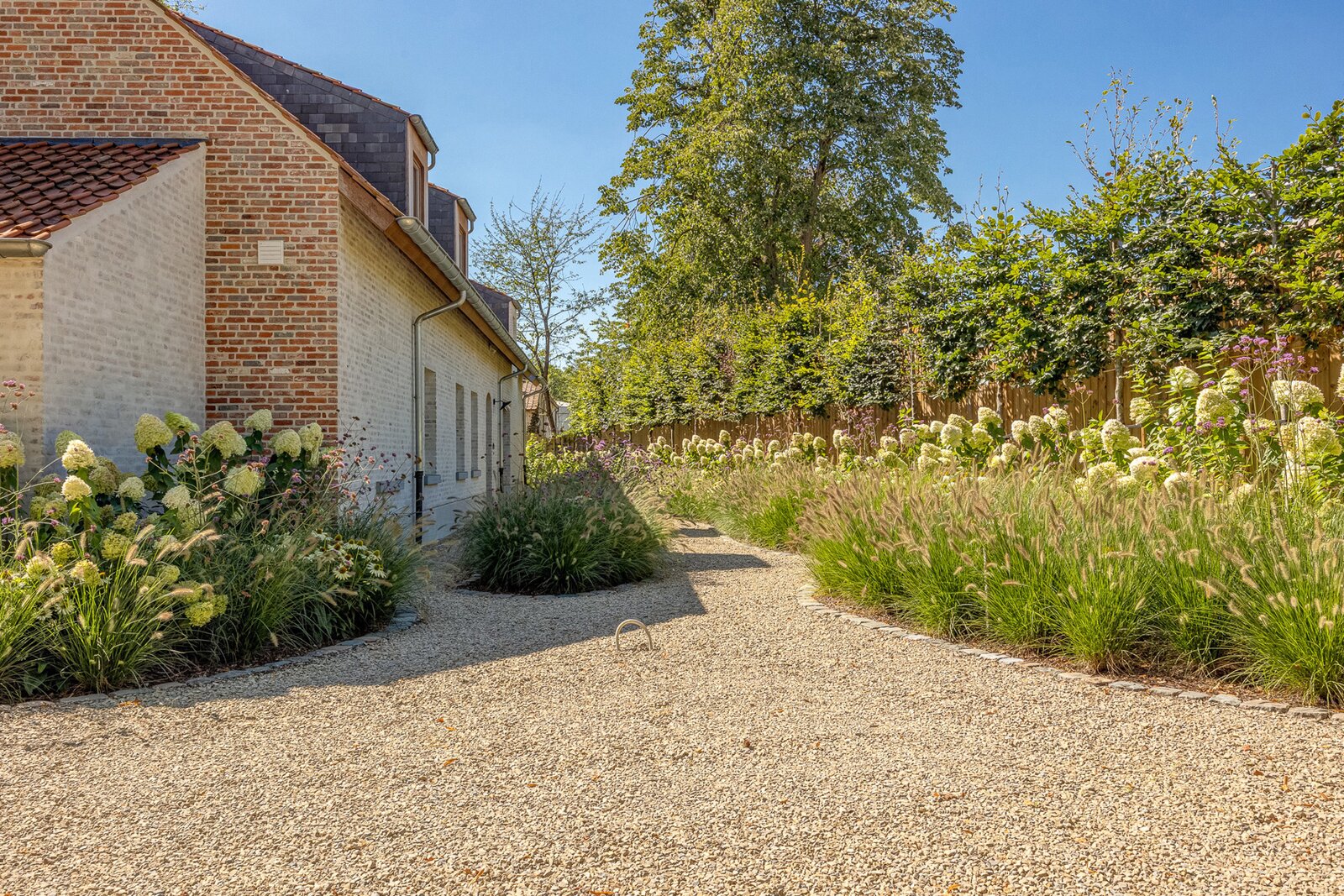 Buiten kan je genieten van een riant terras van 60 m² en een fraai aangelegde zuid tuin met beregeningssysteem en voorzieningen voor tuinverlichting en automatische toegangspoort.