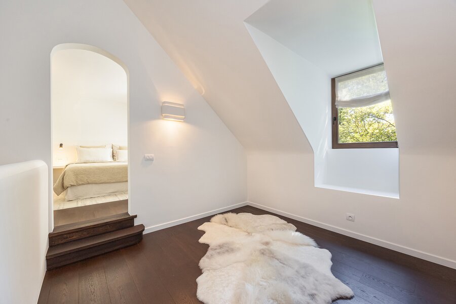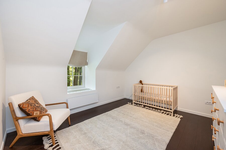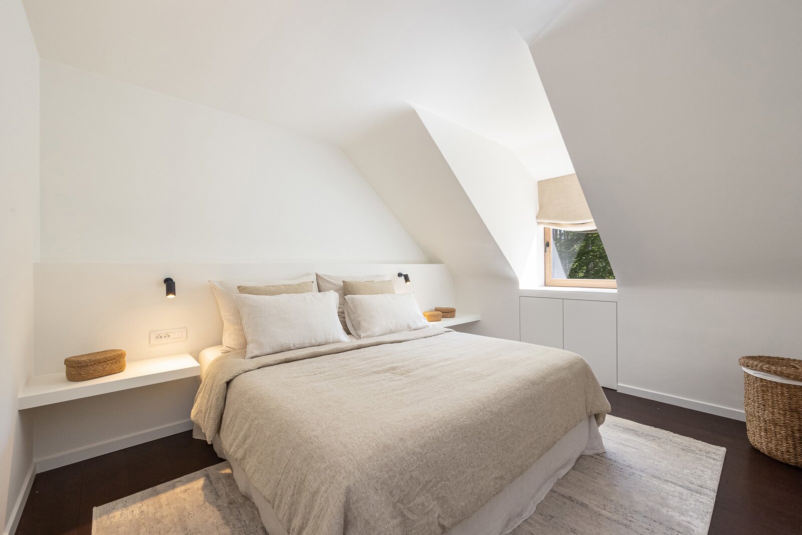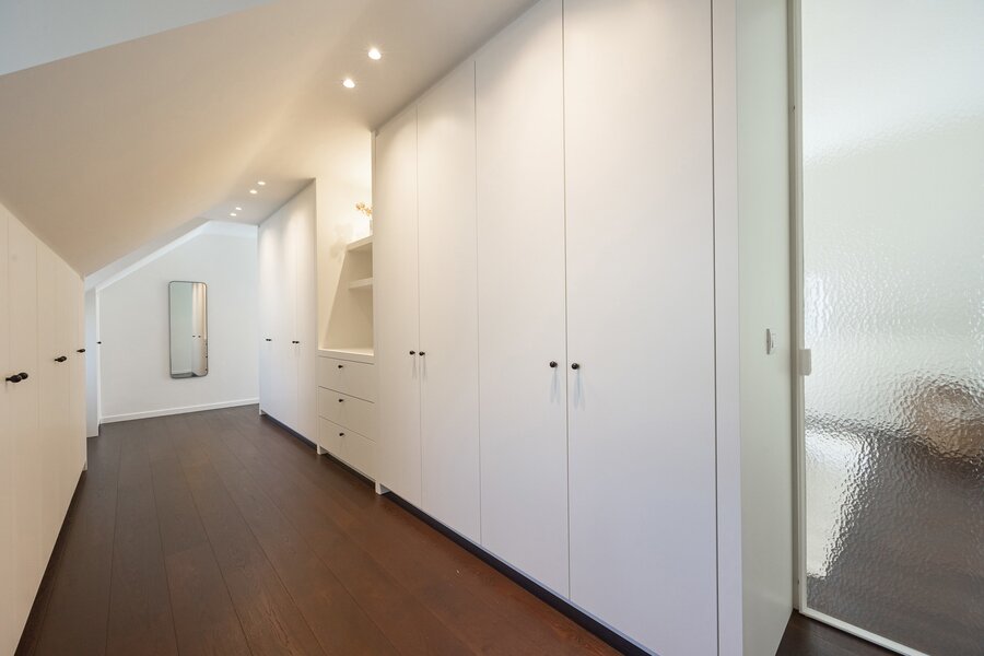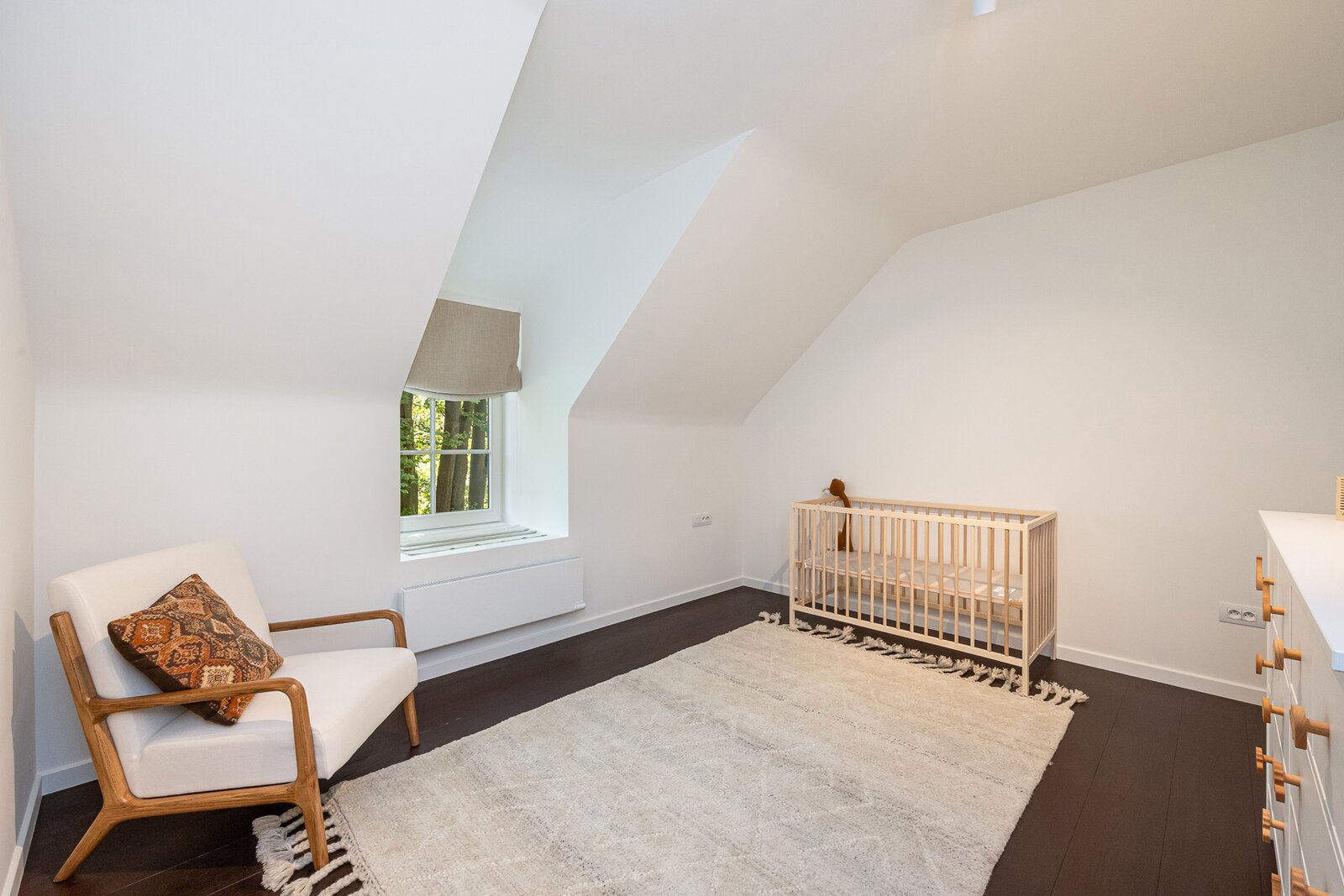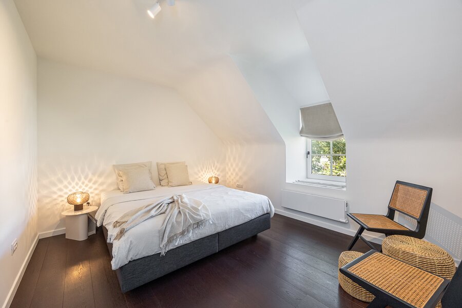Op de eerste verdieping leidt de overloop van 21 m² op parket naar een nachttoilet en een handige berging. De hoofdslaapkamer van 17 m² op parket heeft een ensuite dressing van 26 m² en een luxueus ingerichte badkamer van 16 m² in Mortex met ligbad, inloopdouche en een dubbel lavabomeubel. De tweede slaapkamer van 16 m² op parket beschikt over een eigen badkamer van 5 m² eveneens in Mortex met inloopdouche en lavabomeubel. Tot slot is er nog een derde slaapkamer van 16 m² op parket.