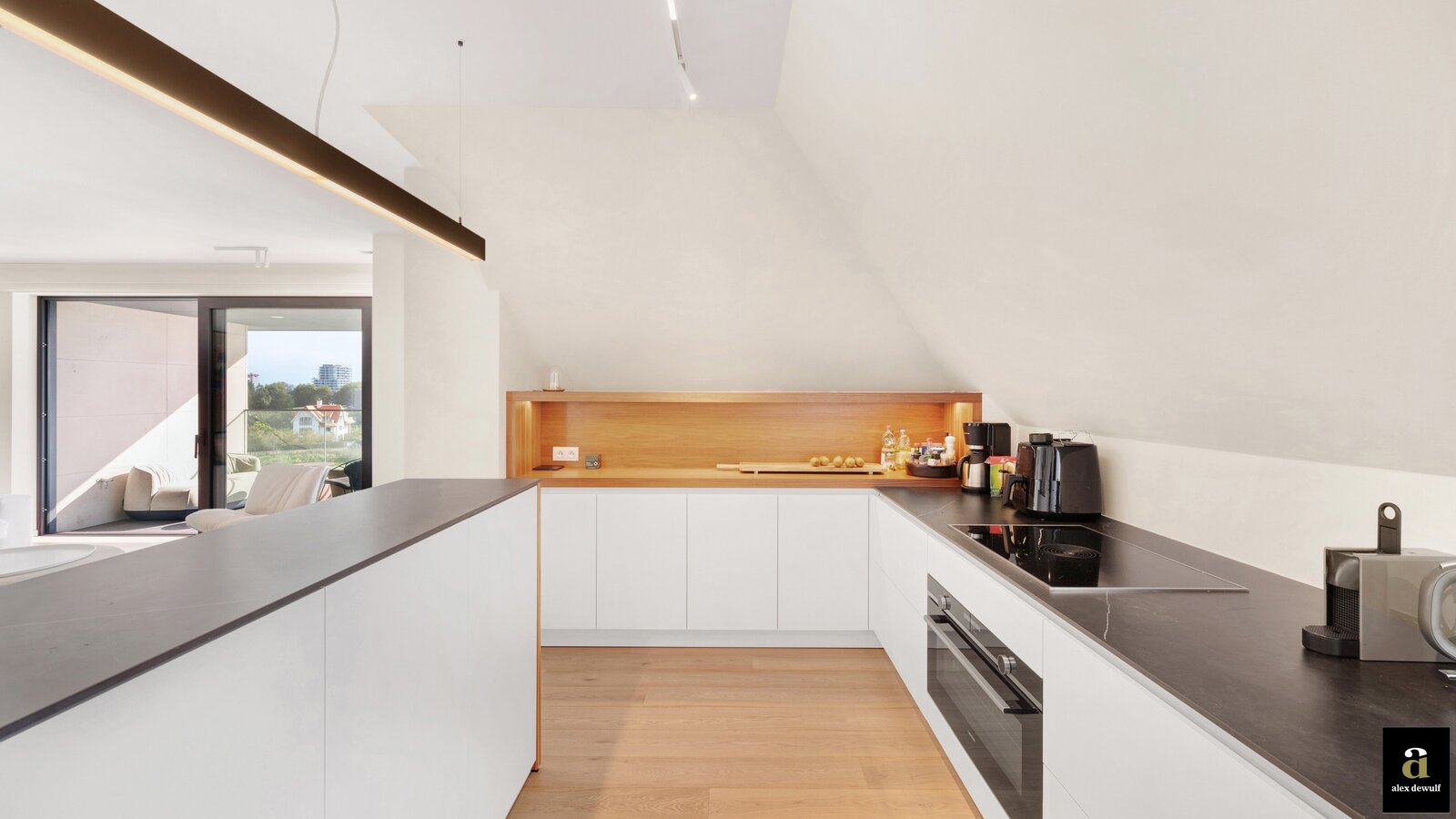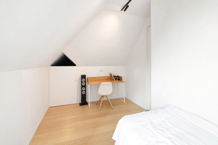 The entrance leads to a large, south-facing living room (approx. 50 m²) with a study corner, opening onto a comfortable 11 m² terrace. The terrace is also south-facing, offering a stunning view of the Zegemeer Lake and the surrounding villas. It is partially covered and offers great privacy due to its corner location.