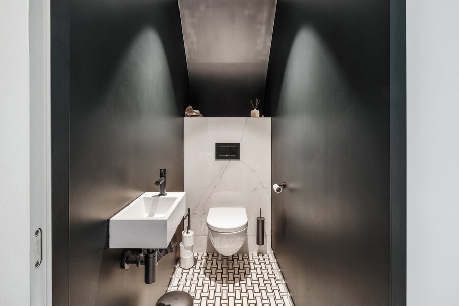 Spacious entrance hall with a built-in wardrobe, storage room with connections for a washing machine and dryer, and a guest toilet.