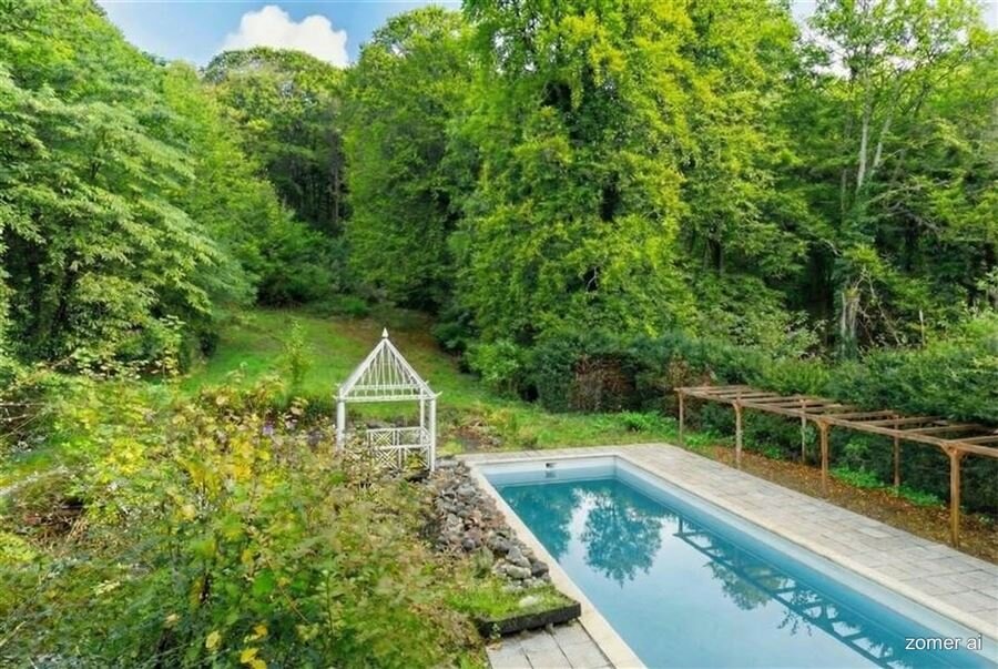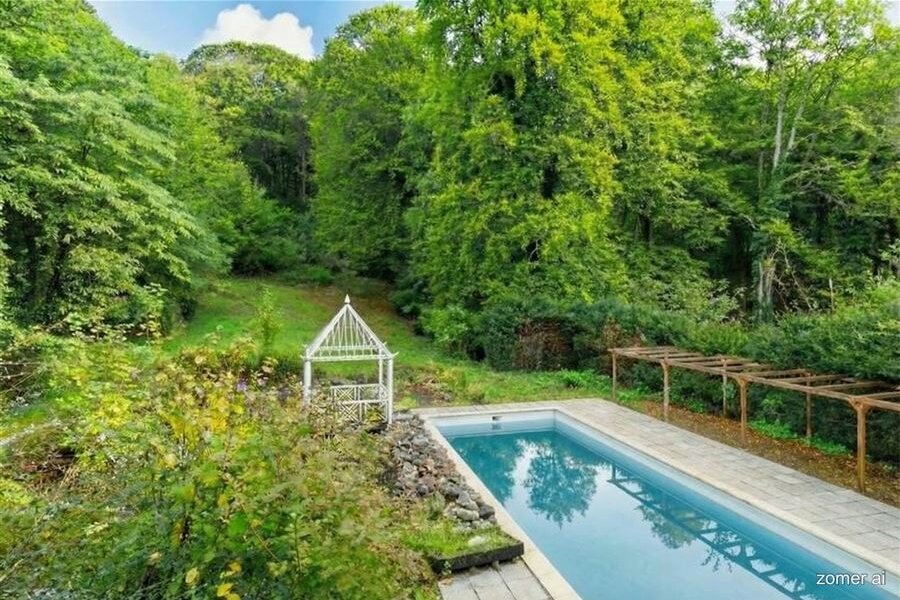 Binnen straalt de woning warmte en elegantie uit dankzij de houten balkenplafonds, parketvloeren, open haard en de grote raampartijen die het omringende groen tot in de leefruimtes brengen. Rondom de villa liggen verschillende terrassen, een zwembad, vijver en een charmante pergola, perfect om te genieten van elk seizoen.