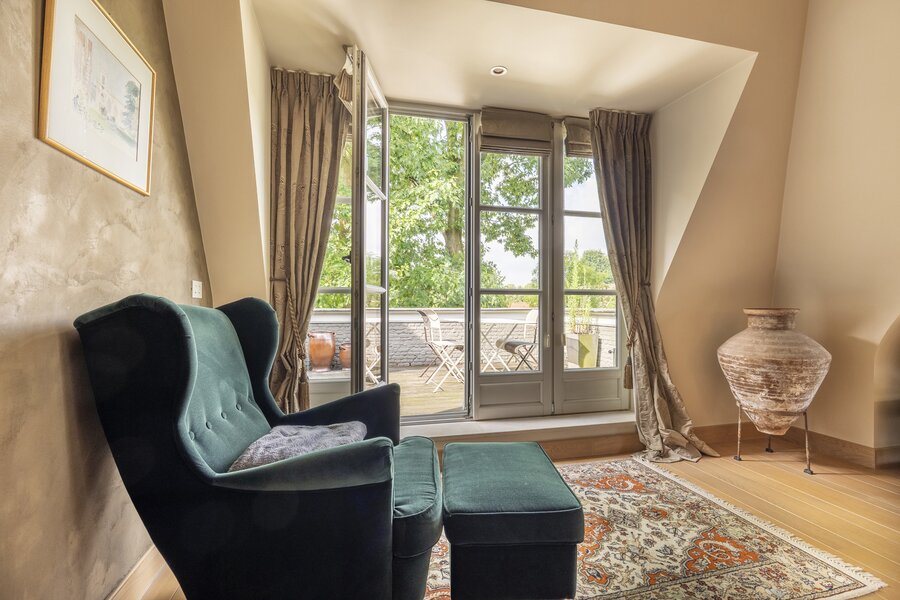 Welkom in dit uitzonderlijk penthouse dat luxe en comfort moeiteloos combineert, discreet gelegen op een residentieel domein met automatische toegangspoort. De privatieve toegang via lift of trap zorgt voor volledige privacy en exclusiviteit.
