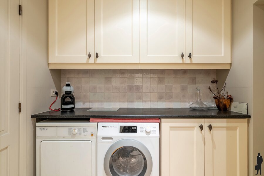 De open leefkeuken, volledig geïnstalleerd met hoogwaardige toestellen vormt het hart van de woning. Dit alles op parketvloeren.