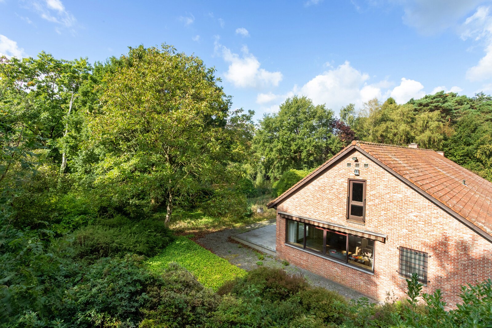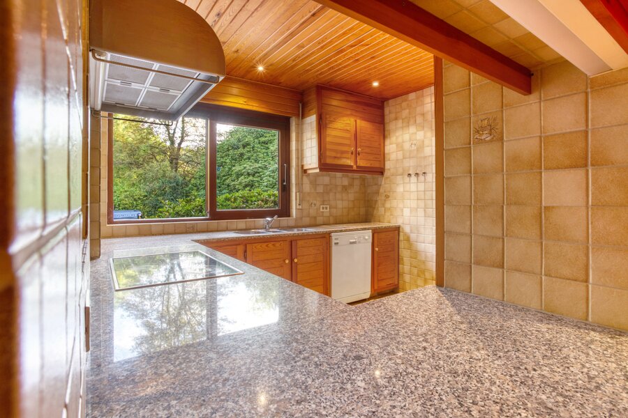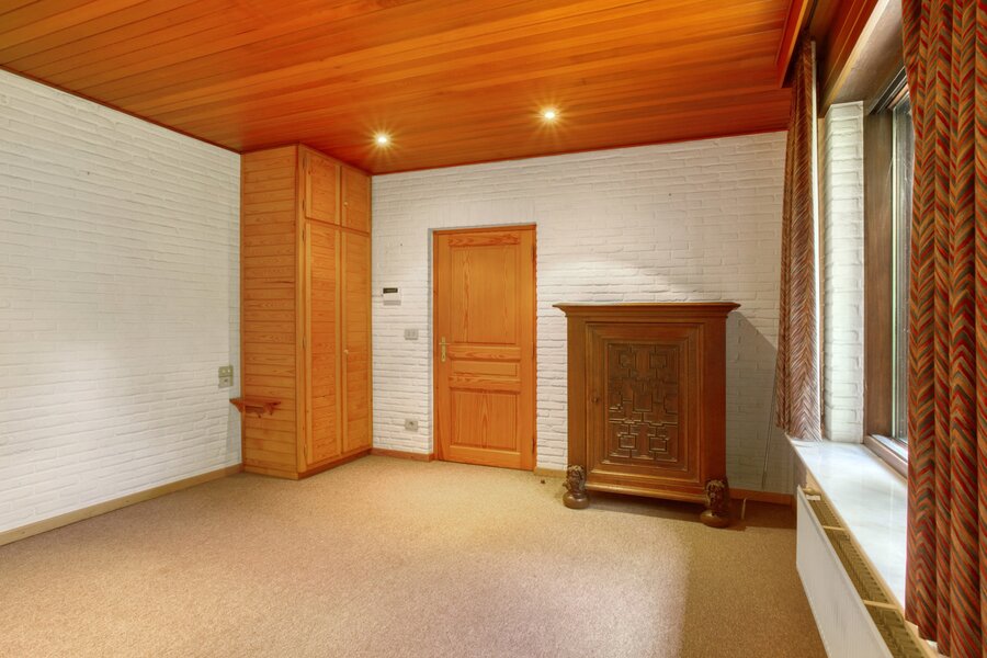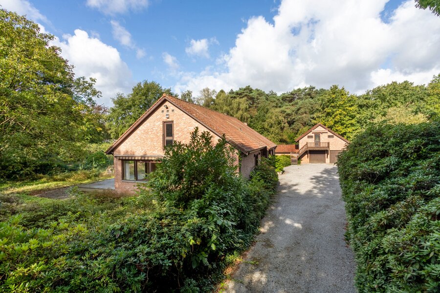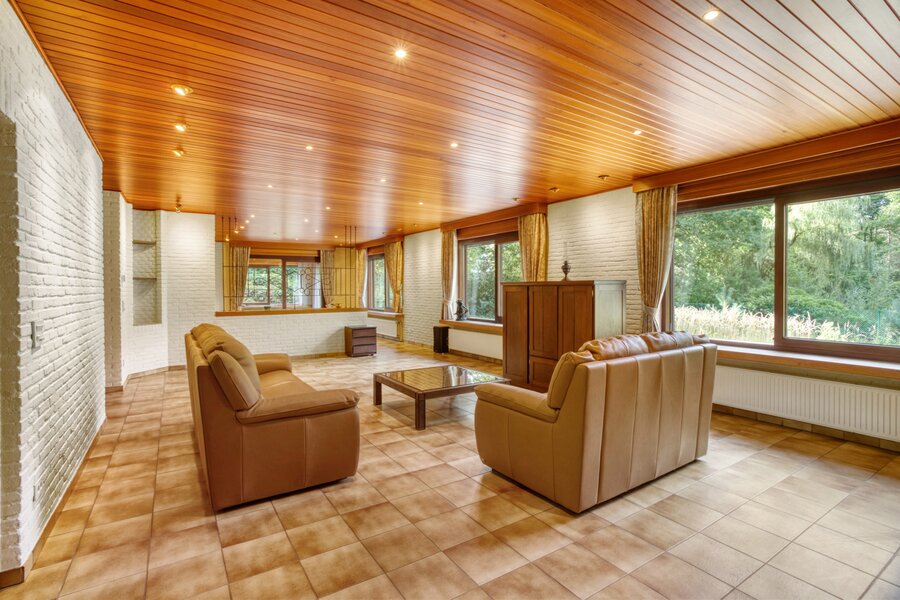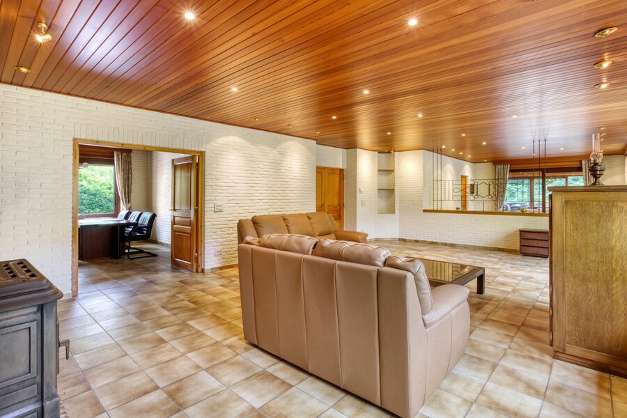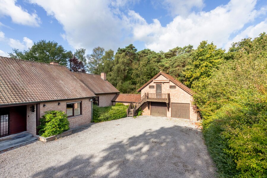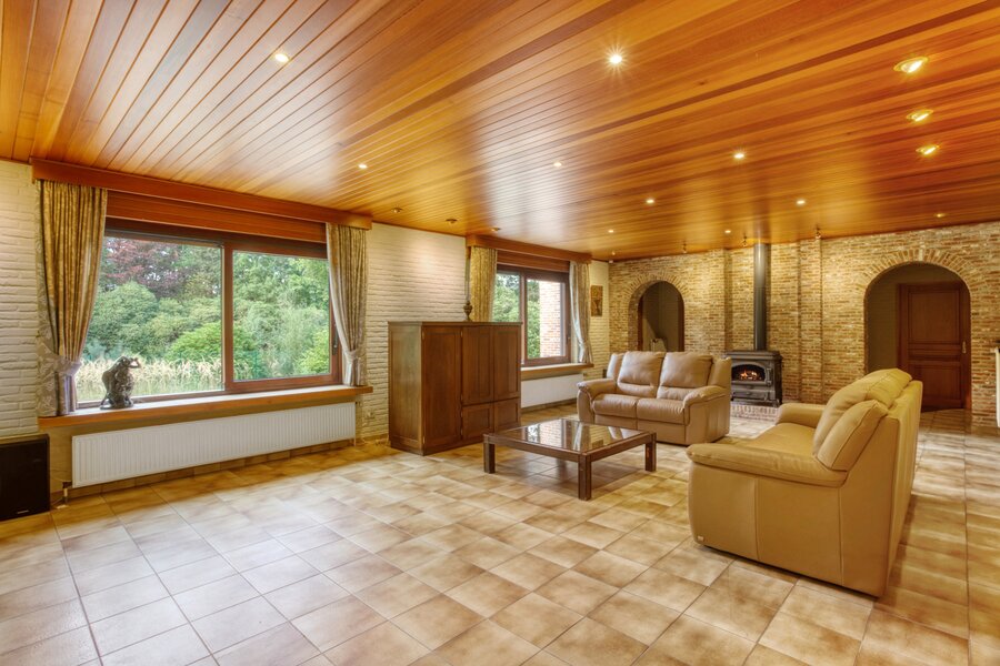 Een uitgestrekte private gebogen oprit brengt ons tot aan de villa met veel privacy. Deze is toegankelijk via een ruime inkomhal met toegang naar zowel de keuken, de woonruimte als tot de bureauruimte of extra slaapkamer. De zeer ruime woonkamer geeft een prachtig panoramisch zicht over de tuin met vijver door het gebruik van grote ramen achteraan. Deze ruimte is ook voorzien van een gezellige houtkachel.