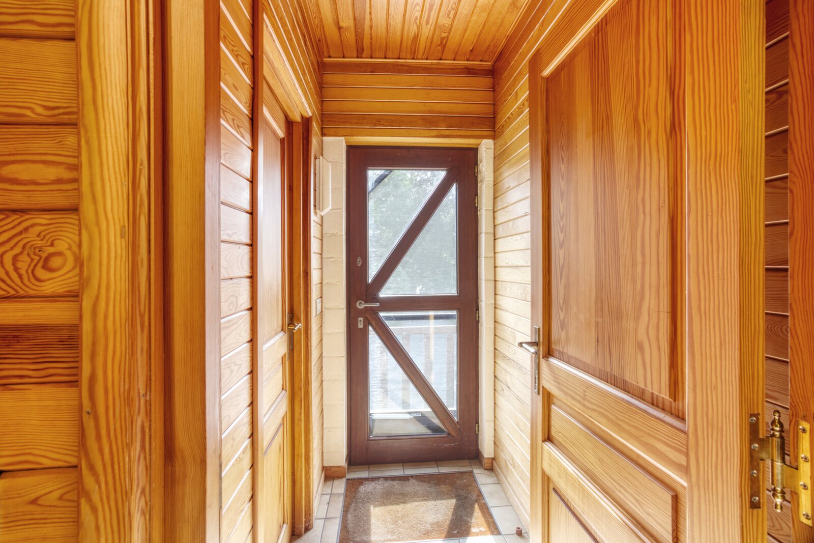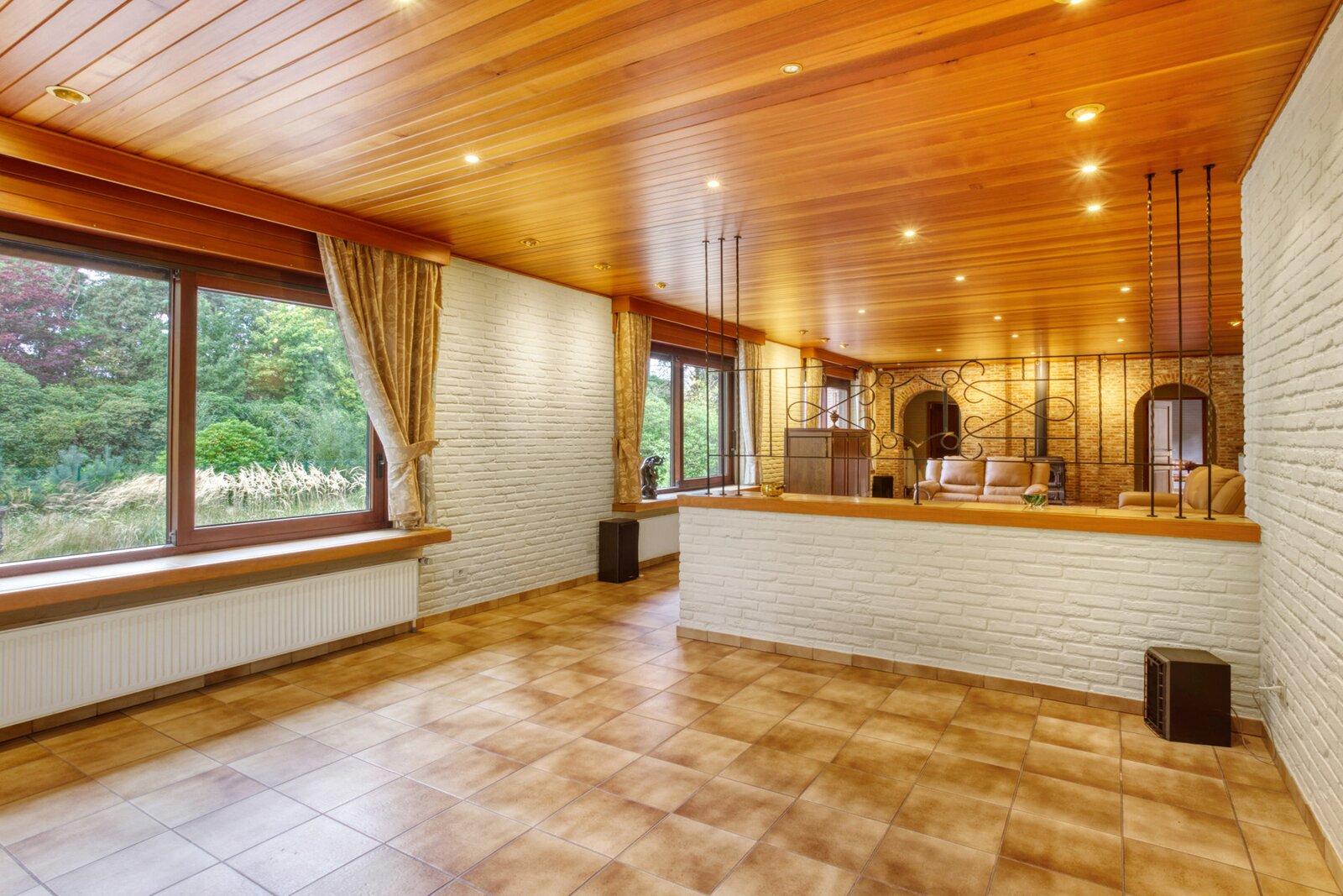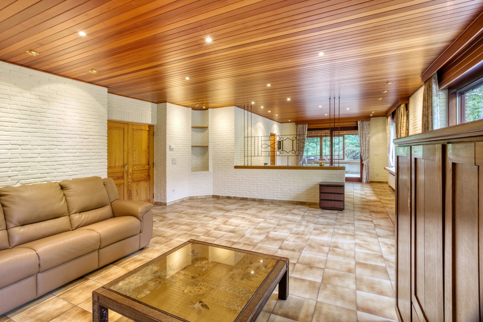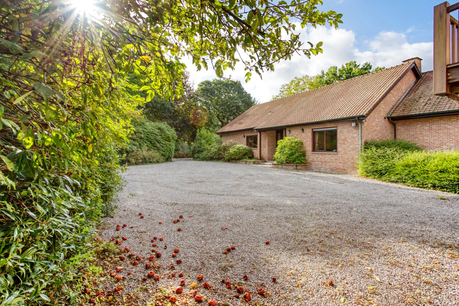 Een uitgestrekte private gebogen oprit brengt ons tot aan de villa met veel privacy. Deze is toegankelijk via een ruime inkomhal met toegang naar zowel de keuken, de woonruimte als tot de bureauruimte of extra slaapkamer. De zeer ruime woonkamer geeft een prachtig panoramisch zicht over de tuin met vijver door het gebruik van grote ramen achteraan. Deze ruimte is ook voorzien van een gezellige houtkachel.