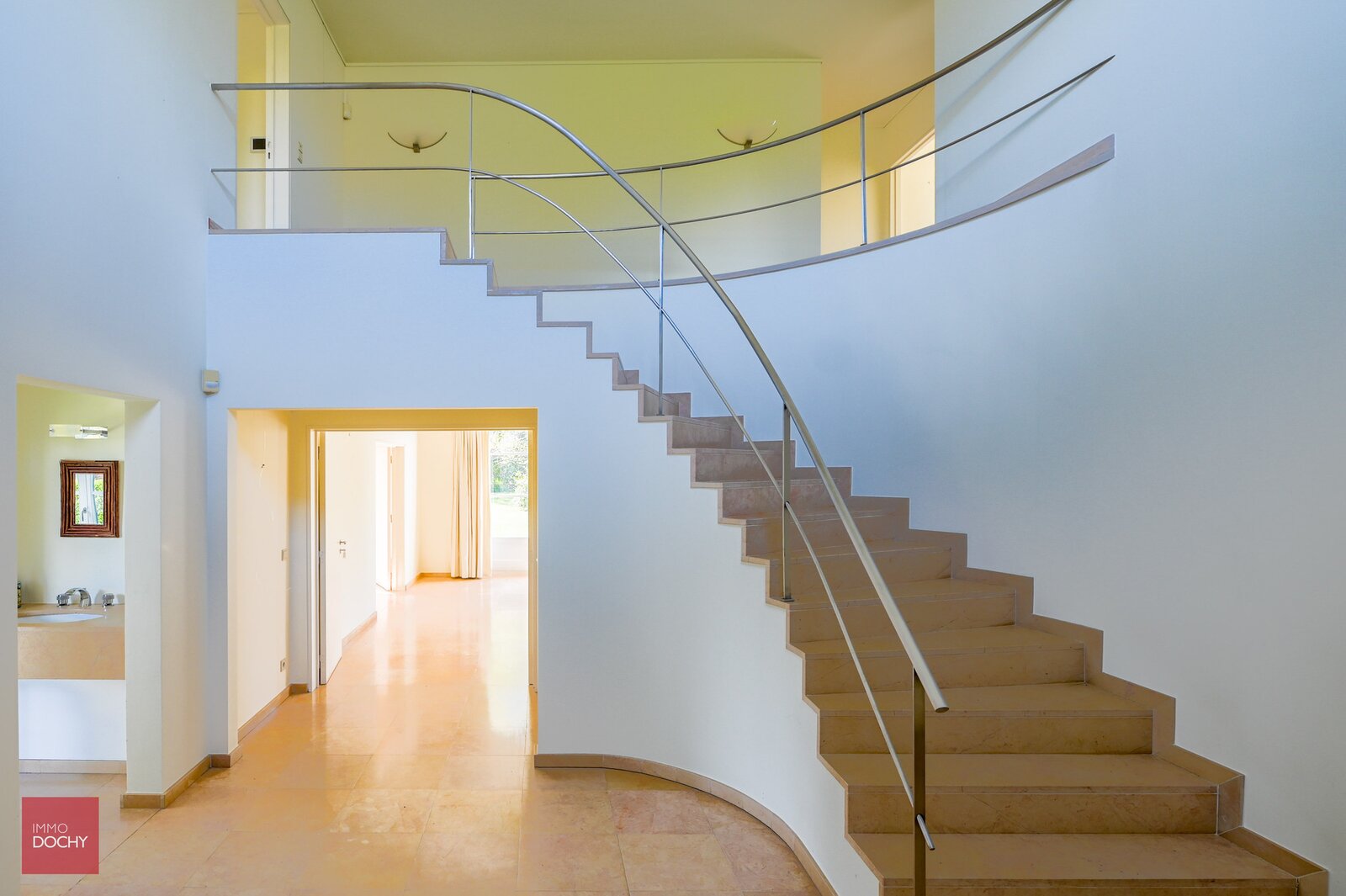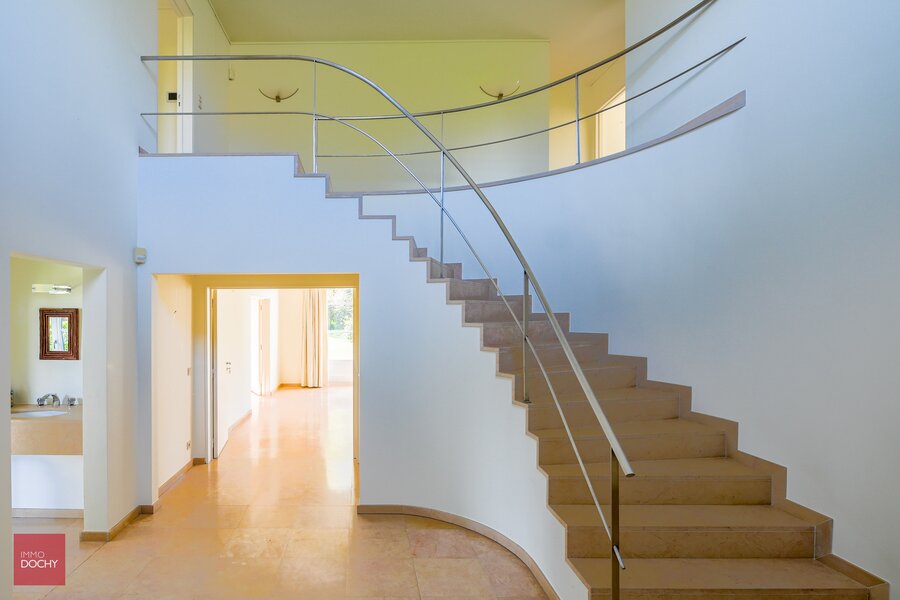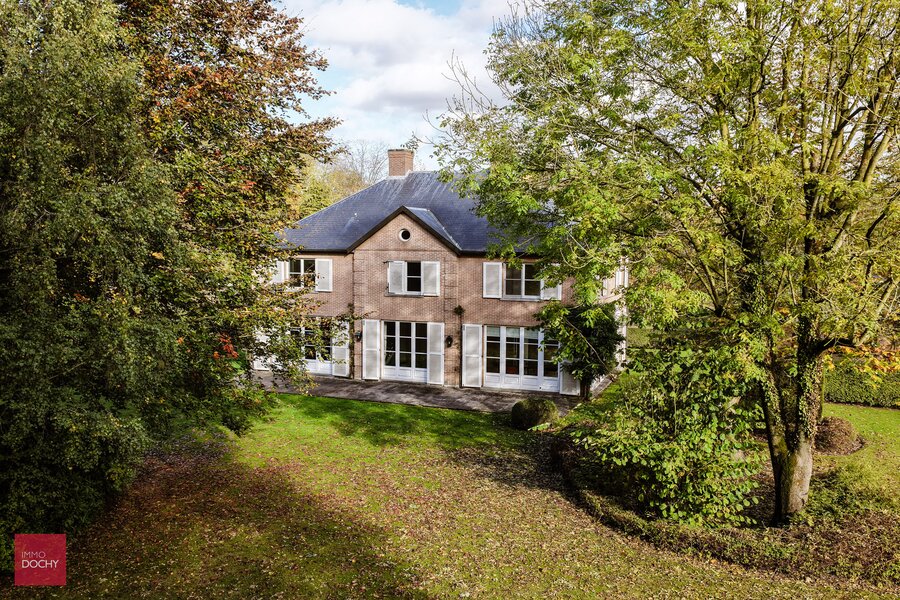 Bestaande uit ruime inkomhal , gastentoilet , vestiaire, bureel (eventueel gelijkvloerse slaapkamer), geïnstalleerde keuken en ruime leefruimte met open haard en eetplaats. Op het verdiep bevinden zich 4 slaapkamers met dressing en 3 badkamers. Ruime kelder, zolder en dubbele garage. Zongerichte tuin op heel mooi perceel van 3.348m².