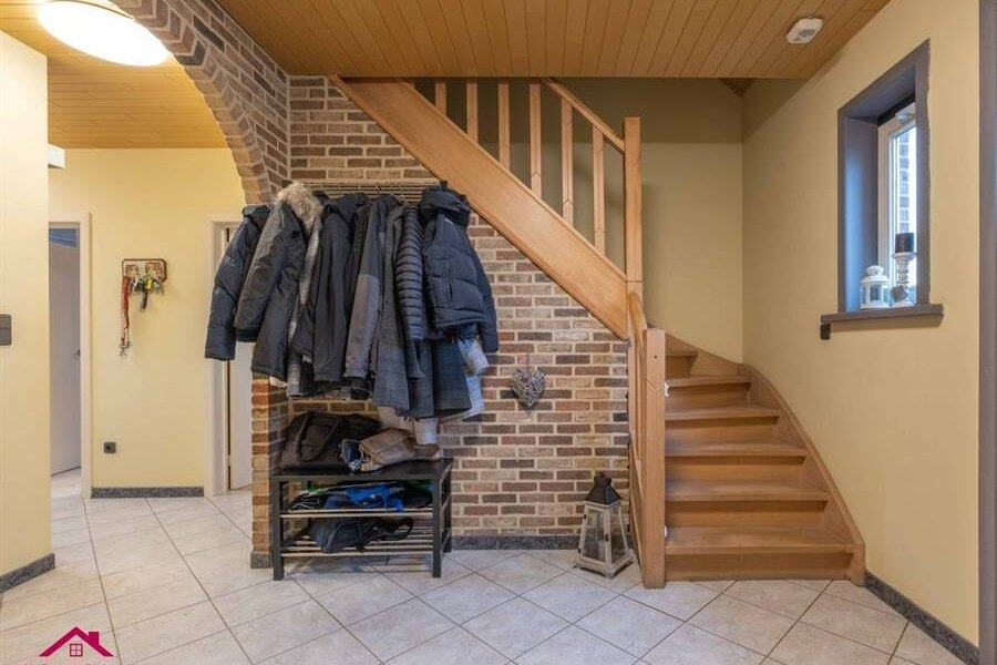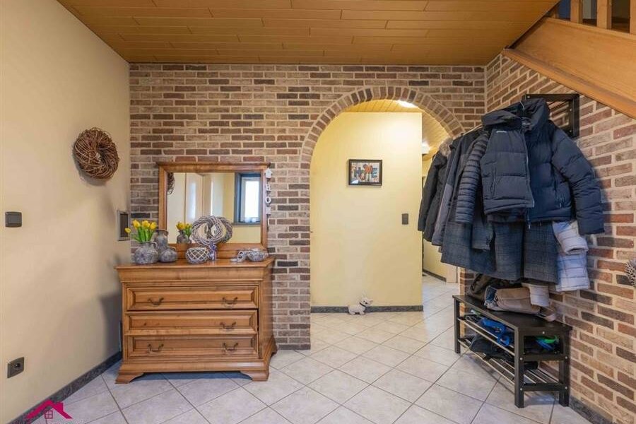 - Inkomhal met toegang tot de verschillende vertrekken en trap naar bovenverdieping. Voldoende ruimte voor vestiaire. Keramische tegelvloer.