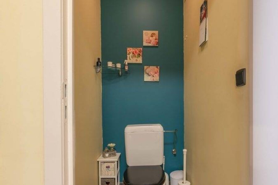 - Landelijk ingerichte badkamer, uitgerust met: badkamermeubel met dubbele lavabo, spiegelkast met verlichting, ligbad, toilet en inloopdouche. De muren werden tot bepaalde hoogte afgewerkt met houten lambrisering. Velux raam. Keramische tegelvloer.