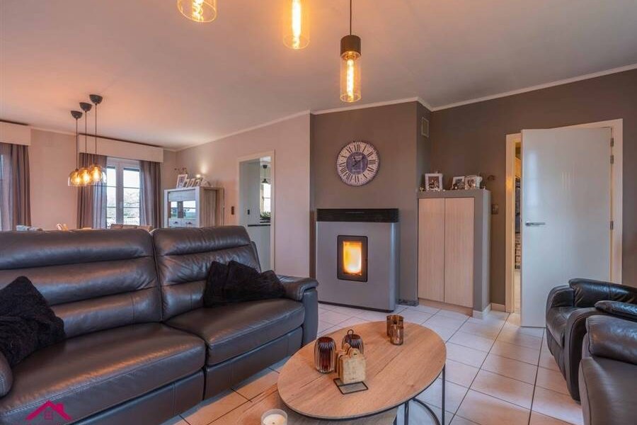 - Gezellige leefruimte met pelletkachel. Voldoende plaats voor het inrichten van een zit- en eethoek. De vele raampartijen aan de voor-, zij- en achtergevel zorgen voor veel lichtinval. TV- en telefoonaansluiting. Toegang tot de keuken. Keramische tegelvloer.