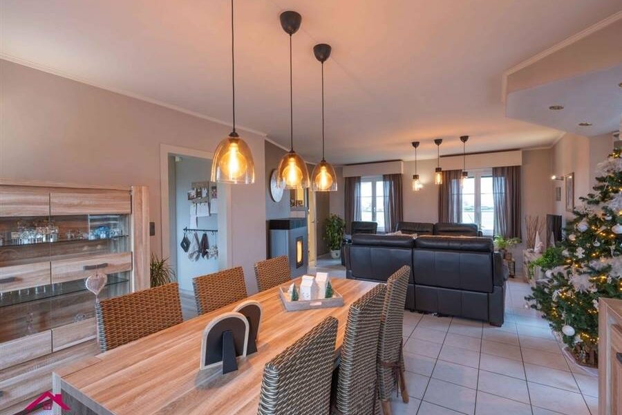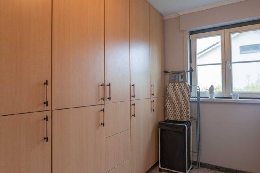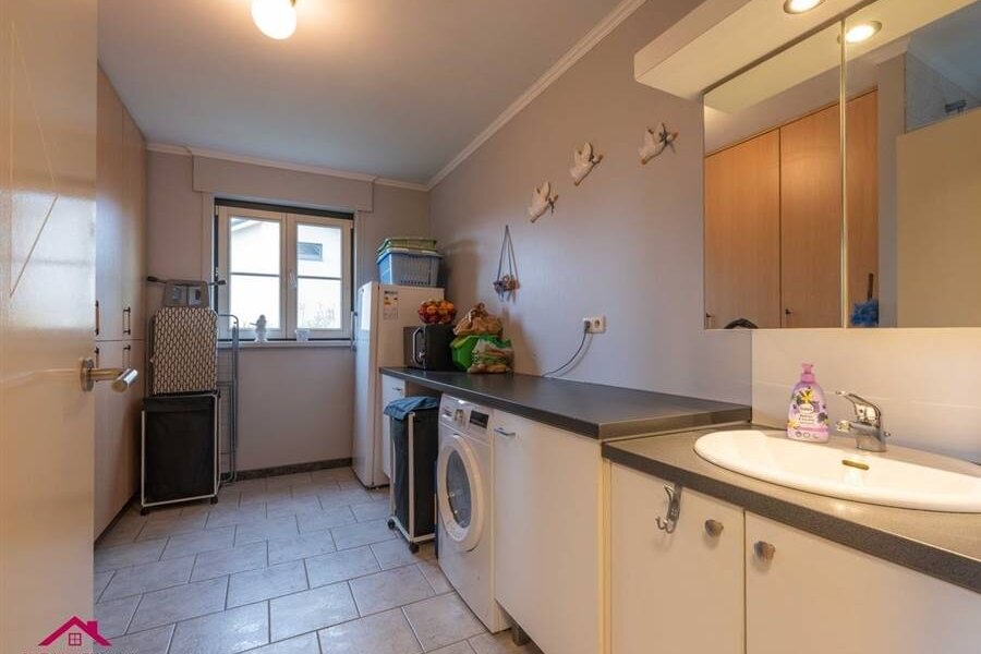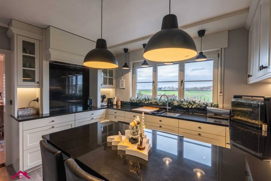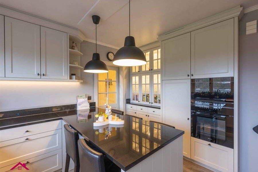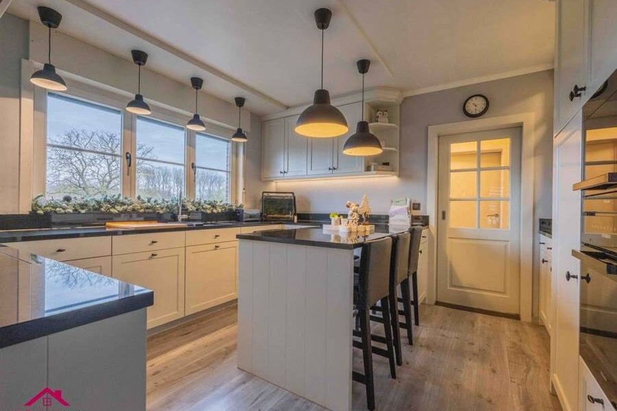 - Mooi geïnstalleerde keuken met vaste eettafel, voorzien van een granieten werkblad. Aanwezige toestellen: inductie kookplaat, afzuigkap, ingebouwde combi-oven en hogedruk stoomoven, koelkast, vaatwasser en een inox spoelbak met kraanwerk. Voldoende opbergmogelijkheden. Laminaat vloer. Toegang tot de achterinkom.