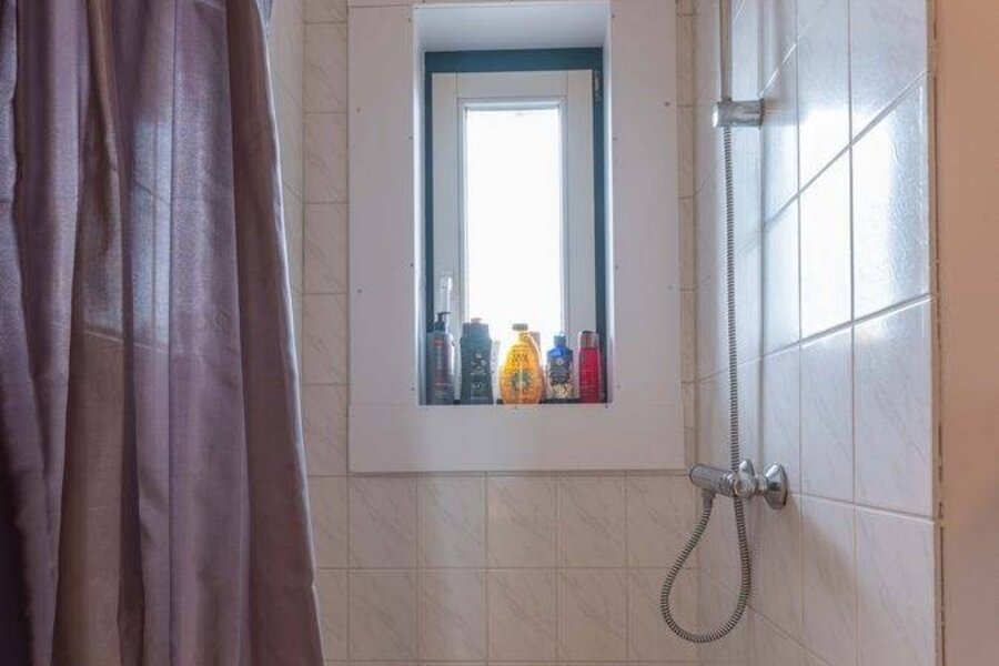 - Wasplaats met vaste kastenwand. Aansluiting voor wasmachine. Uitgietbak met warm en koud water. Douche. Keramische tegelvloer.
