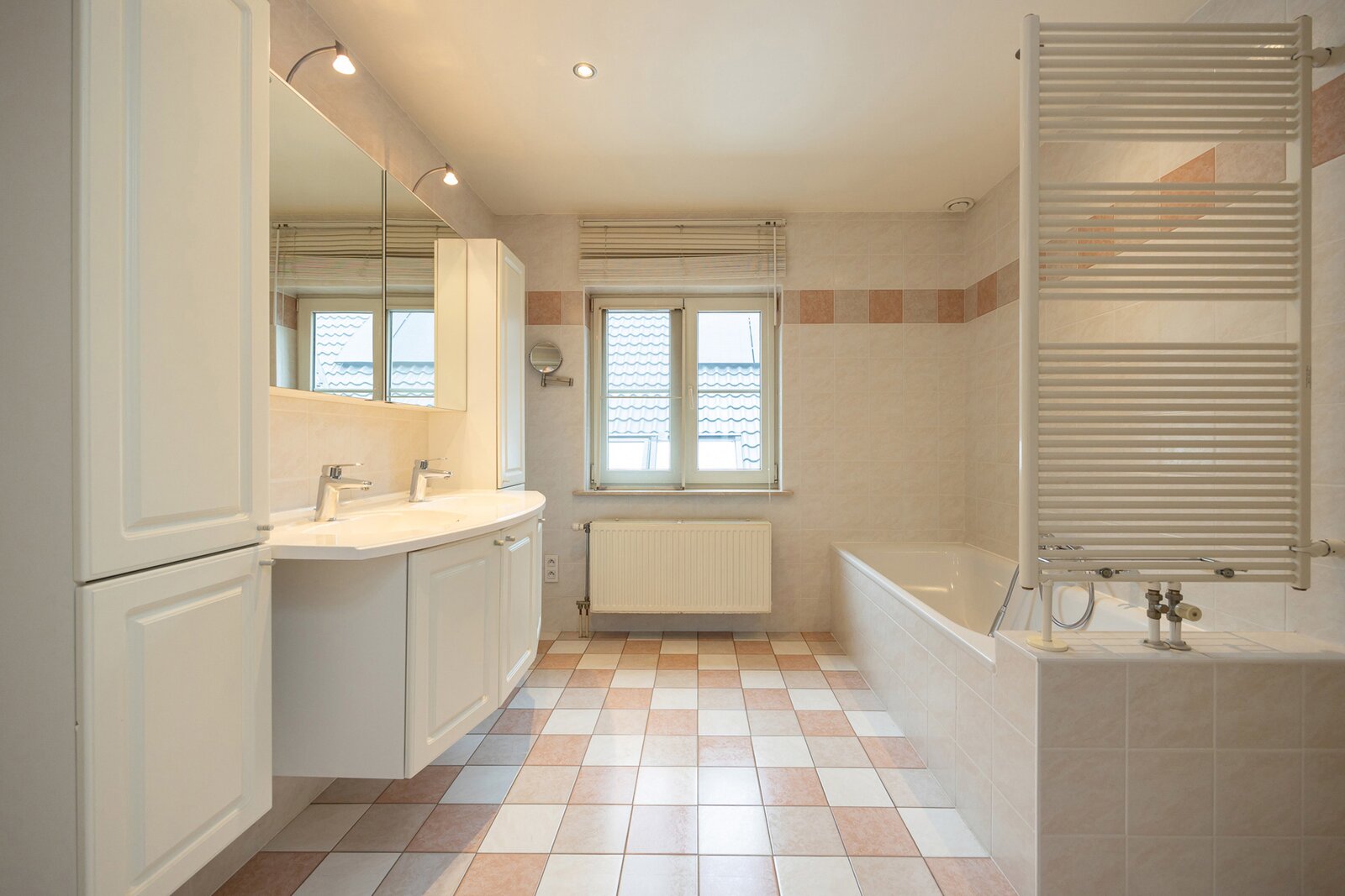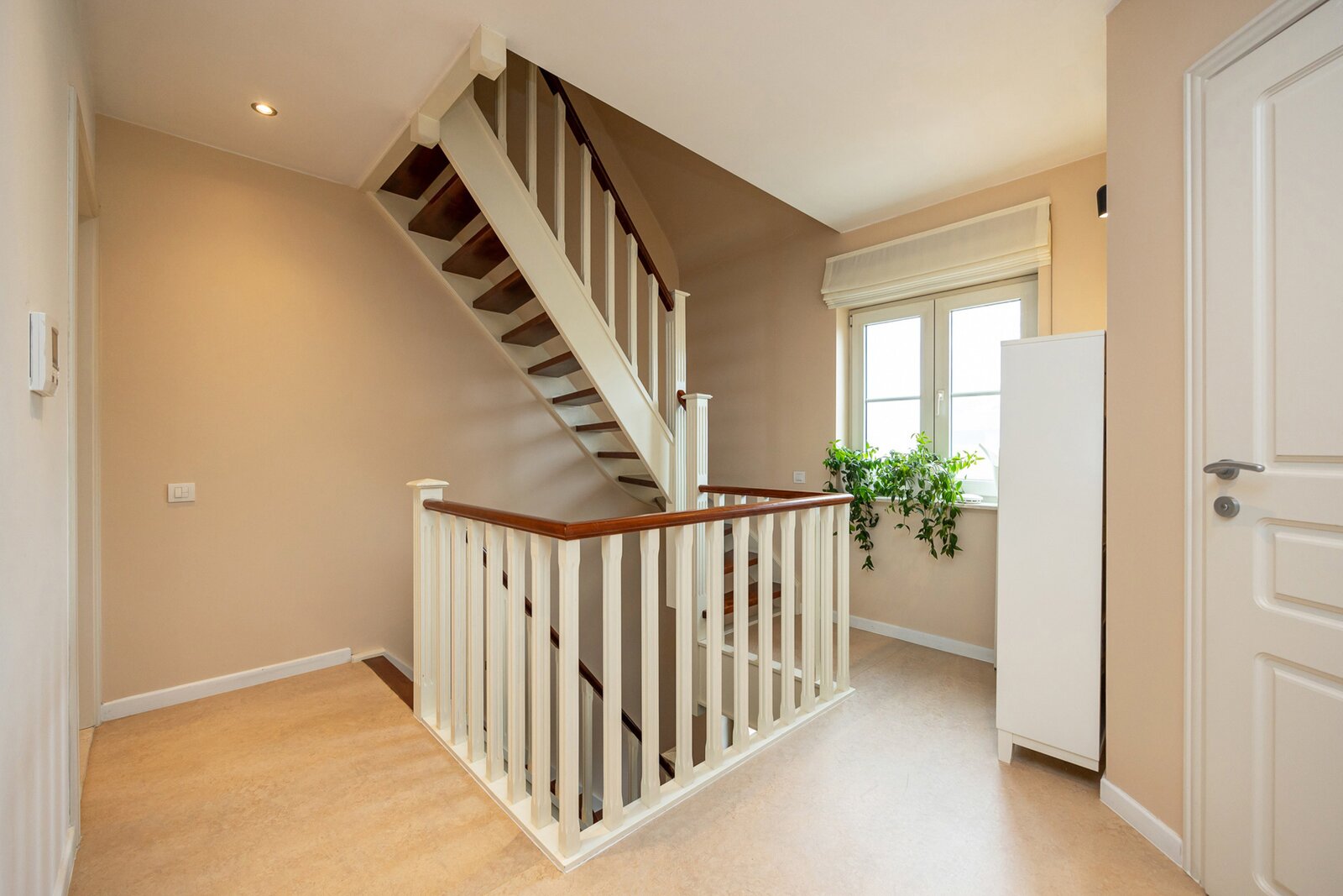 Inkomhal met gastentoilet en ruimte voor vestiaire, ruime woonkamer met veel lichtinval, geïnstalleerde keuken, ruime bergruimte met aansluiting voor wasmachine en droogkast, een dubbele garage voorzien van een automatische poort. Vanuit de woonkamer heb je nog rechtstreekse toegang tot een ruime veranda met een prachtig uitzicht over de mooi aangelegde tuin. Op de eerste verdieping bevinden er zich 3 volwaardige slaapkamers, waarvan een masterbedroom met rechtstreekse toegang tot de badkamer, twee ruime kinderkamers en een apart toilet op de nachthal. Op de tweede verdieping bevindt er zich een ruime zolderruimte, toegankelijk via een vaste trap.