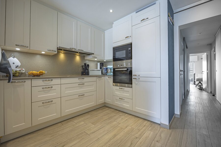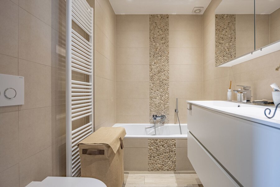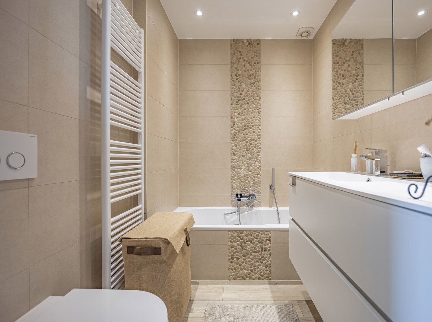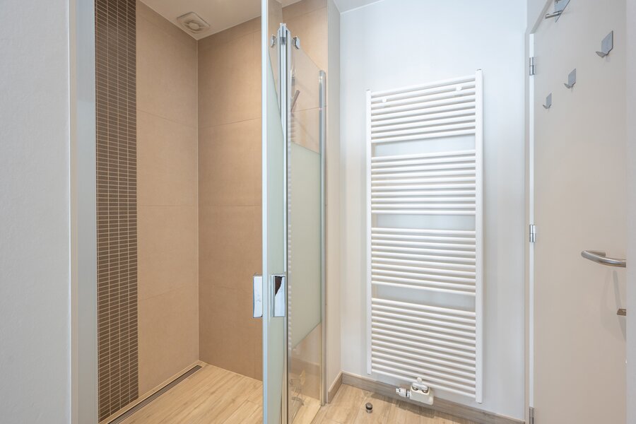 The apartment has three comfortable bedrooms, one of which has its own shower. Each room has its own washbasin. In addition, there is a modern bathroom, a separate guest toilet and a practical storage/laundry room.