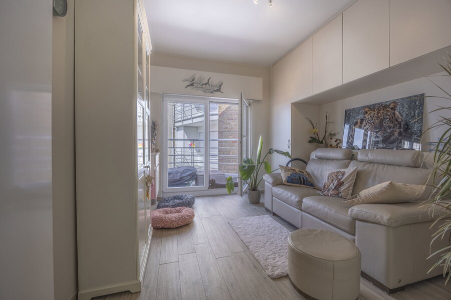 This stylishly renovated apartment is located in a prime location near Albertstrand beach and offers a side view of the sea. The entrance hall with cloakroom leads to a spacious, light-filled living room with an open view and a fully equipped open kitchen.
