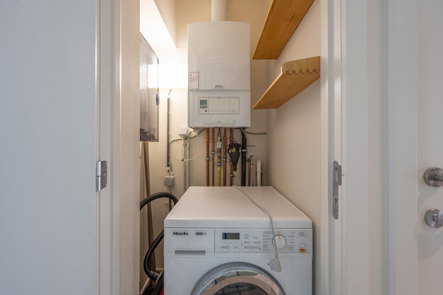 At the rear, there is a sunny, south-facing terrace that provides extra outdoor space. The building has a basement and bicycle storage. There is also a concierge.