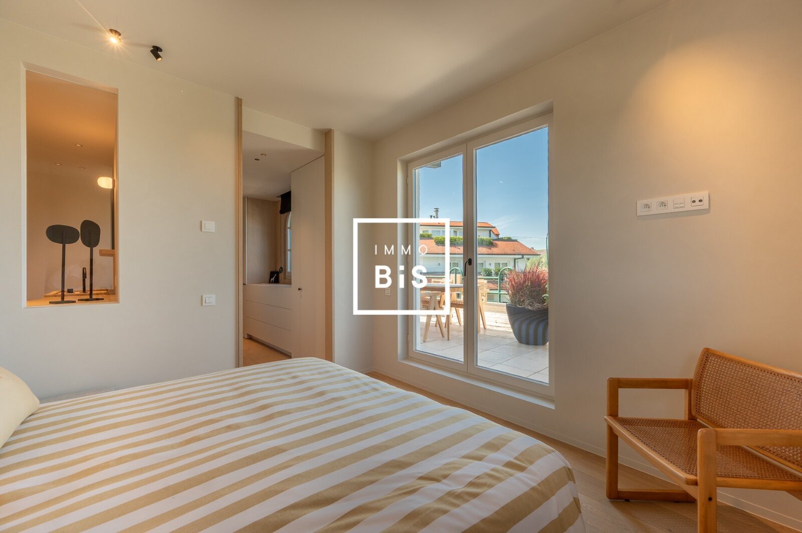 De hoofdslaapkamer beschikt over een eigen luxueuze badkamer en directe toegang tot een ruim terras. Daarnaast zijn er twee extra slaapkamers, elk uitgerust met een praktische douchekamer.