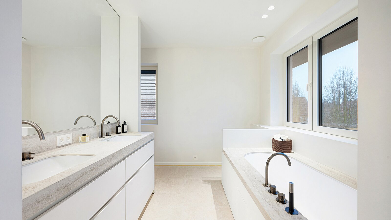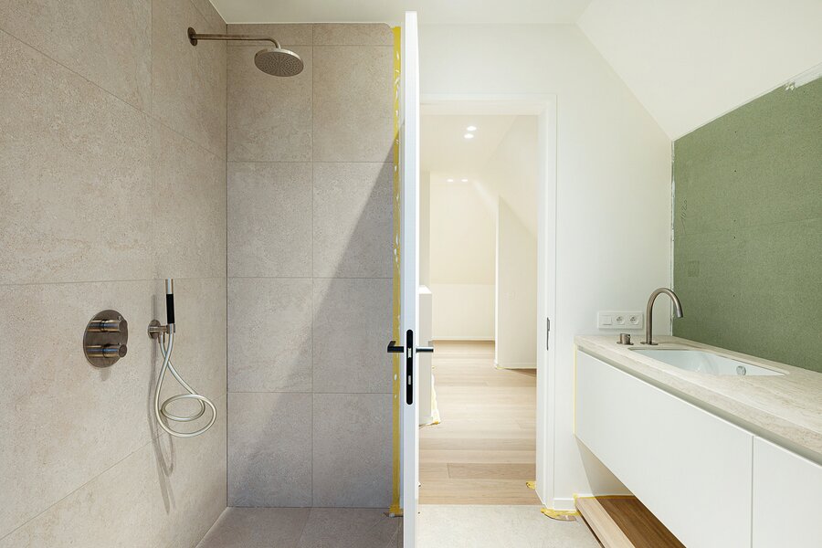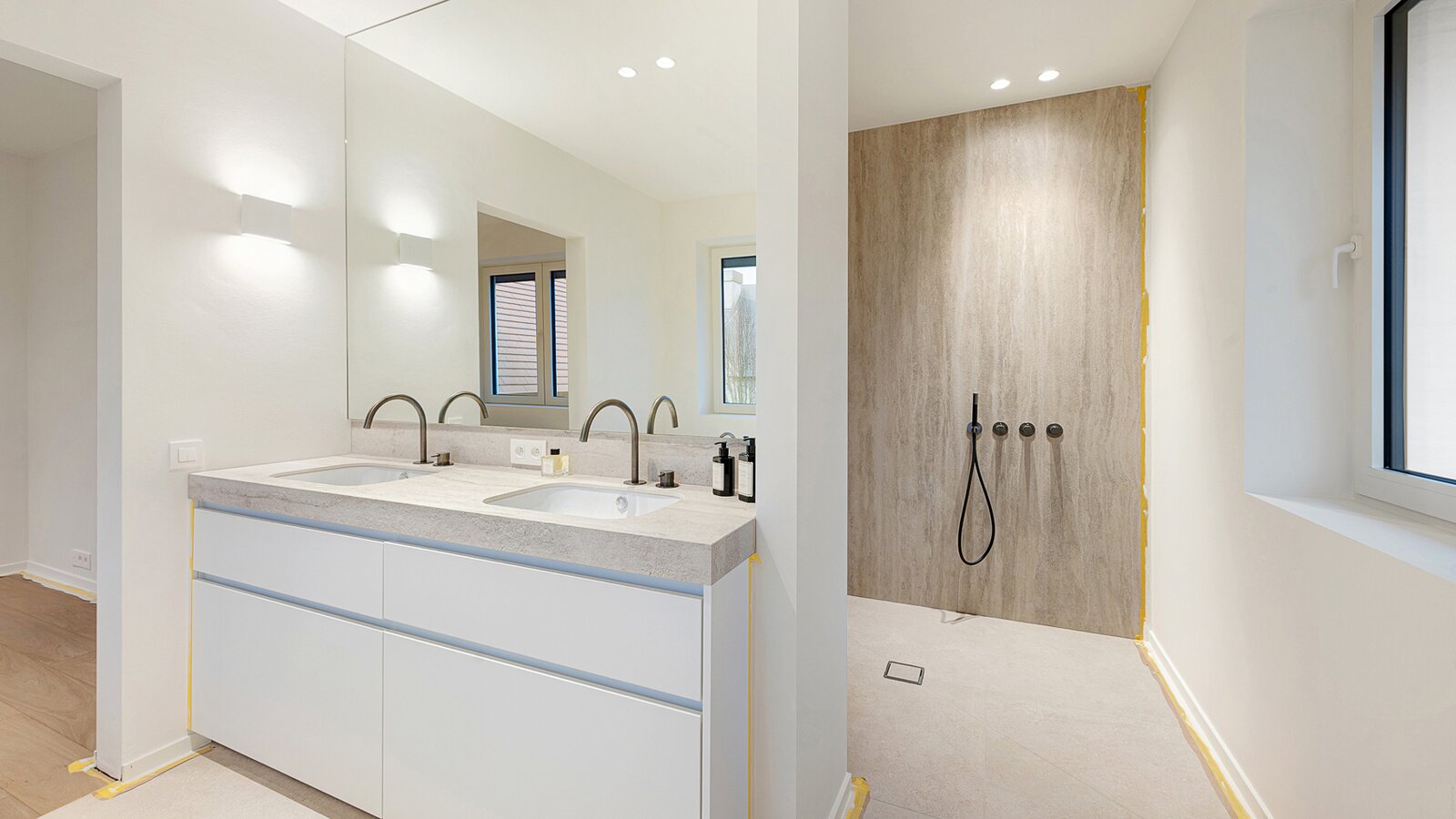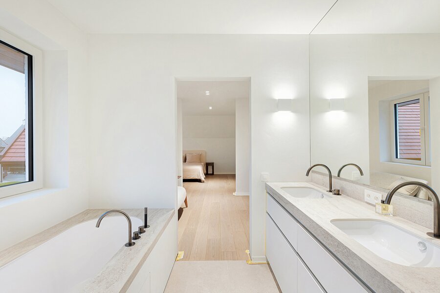Villa neuve bénéficiant d'une orientation parfaite à une situation calme. Composition : Entrée avec vestiaire et toilette séparée. Agréable et vaste cuisine avec coin à manger. Grand séjour et salle à manger, tous ouvrant sur terrasse et jardin. Au 1er étage : Master bedroom avec dressing et salle de bains. 2 chambres à coucher bien proportionnées, 2 salles de douche. Buanderie. Toilette. Deuxième étage: 2 chambres à coucher. 1 salle de douche. Finitions luxueuses. Garage spacieux et parking extérieur pour 3 voitures. Inspection des plans et cahier des charges, après rendez-vous en nos bureaux.