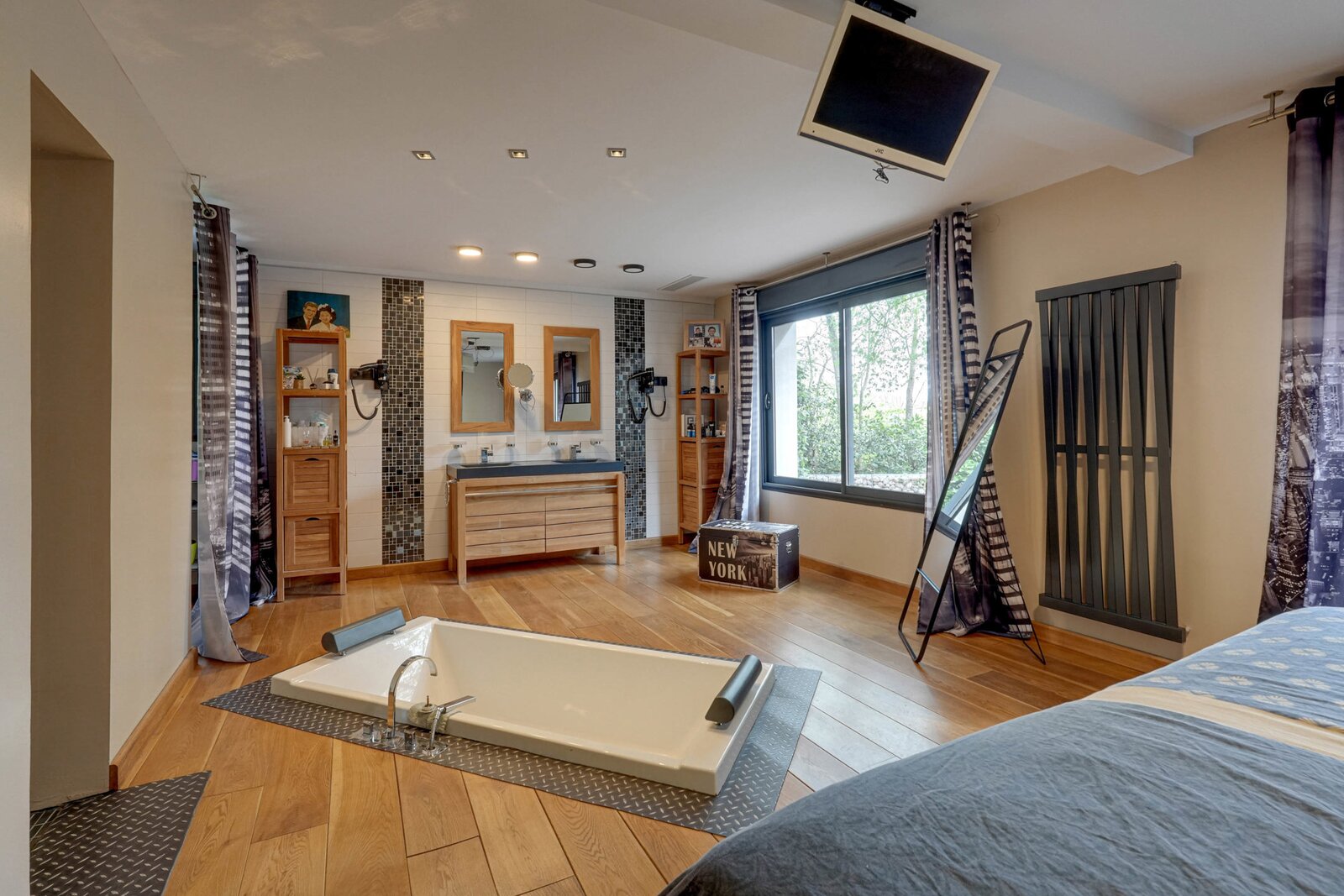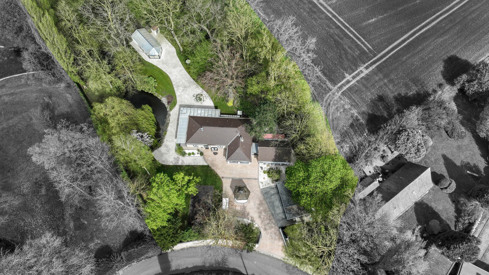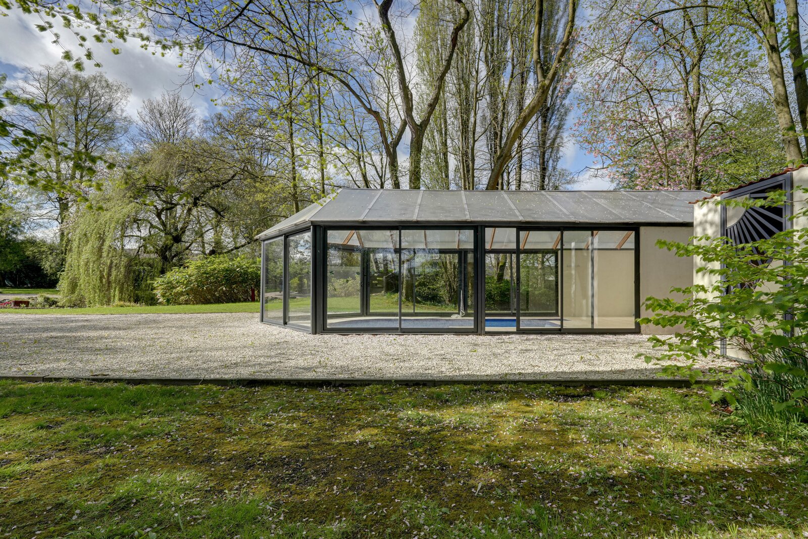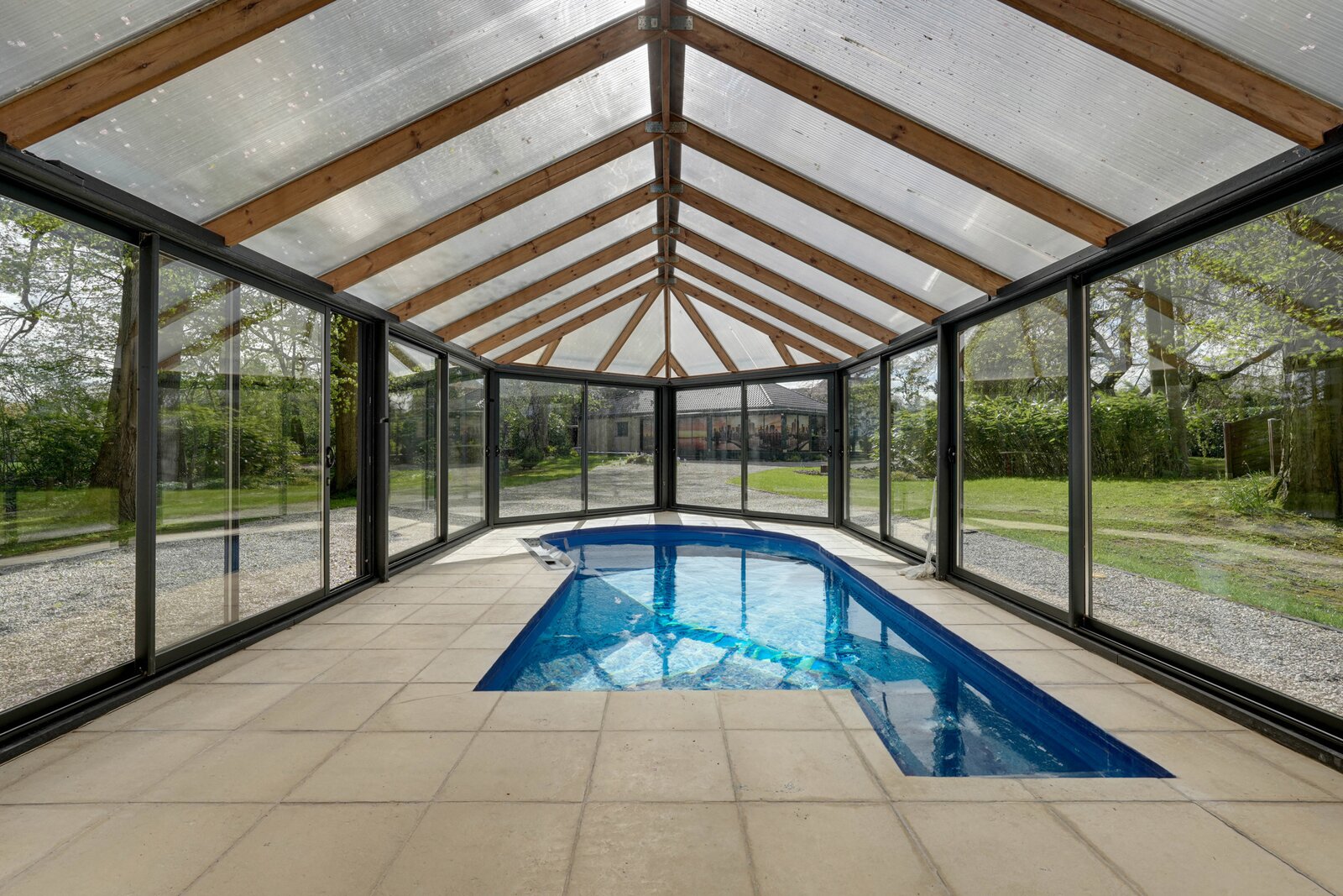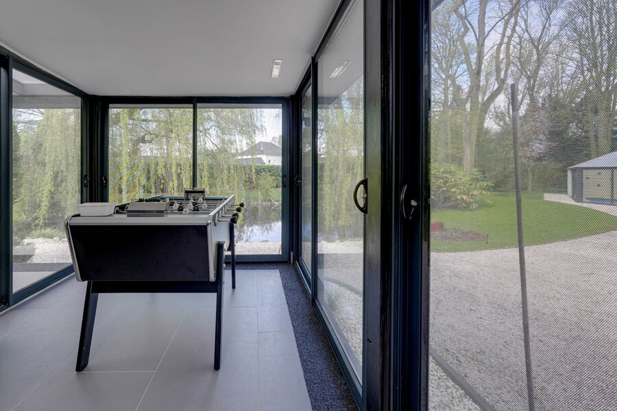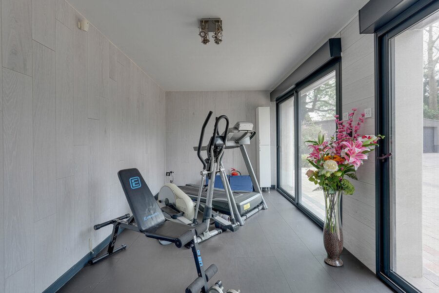 Outside: Triple garage (26, 20 and 20m²), large garden with trees, parking, pond, heated indoor swimming pool with heat pump, motorised gate.