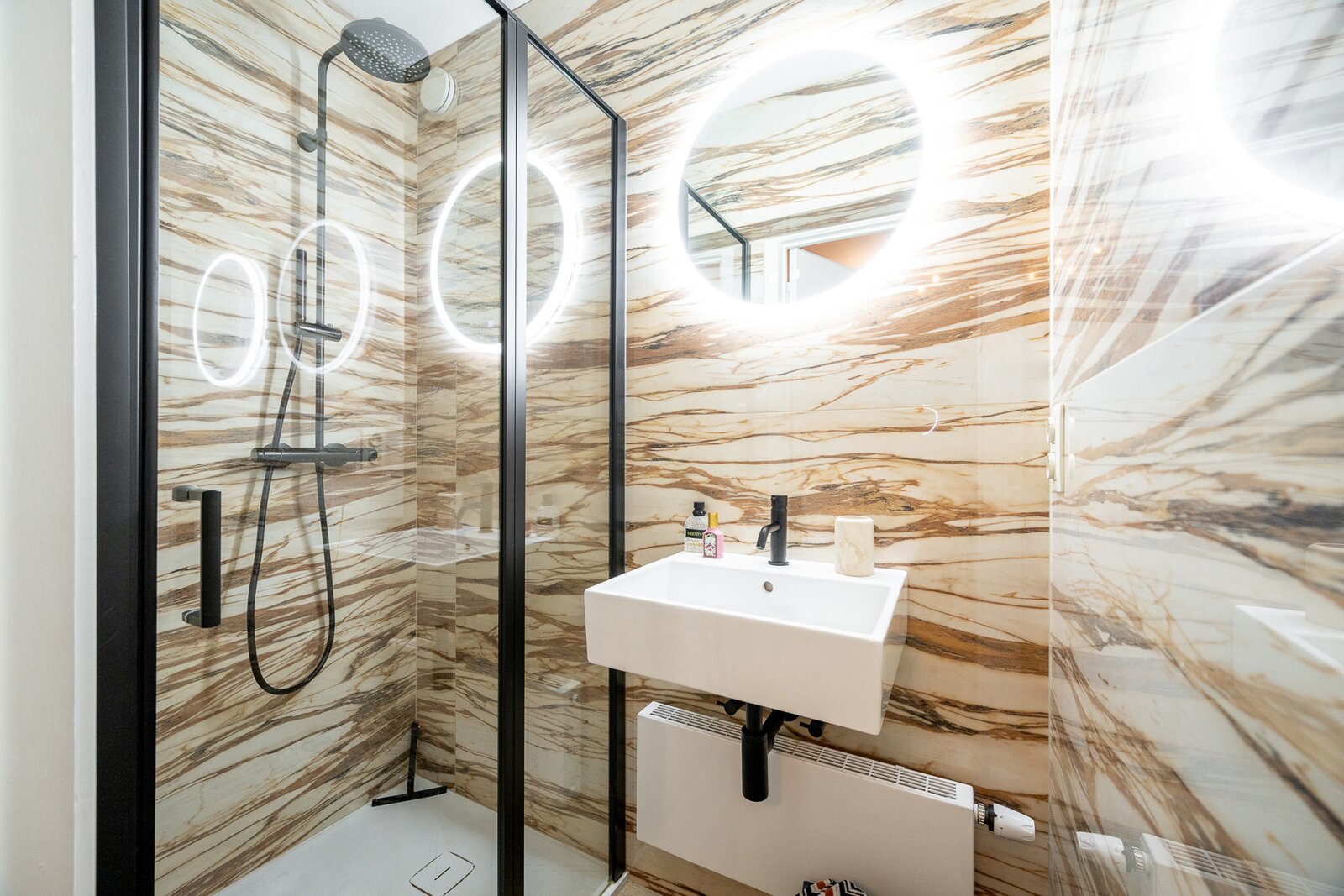 At the rear are two full bedrooms that open onto a quiet area, each with an en-suite bathroom, one of which has a walk-in shower.