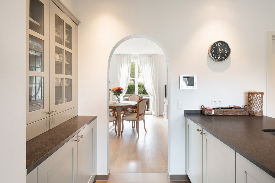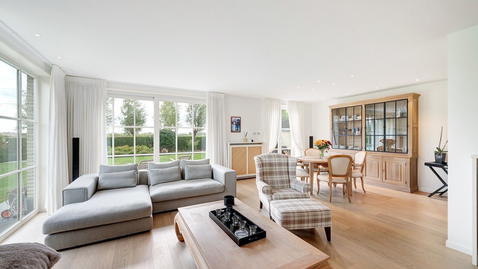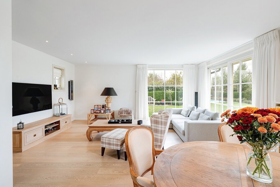 You are welcomed into a spacious entrance hall with guest toilet and cloakroom. The bright living area consists of a cosy lounge and dining room with direct access to the sunny garden and south-facing terraces, where you can enjoy the heated swimming pool in complete tranquillity. The fully equipped kitchen features a practical breakfast corner. Adjacent is a storage/laundry room with access to the garden.