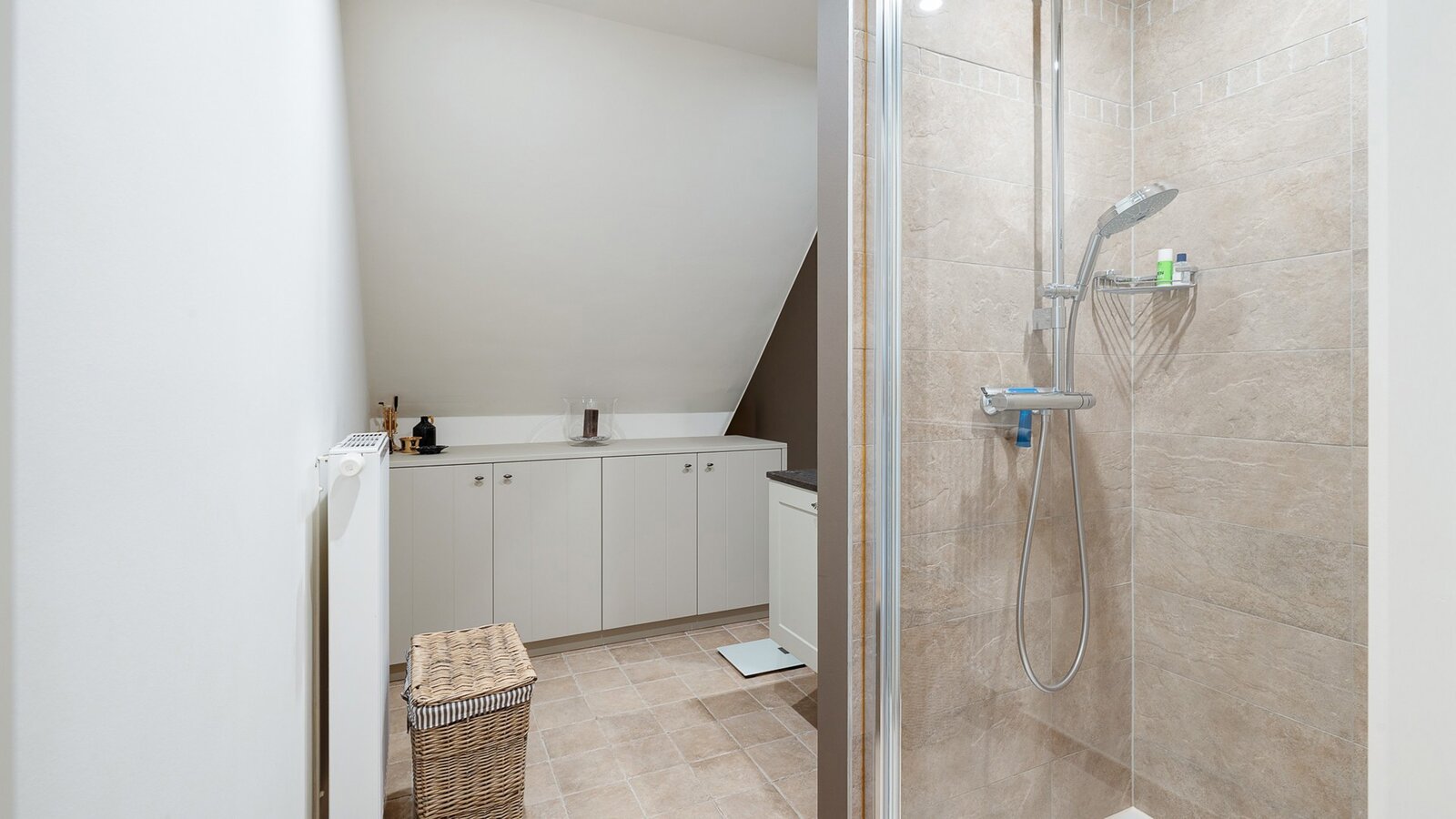 A generous master bedroom, a bathroom with double washbasin and bathtub, a dressing room (also suitable as a second bedroom), a third full-sized bedroom, a separate shower room and a separate toilet on the night hall.