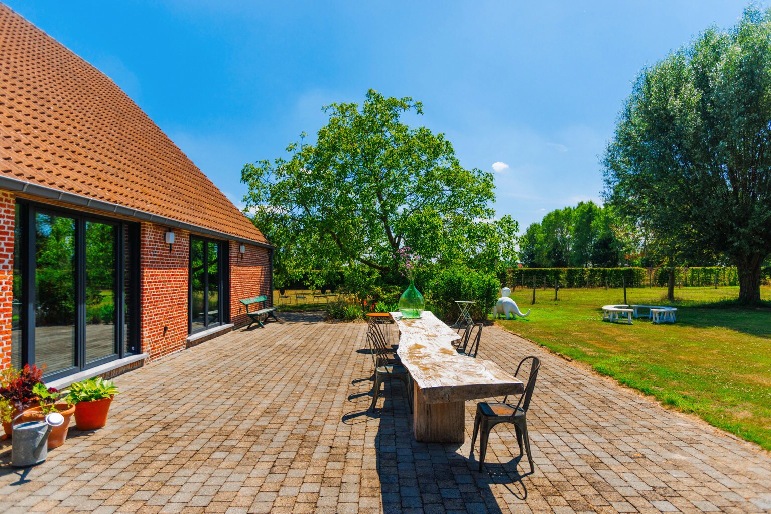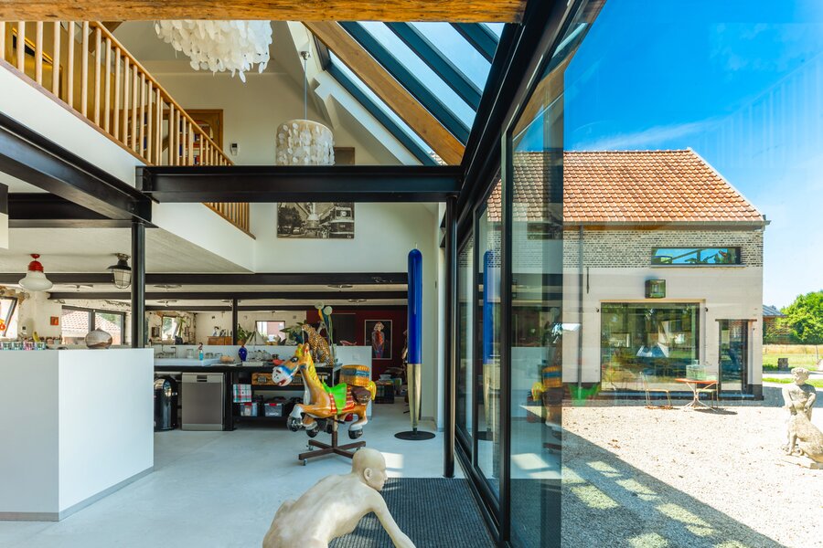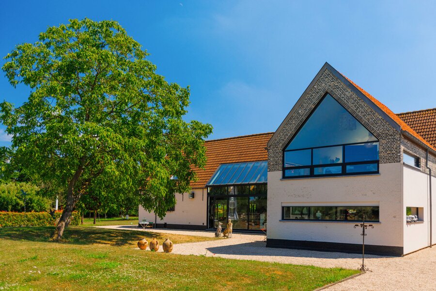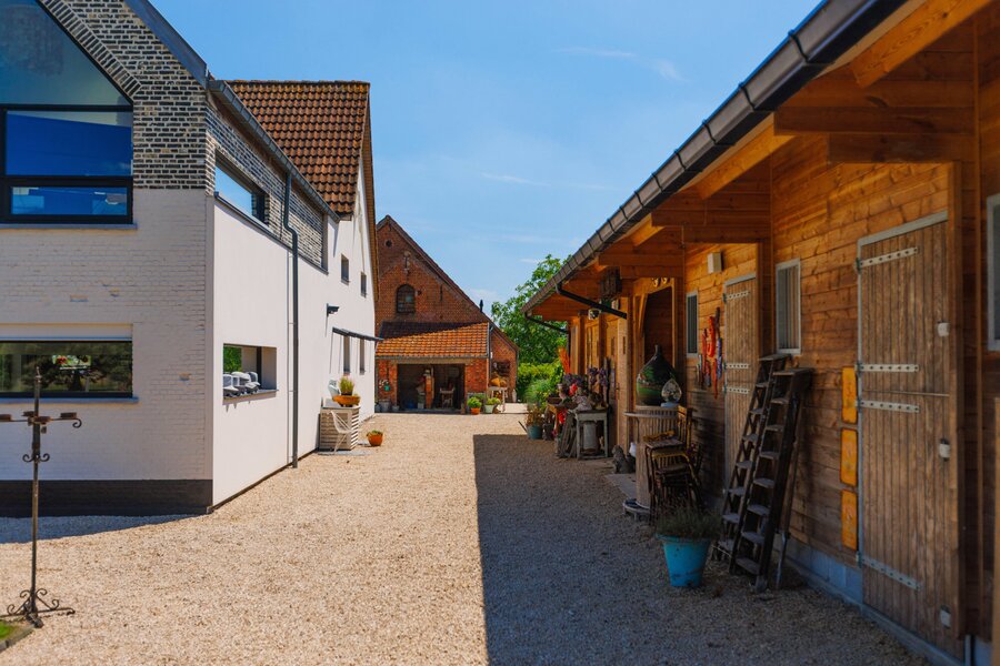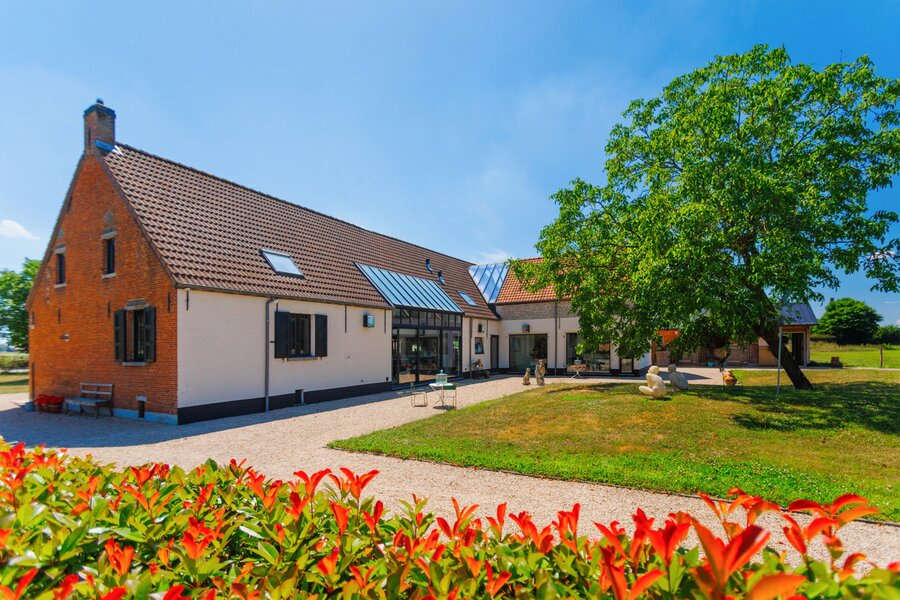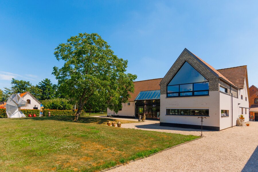 Historic character and contemporary architecture merge beautifully on this spacious, green domain, composed of three buildings, each with its own unique identity. The former farmhouse has undergone a full renovation and modern extension in recent years, designed by MP Architektenburo Vleminckx. Robust brickwork, XL windows, and beautifully preserved beams lend a lofty feel, while the authentic charm has been carefully preserved. The ground floor features a kitchen, laundry room, separate toilet, office, impressive living space, and wine cellar. On the upper floor lies a studio, where both the bedroom and bathroom enjoy calming views of the surrounding greenery. Additionally, there are two more bedrooms with a shared shower, dressing room, sauna, and toilet.