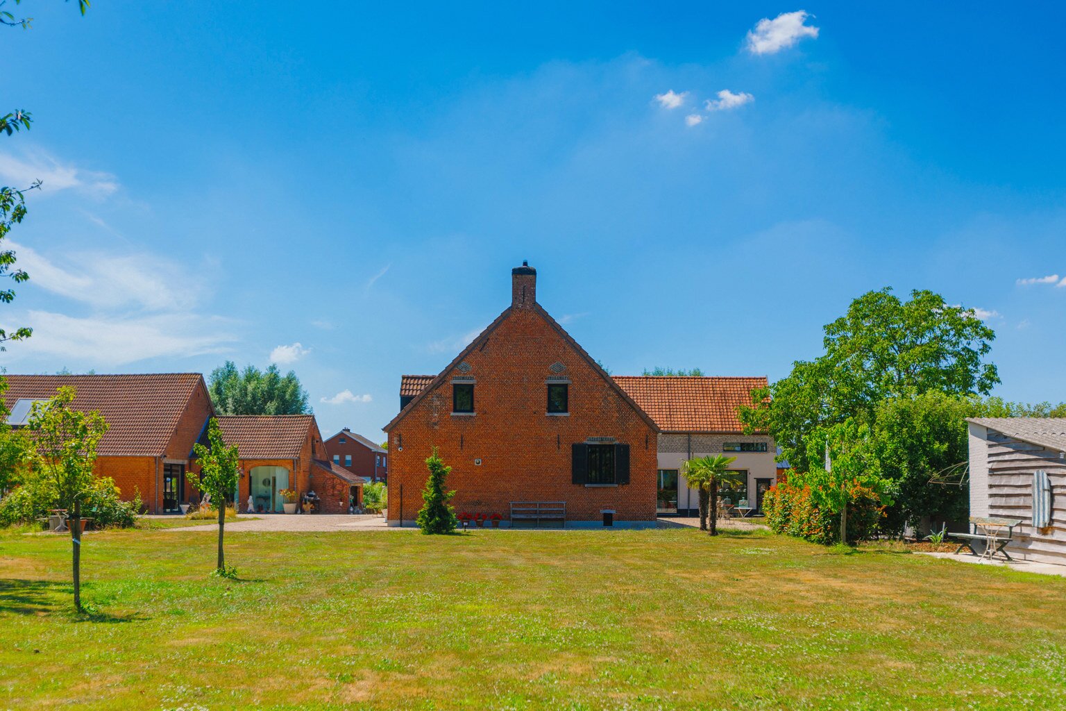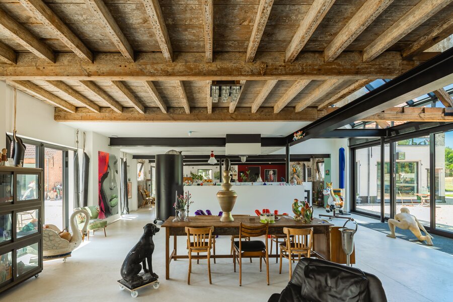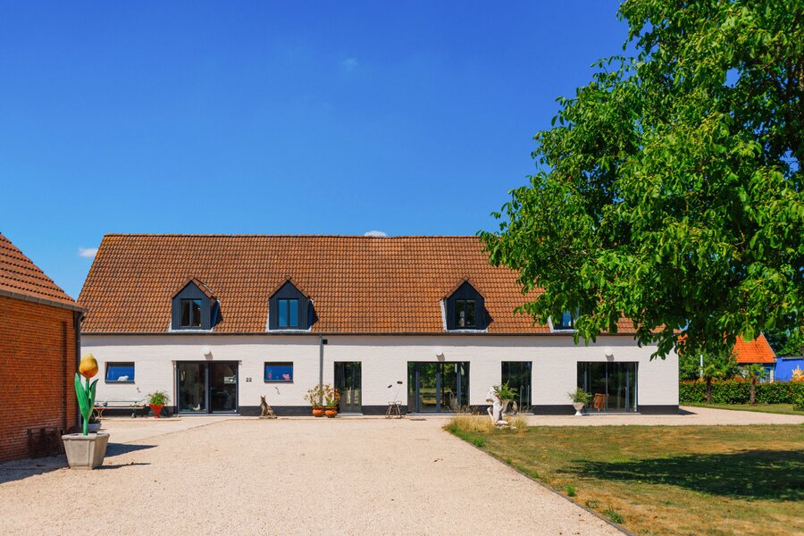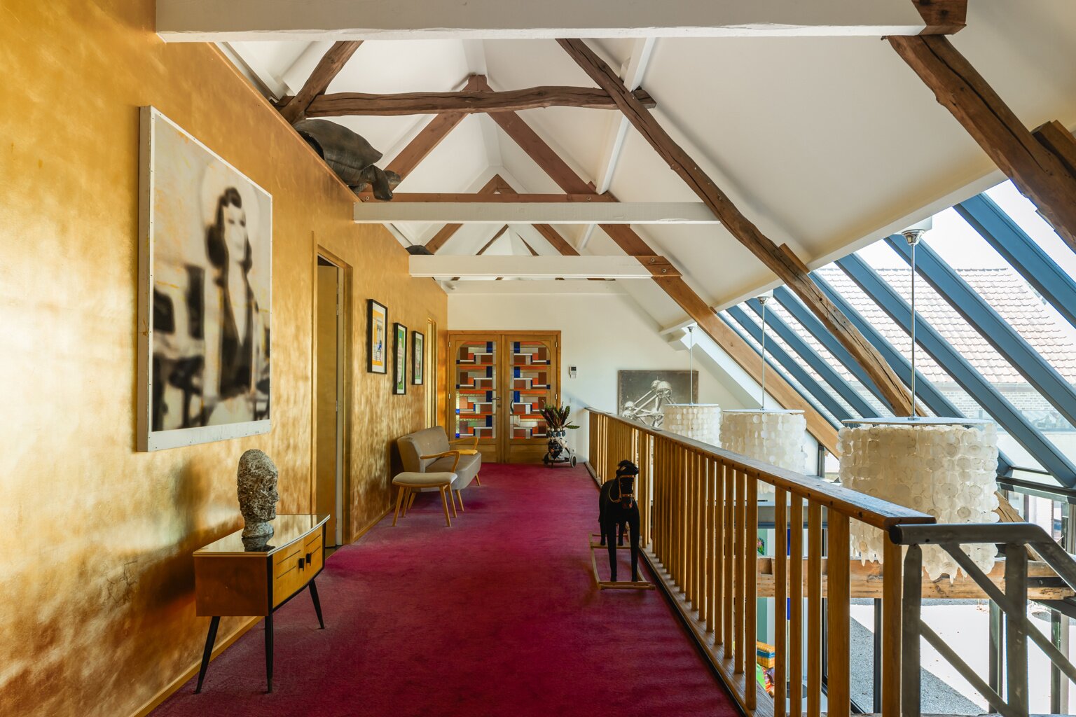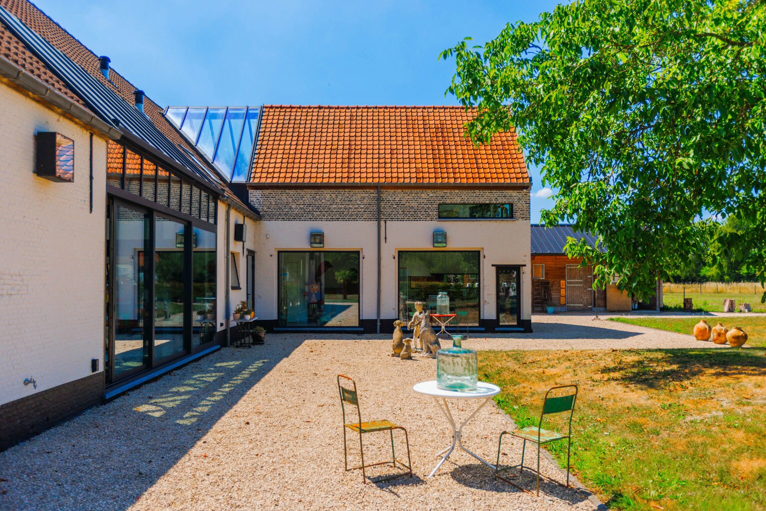Historic character and contemporary architecture merge beautifully on this spacious, green domain, composed of three buildings, each with its own unique identity. The former farmhouse has undergone a full renovation and modern extension in recent years, designed by MP Architektenburo Vleminckx. Robust brickwork, XL windows, and beautifully preserved beams lend a lofty feel, while the authentic charm has been carefully preserved. The ground floor features a kitchen, laundry room, separate toilet, office, impressive living space, and wine cellar. On the upper floor lies a studio, where both the bedroom and bathroom enjoy calming views of the surrounding greenery. Additionally, there are two more bedrooms with a shared shower, dressing room, sauna, and toilet.