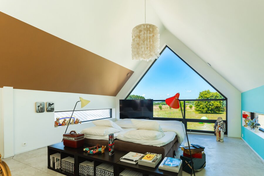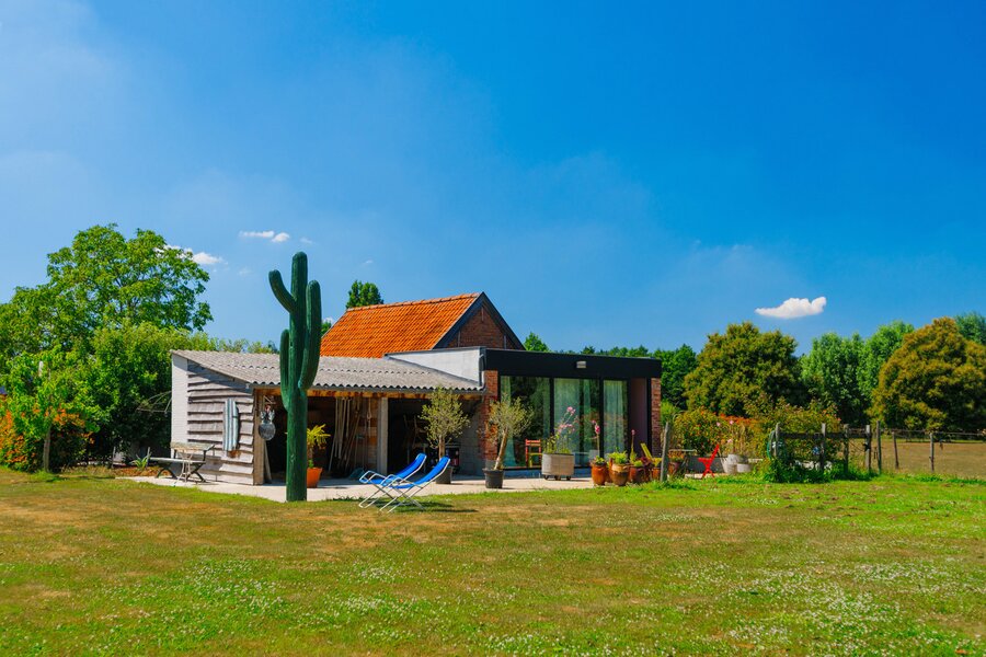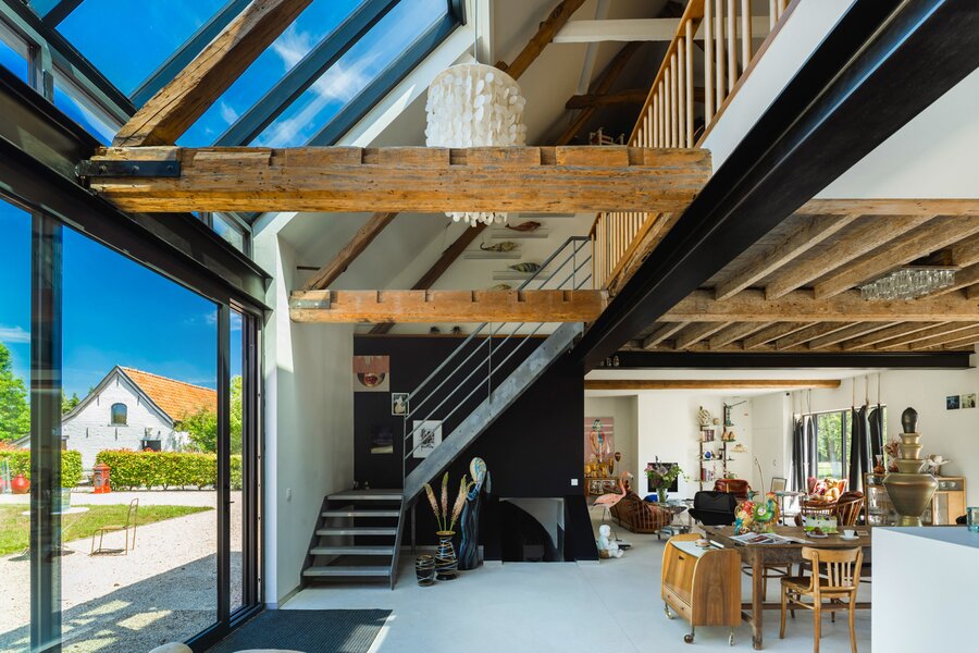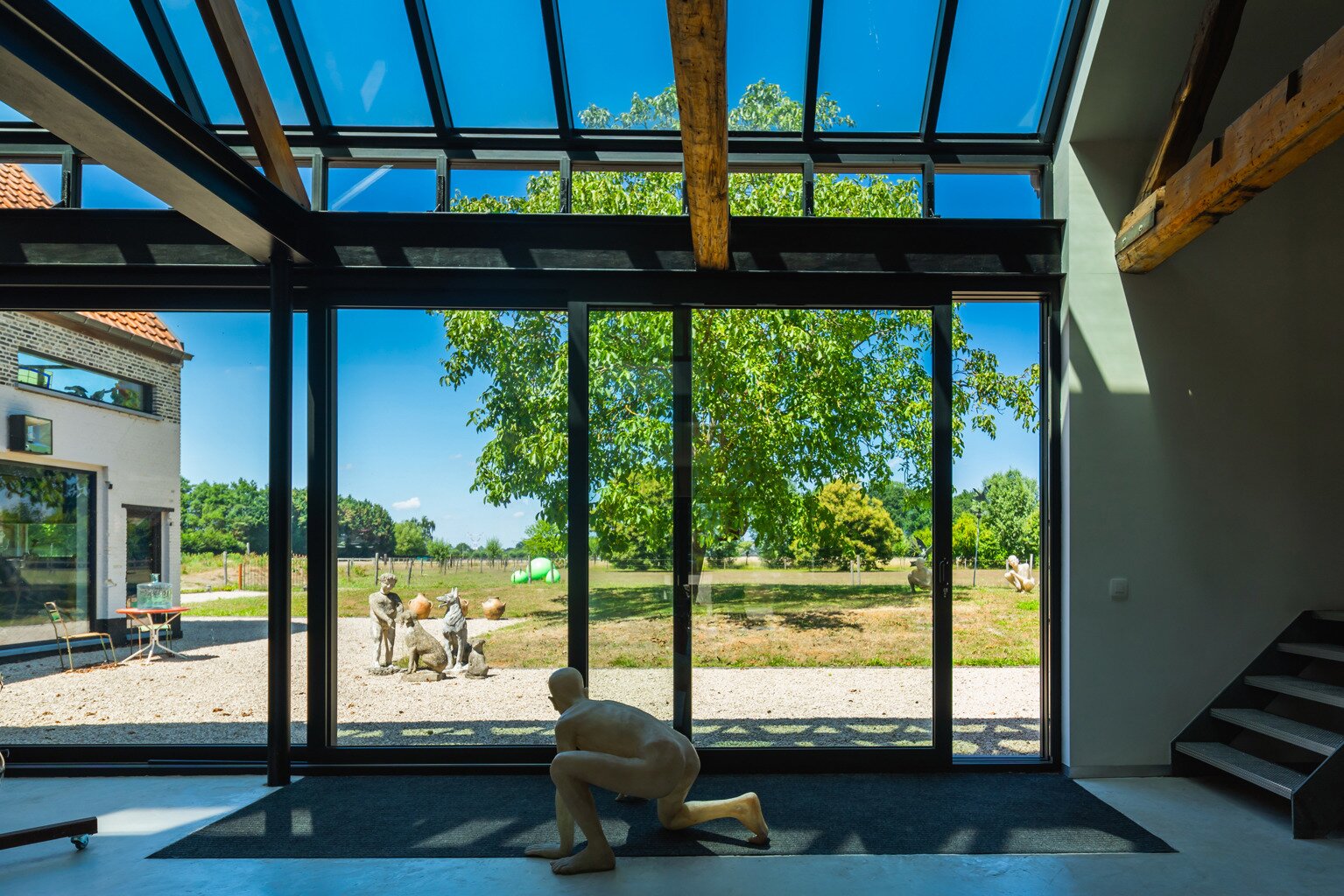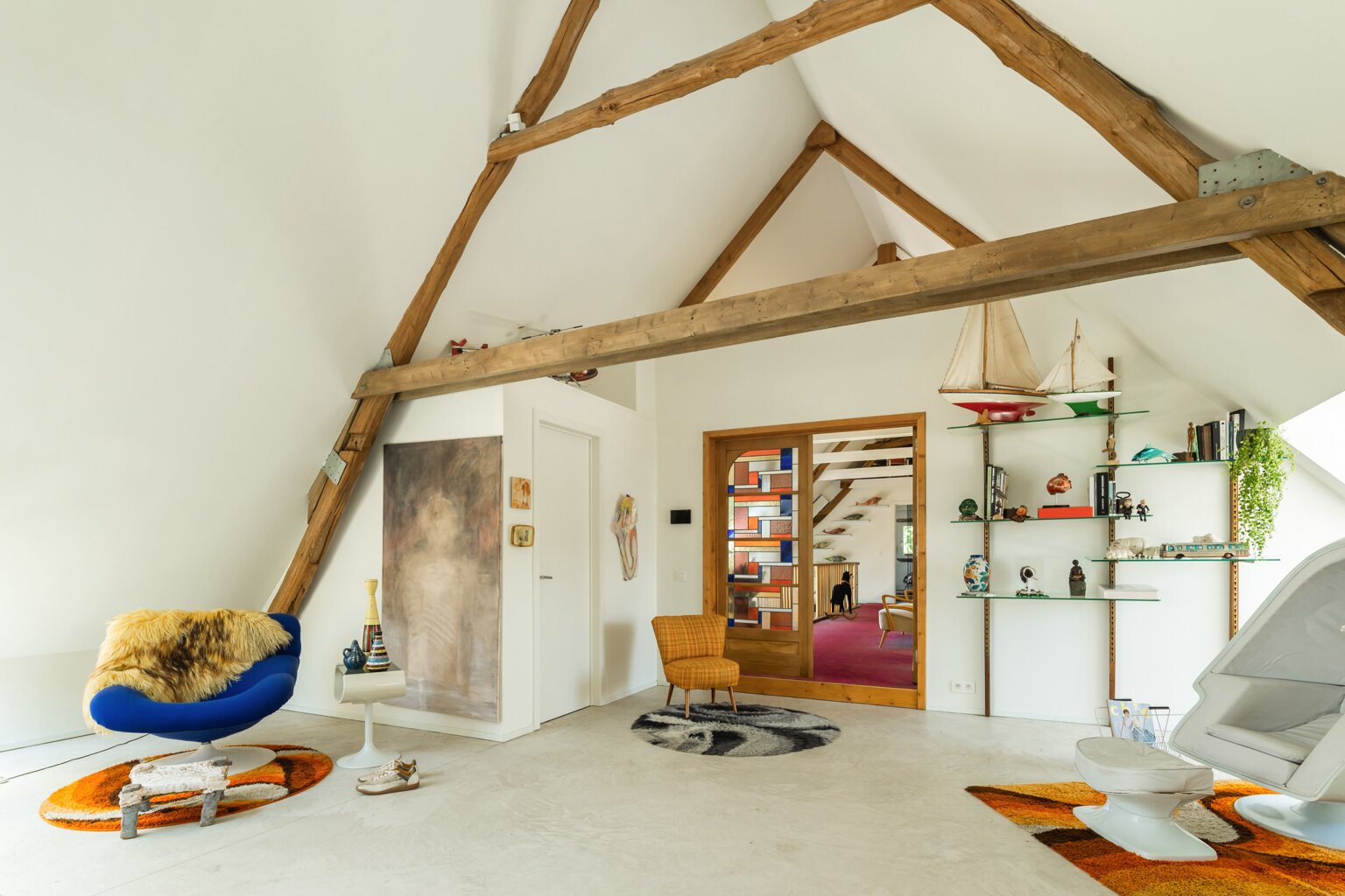 Historic character and contemporary architecture merge beautifully on this spacious, green domain, composed of three buildings, each with its own unique identity. The former farmhouse has undergone a full renovation and modern extension in recent years, designed by MP Architektenburo Vleminckx. Robust brickwork, XL windows, and beautifully preserved beams lend a lofty feel, while the authentic charm has been carefully preserved. The ground floor features a kitchen, laundry room, separate toilet, office, impressive living space, and wine cellar. On the upper floor lies a studio, where both the bedroom and bathroom enjoy calming views of the surrounding greenery. Additionally, there are two more bedrooms with a shared shower, dressing room, sauna, and toilet.