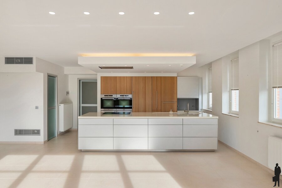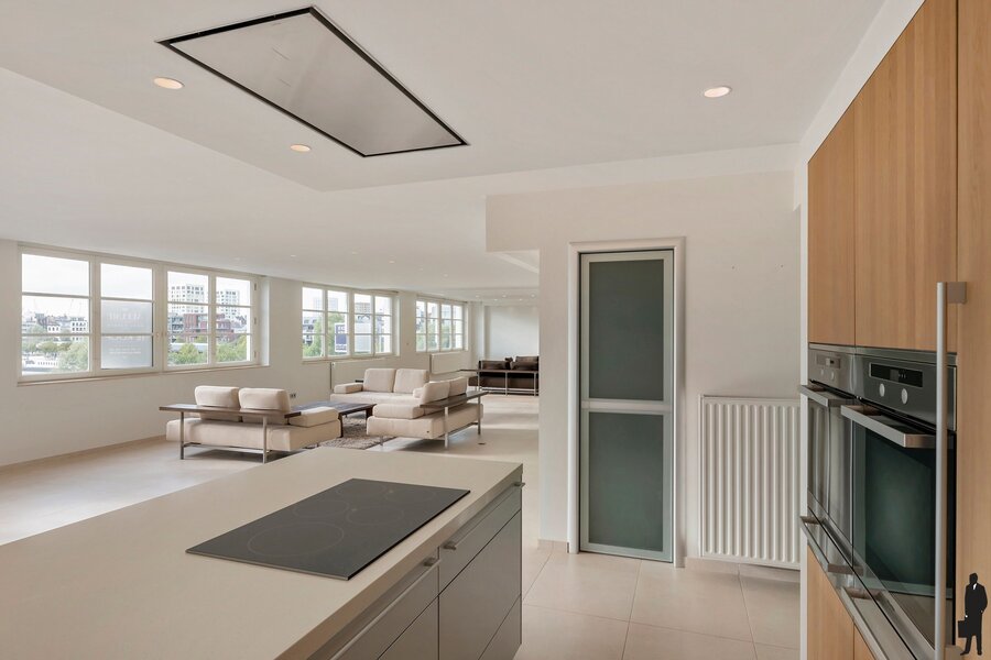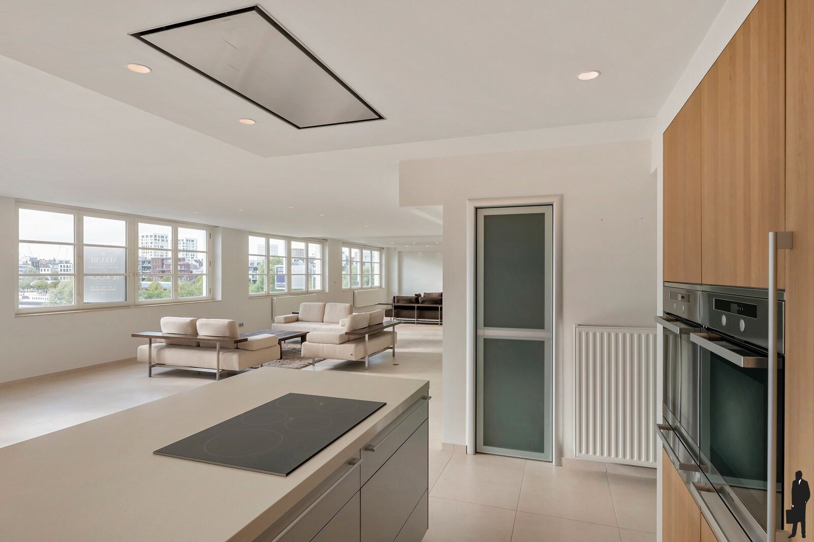 Gelegen op de derde verdieping combineert het appartement functionaliteit en luxe in een doordachte indeling. U wordt verwelkomd in een elegante inkomhal met vestiaire en gastentoilet. Vanuit hier bereikt u een eerste ruime slaapkamer, ideaal als logeer- of bureauruimte. Het hart van de woning is de indrukwekkende leefruimte van ca. 164 m², overspoeld door natuurlijk licht via de vele raampartijen en met een panoramisch uitzicht dat elke dag opnieuw weet te bekoren. Aansluitend bevindt zich de eetruimte met een volledig ingerichte Bulthaup-keuken. Achter de keuken liggen twee extra kamers, inzetbaar als slaapkamers, bureaus of hobbyruimtes, evenals een tweede badkamer met douche, wastafel, aansluitingen voor was-/droogmachine en een extra toilet. Een praktische berging vervolledigt dit gedeelte. De master suite aan de andere zijde van het appartement vormt een oase van rust en comfort, met een ruime slaapkamer, ingebouwde dressingkasten en een luxueuze badkamer met inloopdouche, ligbad, dubbele wastafel en apart toilet. Op het Eilandje woont u te midden van gastronomie, cultuur en stijl met het Willemdok aan uw voordeur en alle verbindingen binnen handbereik.