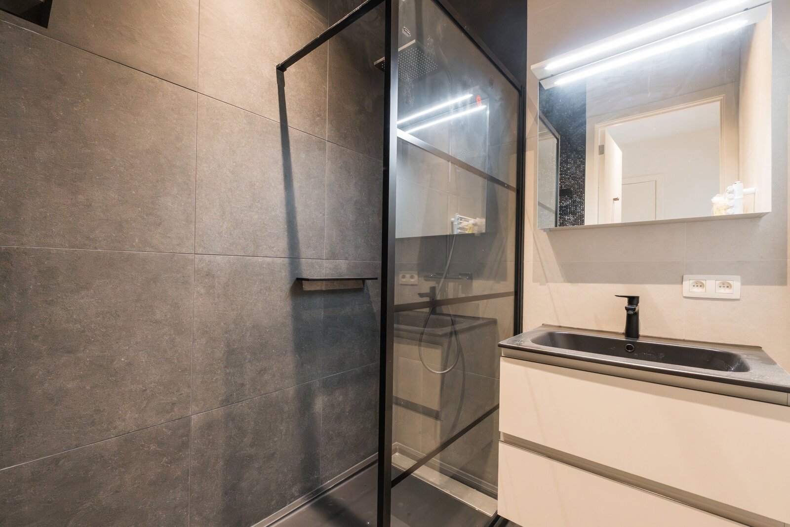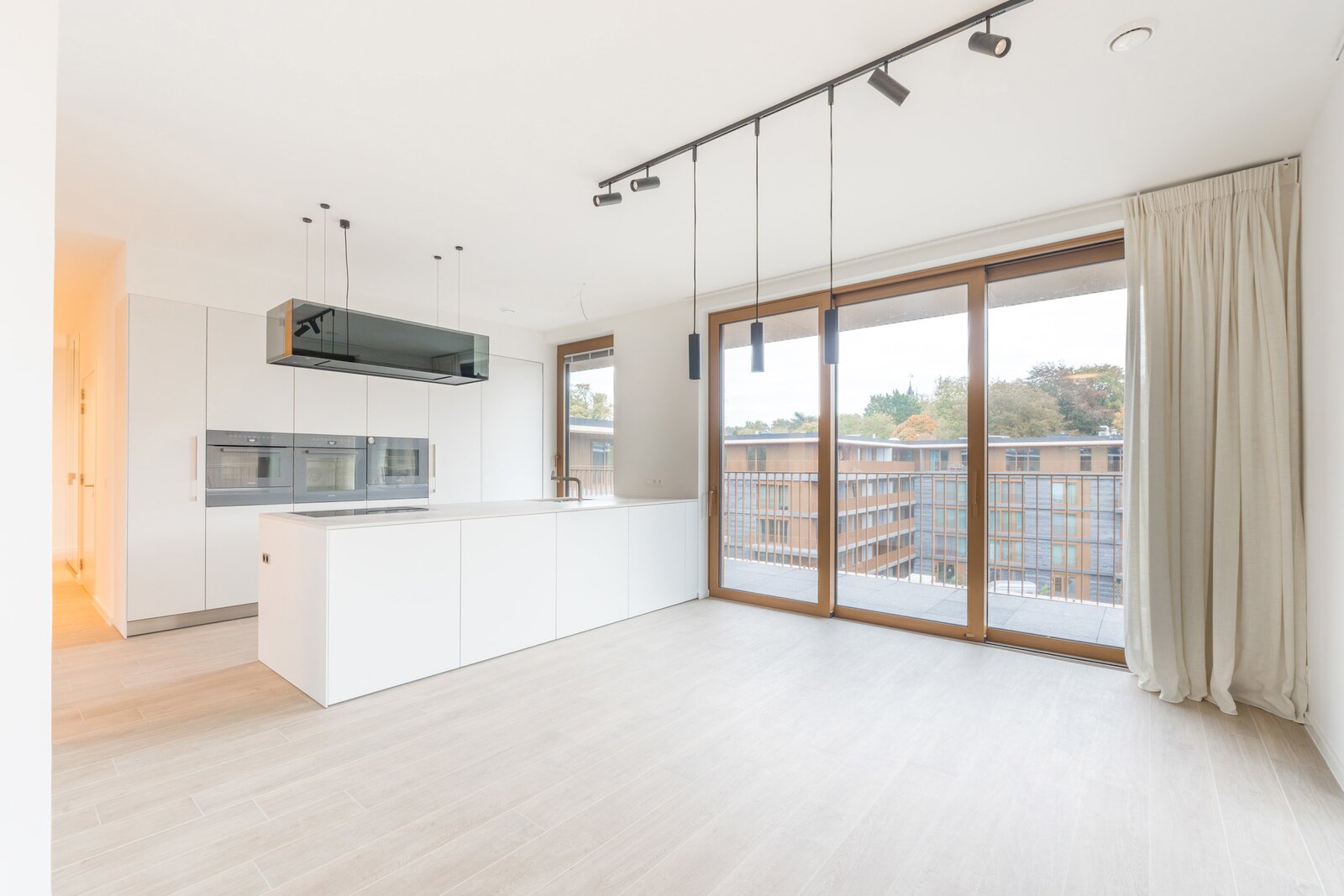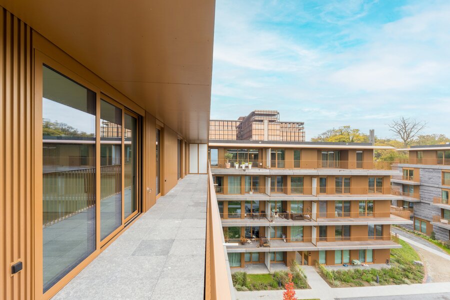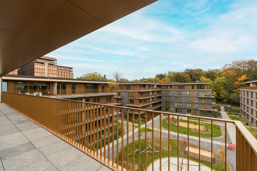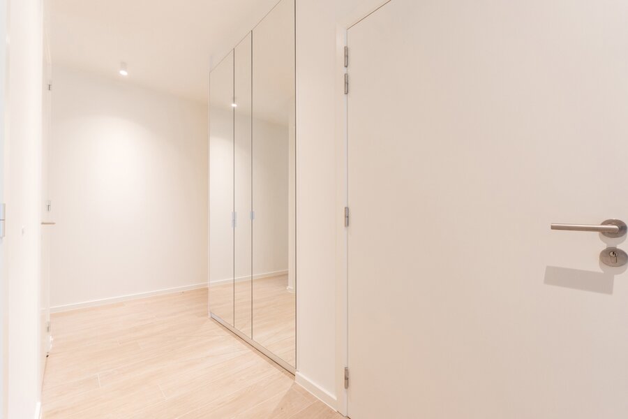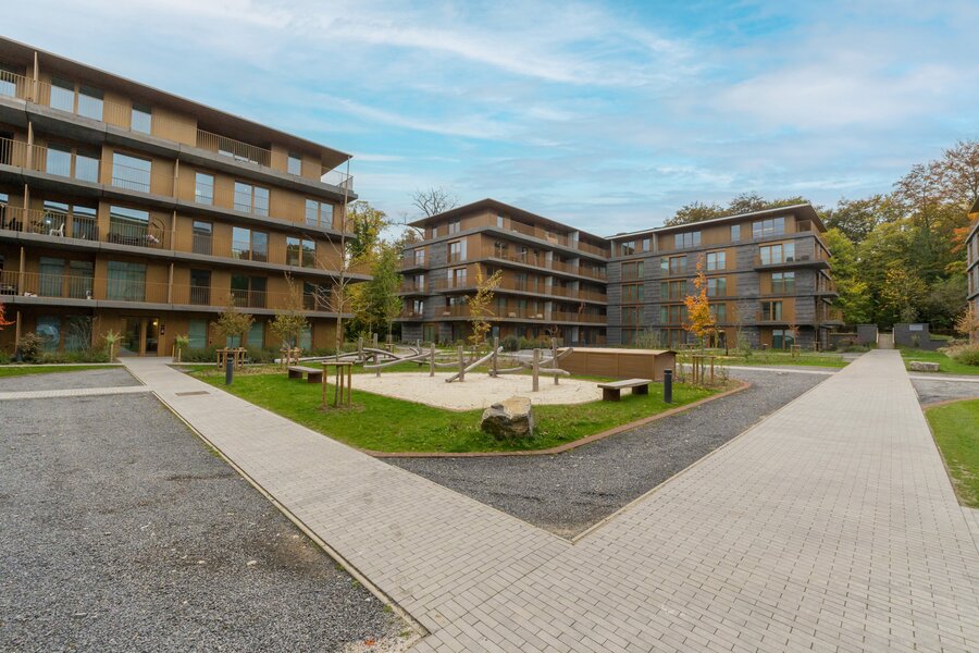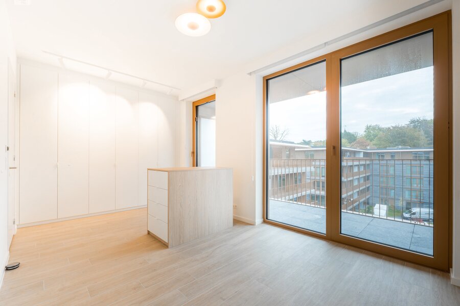 WATERMAEL-BOITSFORT, in the immediate vicinity of the Sonian Forest and Mix Brussels, this magnificent penthouse (3 bedr./1 bath/1 shower) of ±150 m² is a first occupation. It consists of an entrance hall with cloakroom and guest toilet, a spacious living room of ±40 m², a dining area with a fully equipped open kitchen of ±22 m². All these rooms benefit from beautiful natural light through large windows and open onto an exceptional terrace of ±80 m². The night hall leads to a master suite of ±18 m² with dressing room and bathroom, two bedrooms of ±10 m² and ±9 m², and a shower room. Separate laundry area. Optimal comfort thanks to modern equipment and high-quality finishes: underfloor heating, air conditioning, double-flow ventilation, home automation system, electric screen, blinds in the bedrooms, curtains. and security door. Possibility of a closed box with cellar for €160/month. Option for a wine cellar at €120/month. Provision for charges: €300/month (common areas and heating). EPC: A. To be discovered with L&P!
