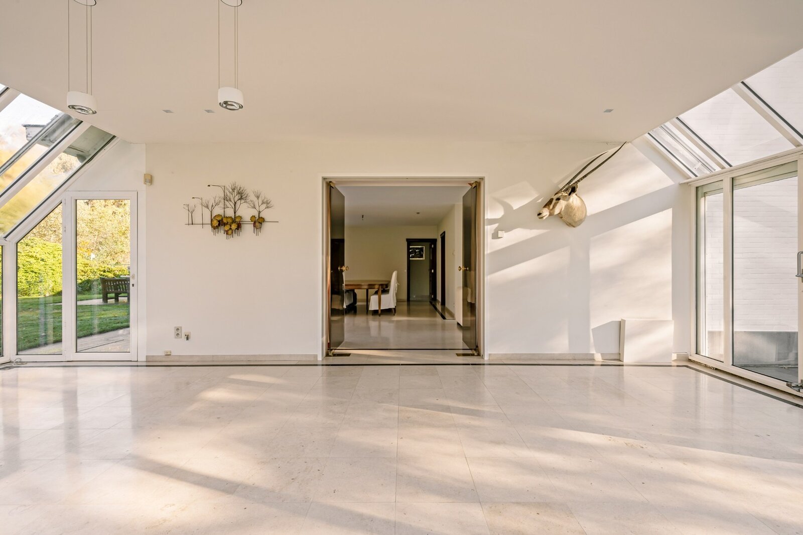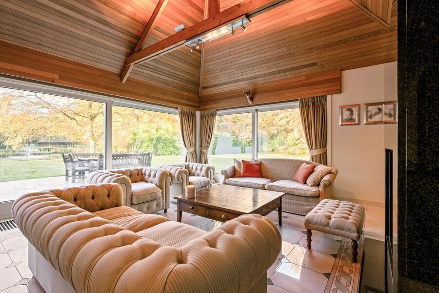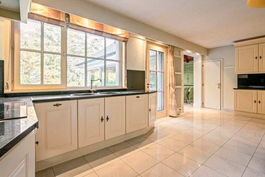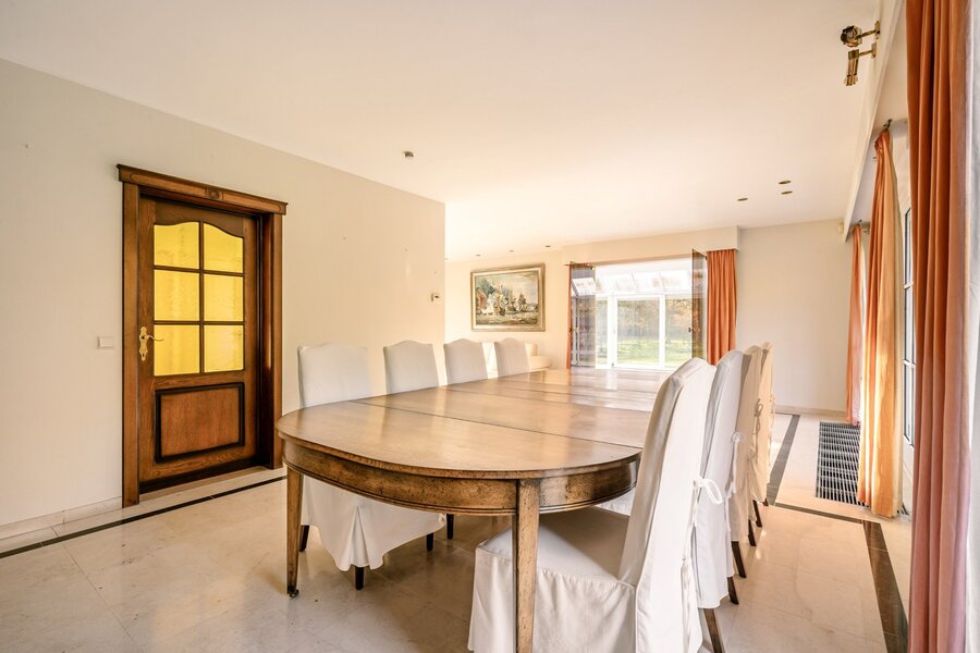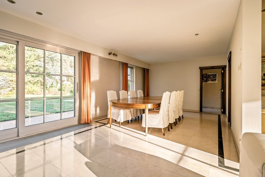 De villa verwelkomt u via een ruime en lichtrijke inkomhal met vestiaire en gastentoilet. Vanuit hier bereikt u de aangename leefruimte met open haard en grote raampartijen, die zorgen voor een prachtig uitzicht op de fraai aangelegde tuin. Aansluitend bevindt zich een sfeervolle leefveranda, volledig omringd door schuiframen en voorzien van automatische zonnescreens, zodat u het hele jaar door geniet van een maximale lichtinval en een harmonieus zicht op het groen.