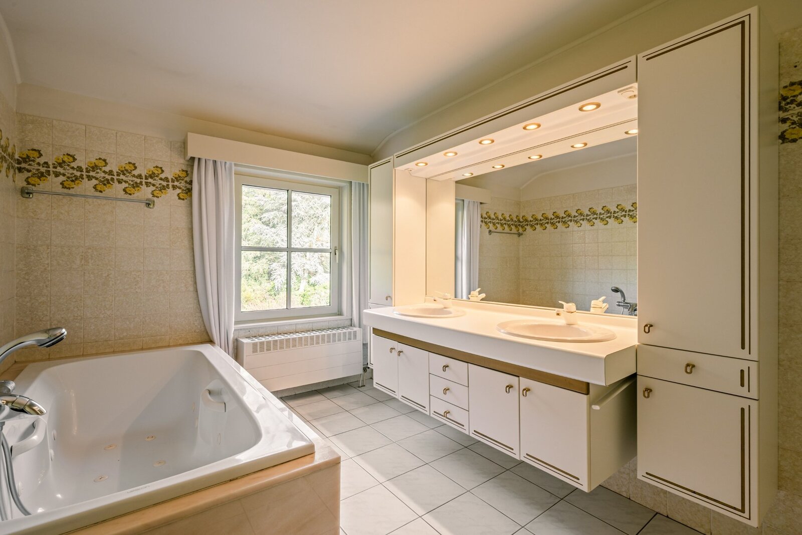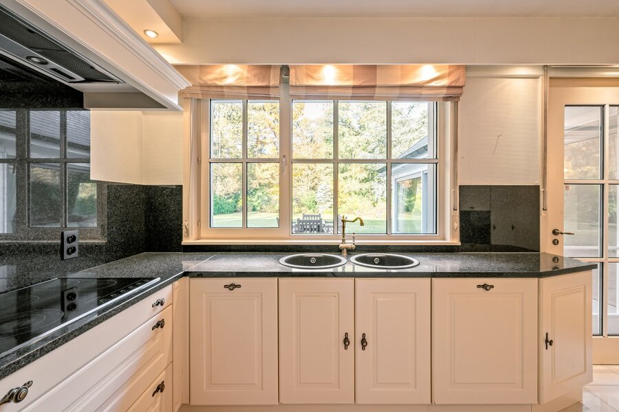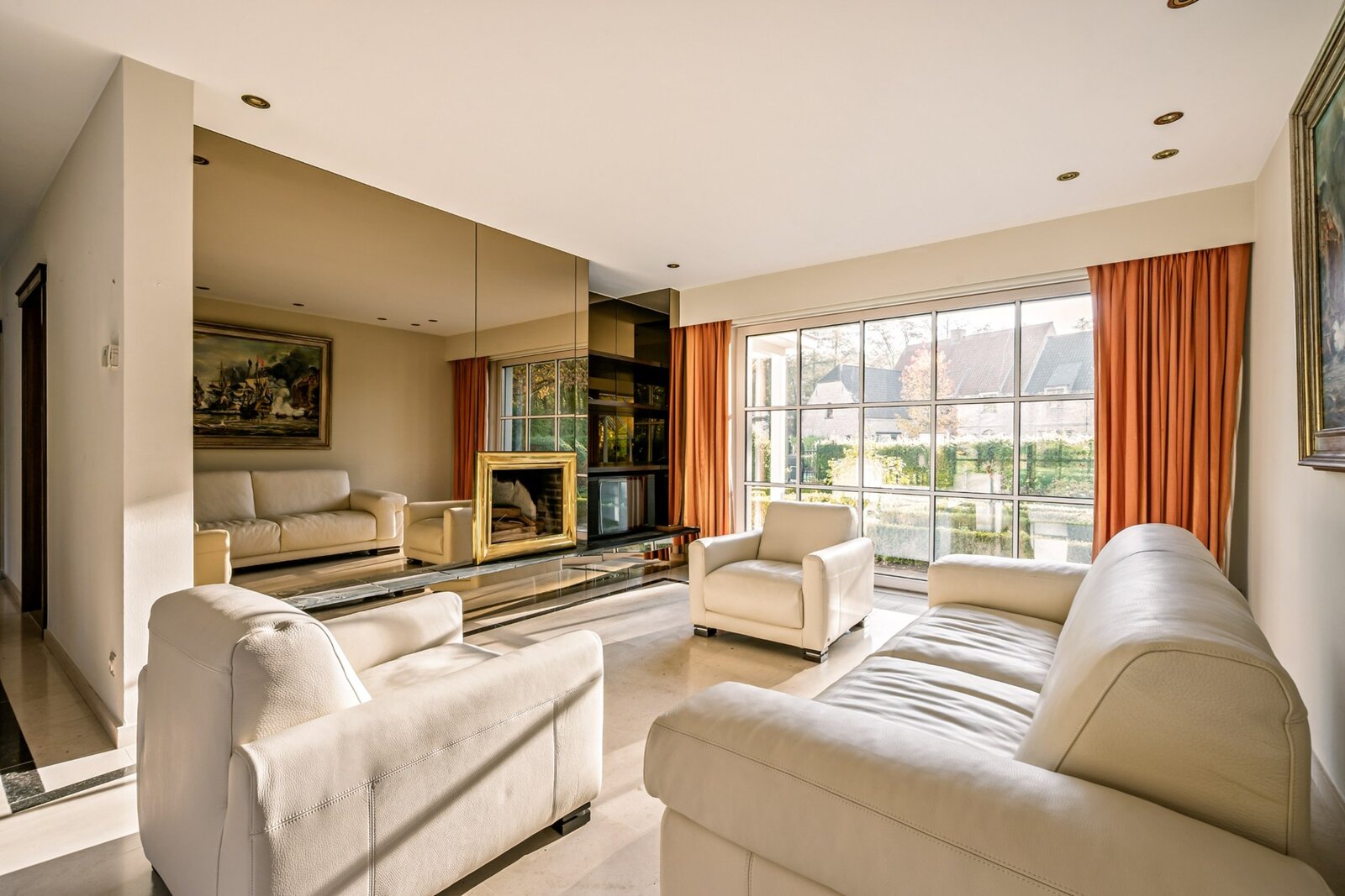 De villa verwelkomt u via een ruime en lichtrijke inkomhal met vestiaire en gastentoilet. Vanuit hier bereikt u de aangename leefruimte met open haard en grote raampartijen, die zorgen voor een prachtig uitzicht op de fraai aangelegde tuin. Aansluitend bevindt zich een sfeervolle leefveranda, volledig omringd door schuiframen en voorzien van automatische zonnescreens, zodat u het hele jaar door geniet van een maximale lichtinval en een harmonieus zicht op het groen.