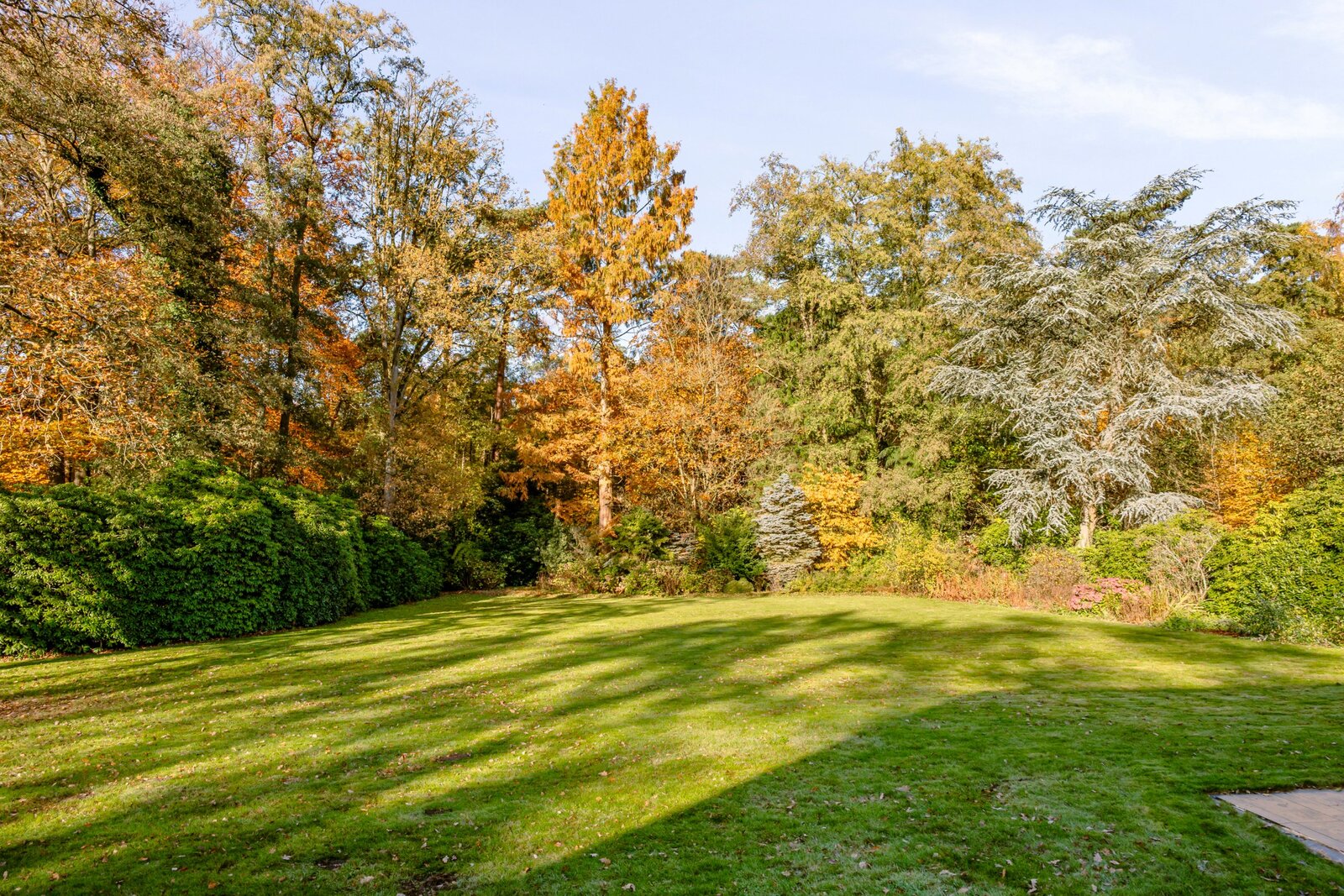 De zuidwest-georiënteerde tuin vormt een ware oase van rust, met weidse vergezichten en een bijzonder harmonieuze groenbeleving. De tuin werd smaakvol aangelegd.