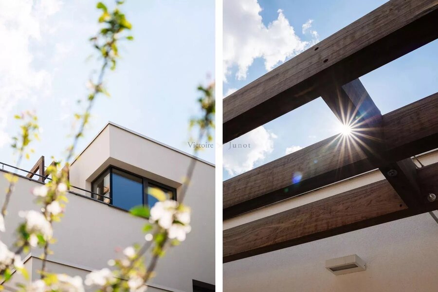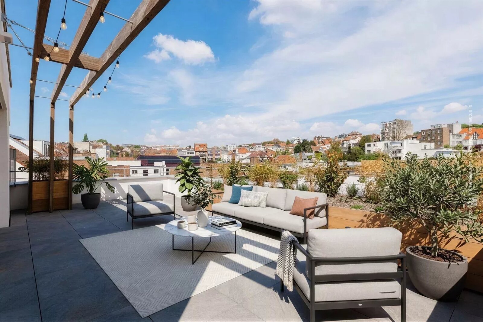A lovely terrace, extended by a green roof, beautifully enhances this living space.