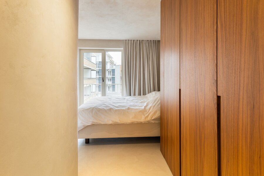 Inkomhal met vestiaire en gastentoilet, ruime en lichtrijke leefruimte met directe uitkijk op zee, open keuken voorzien van alle comfort (Miele toestellen), 2 volwaardige slaapkamers met inbouwkasten, slaaphoek/bureauruimte, badkamer met ligbad en regendouche, douchekamer, terras achteraan.