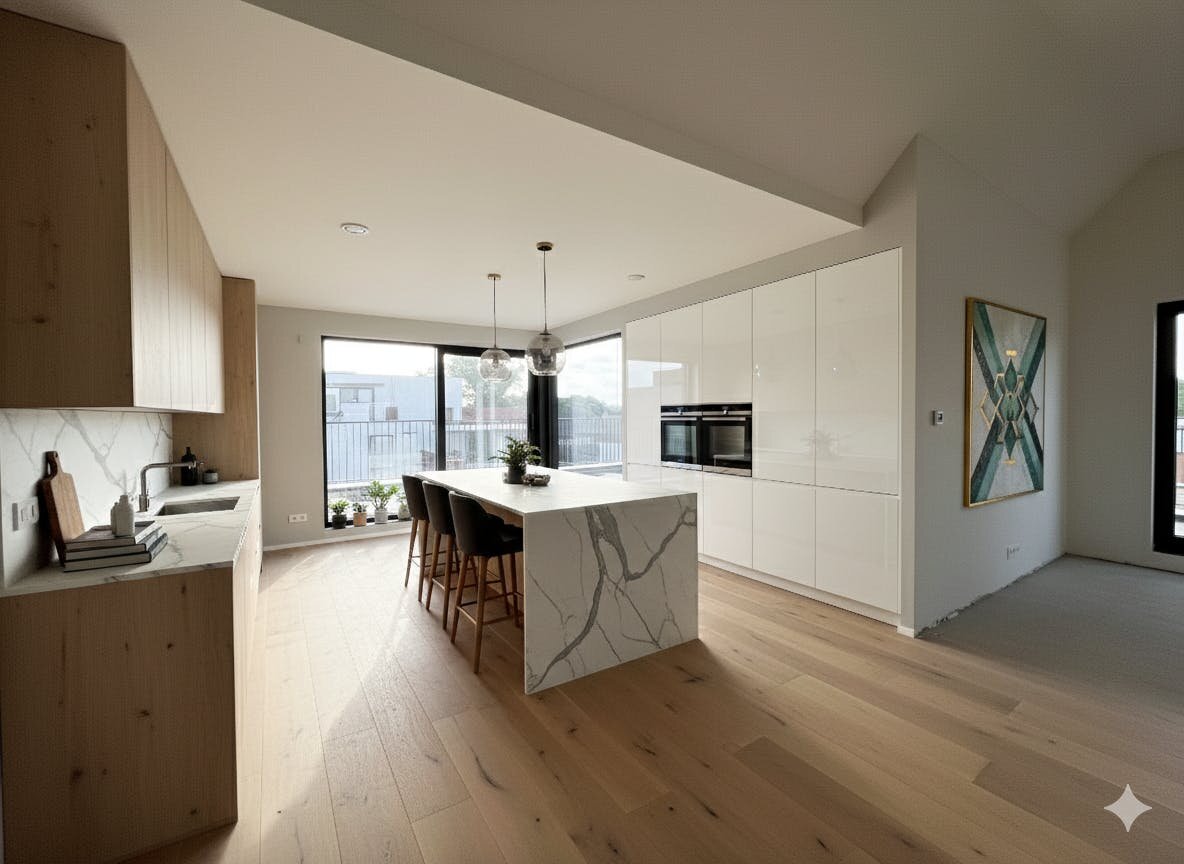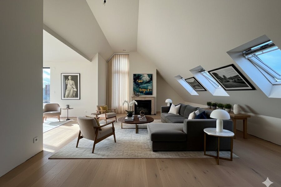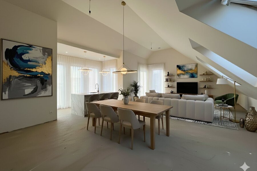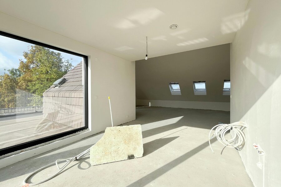 Spacious penthouse of no less than 163 m² for sale in the heart of Hoogstraten, within walking and cycling distance of public transport and various shops and restaurants. The apartment has 3 bedrooms and a very spacious 75 m² sun terrace facing east but where the sun can still shine in the afternoon. You have a beautiful view of the site's attractive park garden. Only on site can you experience what this ideal height can offer in terms of peace and a sense of space without upstairs neighbors.