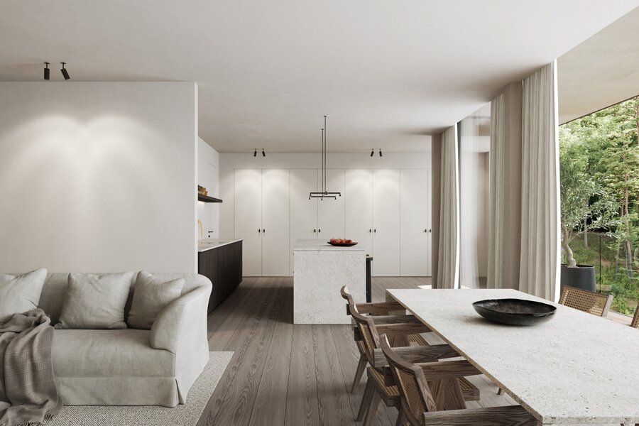 Apartment 7.11, located on the ground floor, offers 3 bedrooms over approximately 260 m², with a terrace of around 35 m². The apartment comprises an entrance hall with cloakroom, guest toilet, and laundry room, leading to a spacious and bright living area with an open, fully equipped American kitchen with separate scullery. The sleeping area includes a beautiful master suite with dressing room and full bathroom, and 2 bedrooms with their own shower room and toilet. Both the living room and master bedroom open onto the terrace.