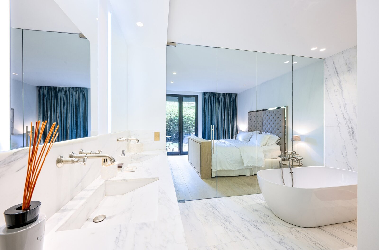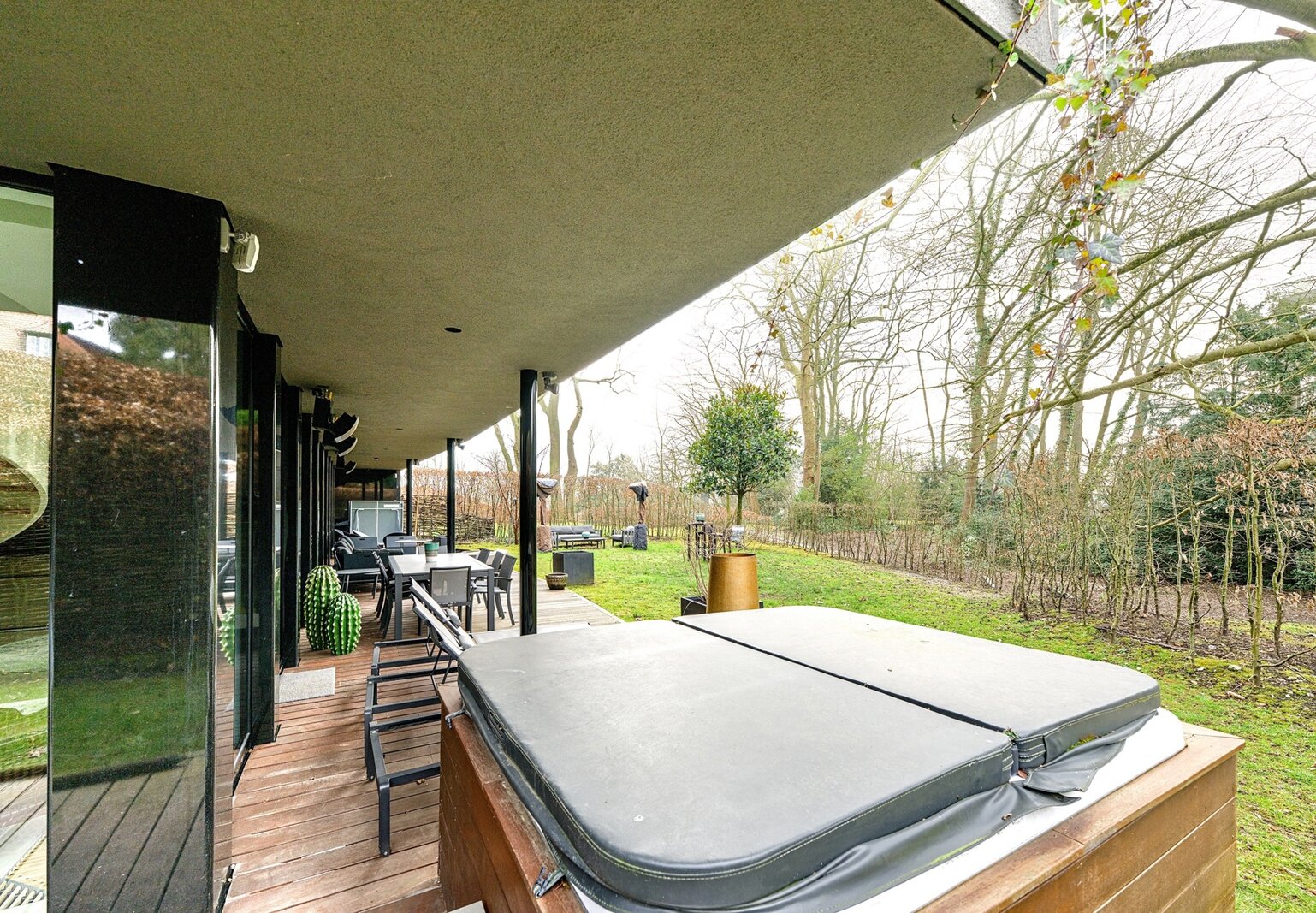 On the garden level, the property boasts a generous living room furnished with custom-made furniture and a dedicated bar area. The living space opens directly onto the garden, offering views of the surrounding nature. The garden level also includes two elegant suites featuring bedrooms, dressing areas, en-suite bathrooms, a hammam, a guest WC, and a wine cellar.