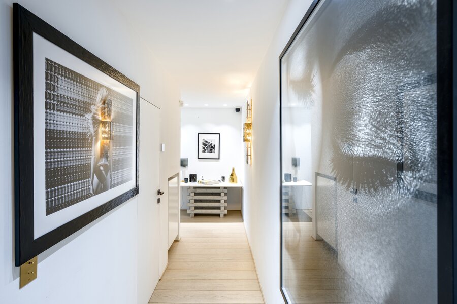 On the first floor, accessible via a beautiful staircase, there is a large dining room with a fully equipped open kitchen leading to the large southwest-facing terrace. Additionally, there is an office, two en-suite bedrooms (each with a bathroom, dressing area, and WC), and a second office. A laundry room and boiler room are also available.