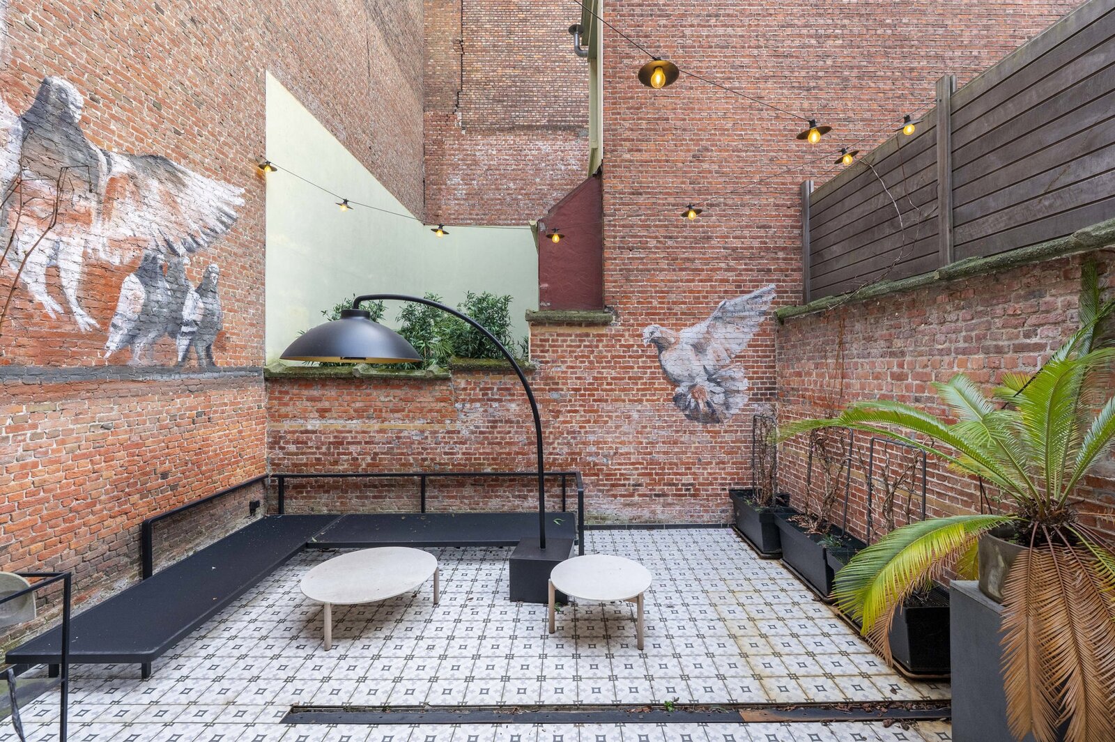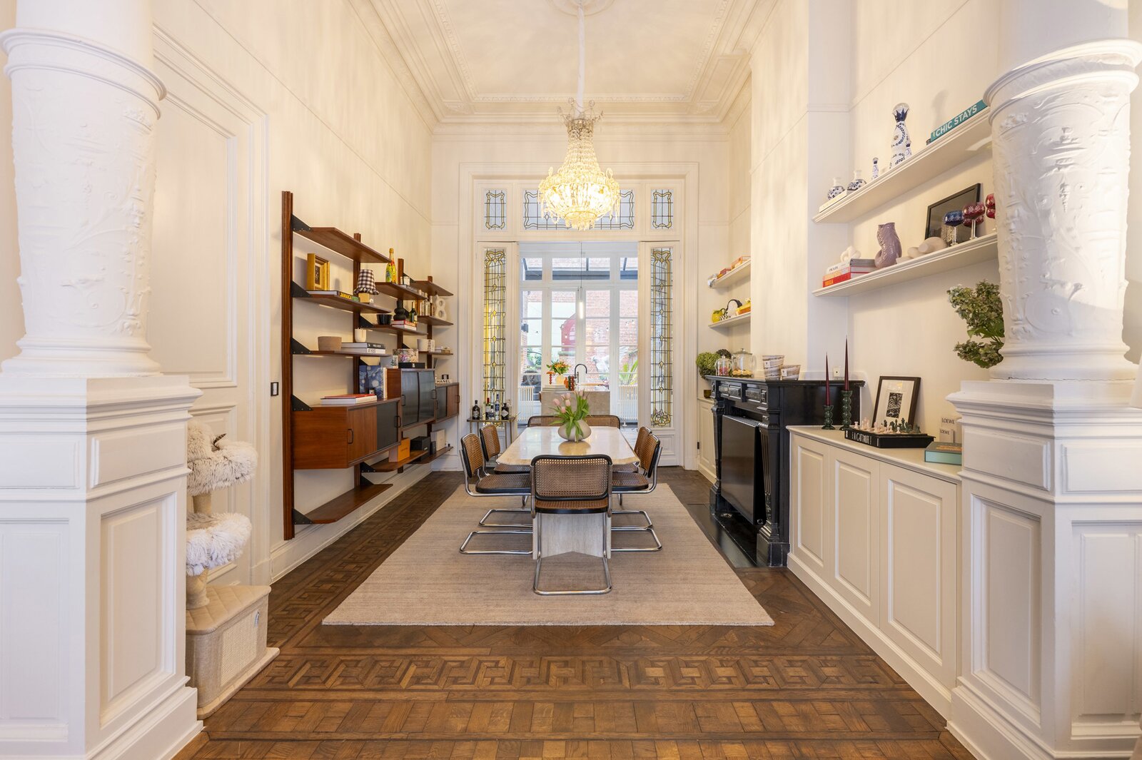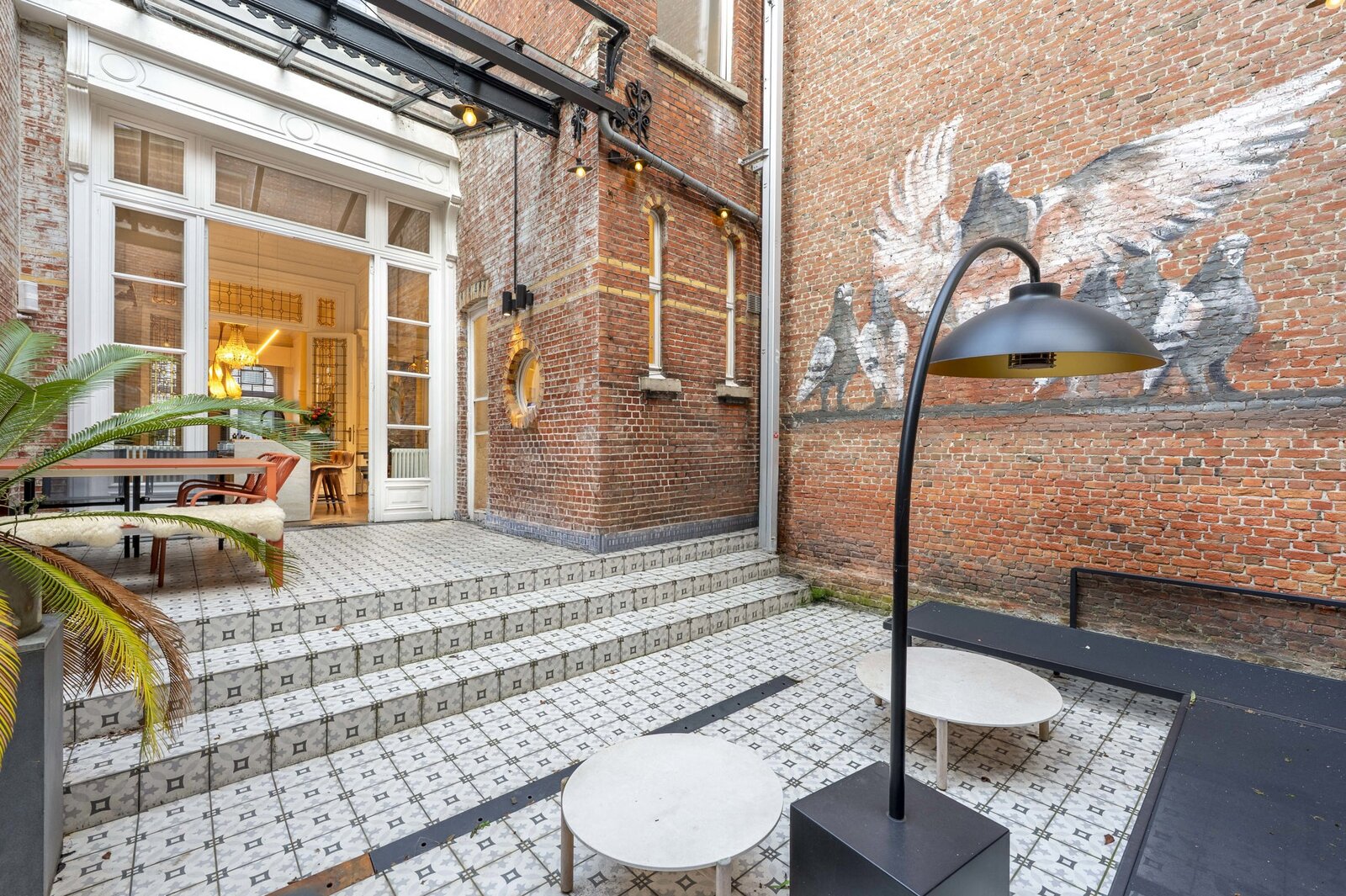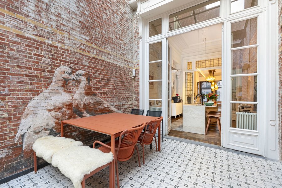Spacious entrance hall with retention of all original elements. Through the hall you have access to the spacious living room, dining room and fully equipped open kitchen with cooking island on beautiful parquet floors. Separately, we find a utility room on this floor with professional kitchen appliances. Would you like to relax in the middle of the old south? Then take a seat in the cozy courtyard with wall paintings by 'Charlotte De Cock'.