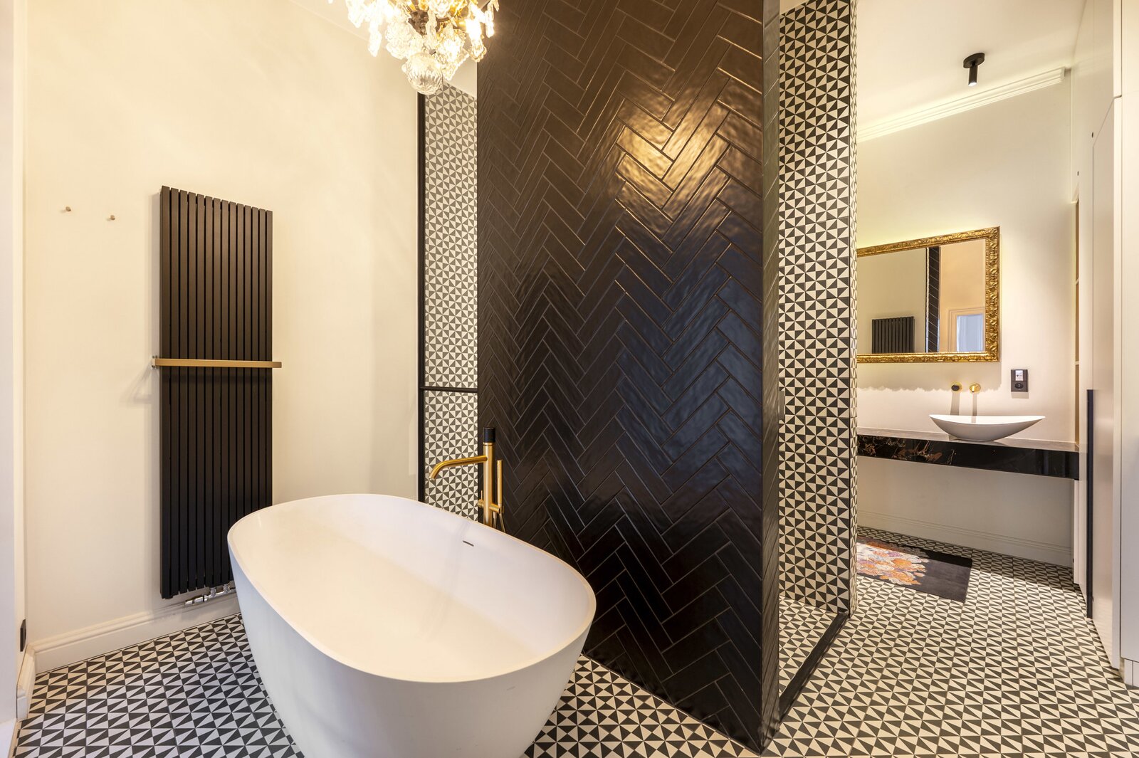 Floor 1: This master suite with beautiful authentic elements was finished to perfection and equipped with every comfort. Gas fireplace, ensuite bathroom with freestanding bath, walk-in shower and double sink and toilet.