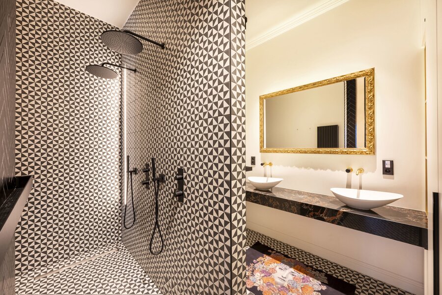 Mezzanine floor: Spacious bedroom with fitted wardrobes and stylish ensuite bathroom with double sink, walk-in shower and toilet.