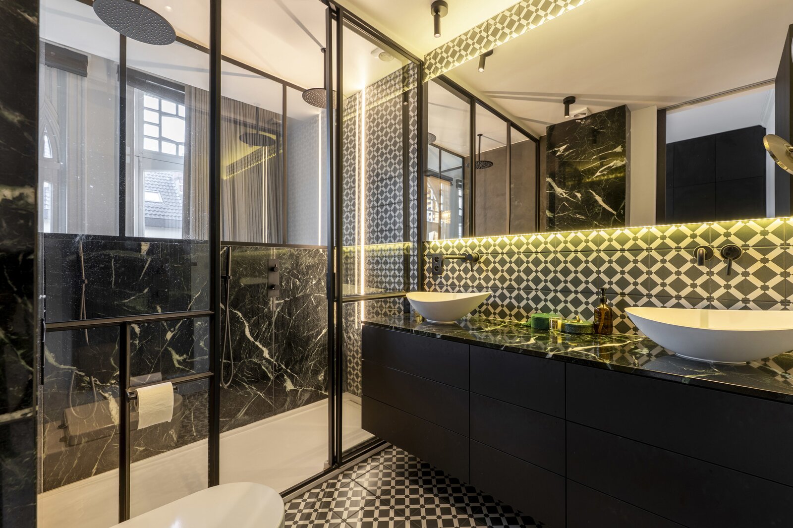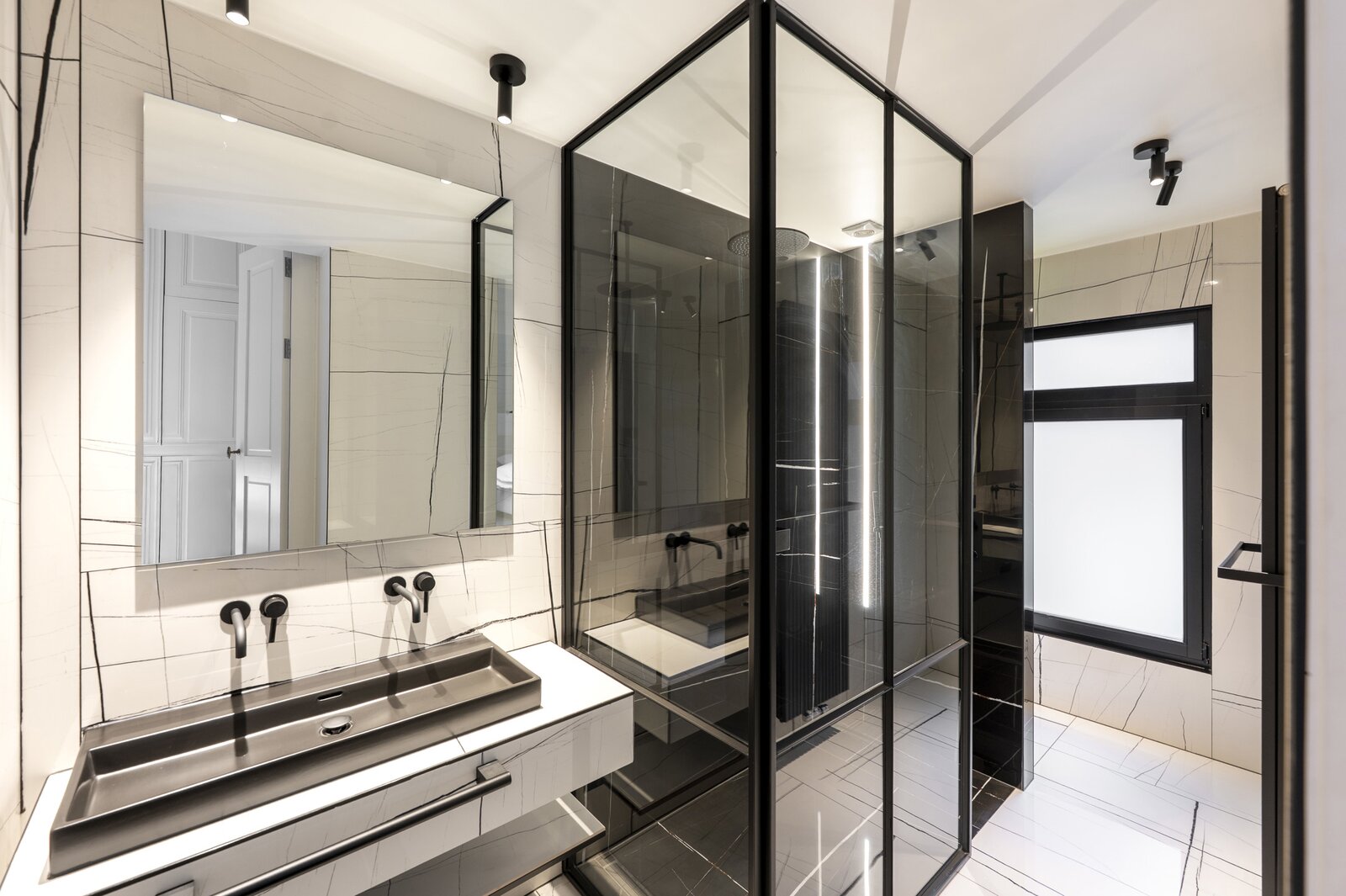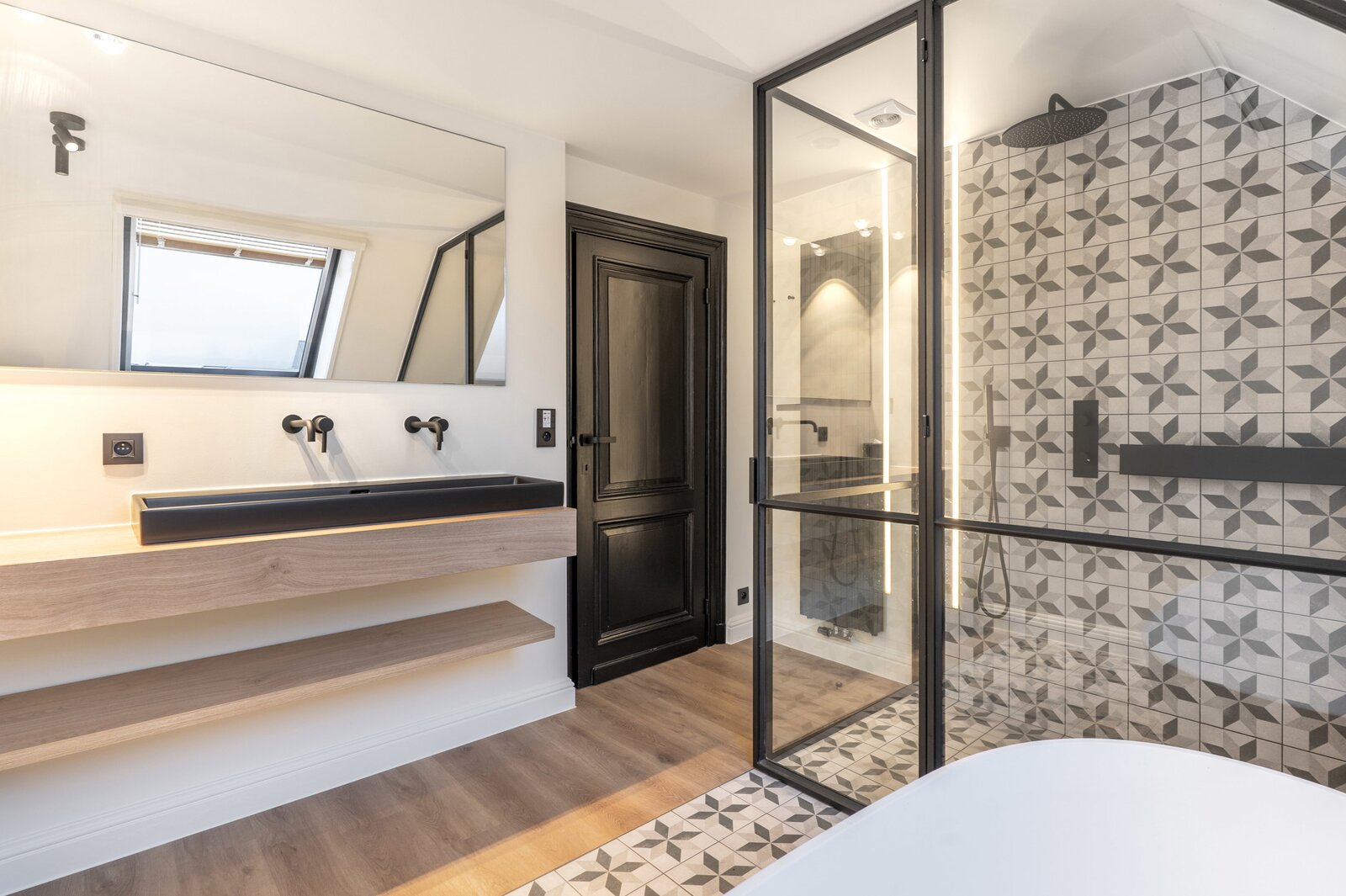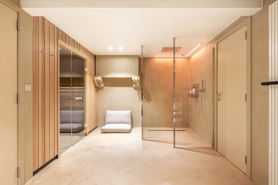 Fully equipped basement, with spacious laundry and ironing room, wine cellar with subtle lighting and luxurious wellness with hammam, sauna and rain shower. This floor was also largely finished in Mortex.