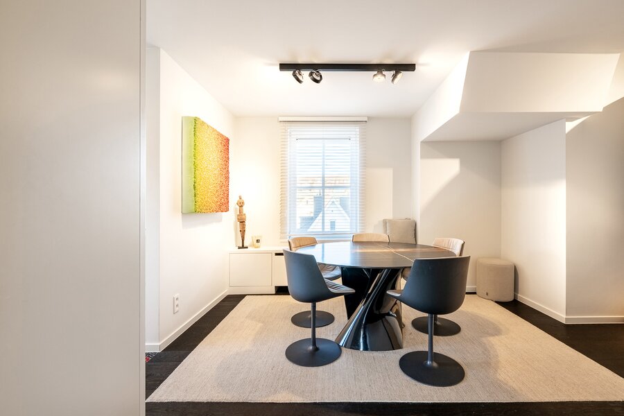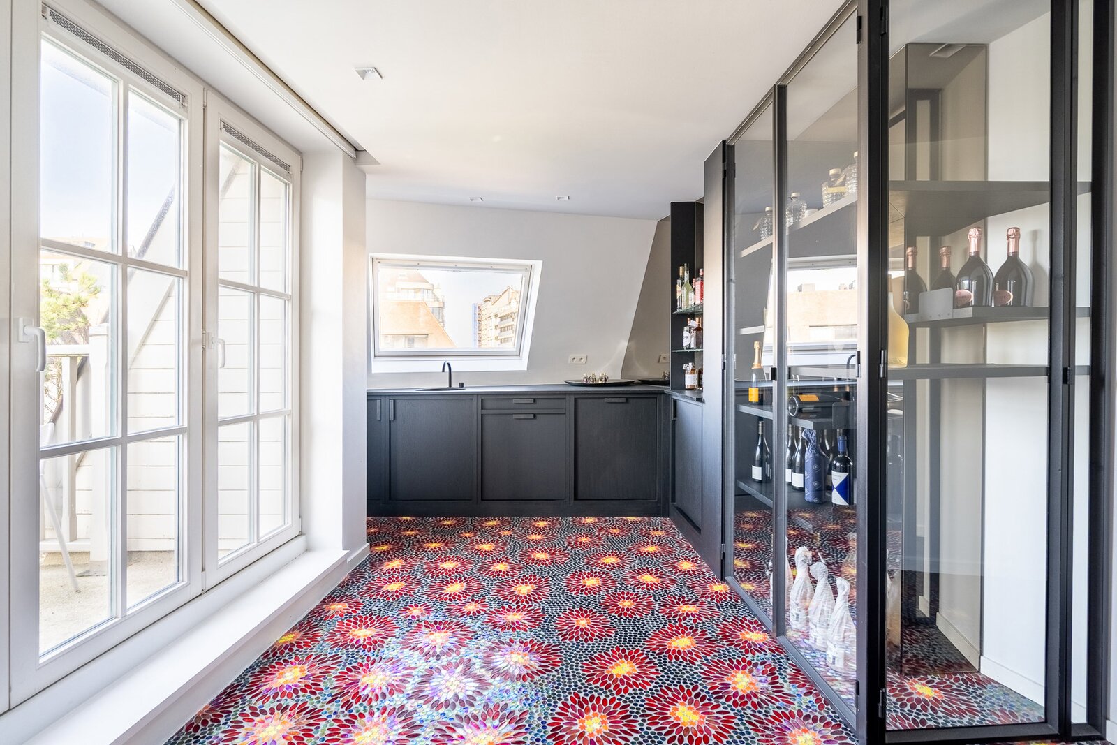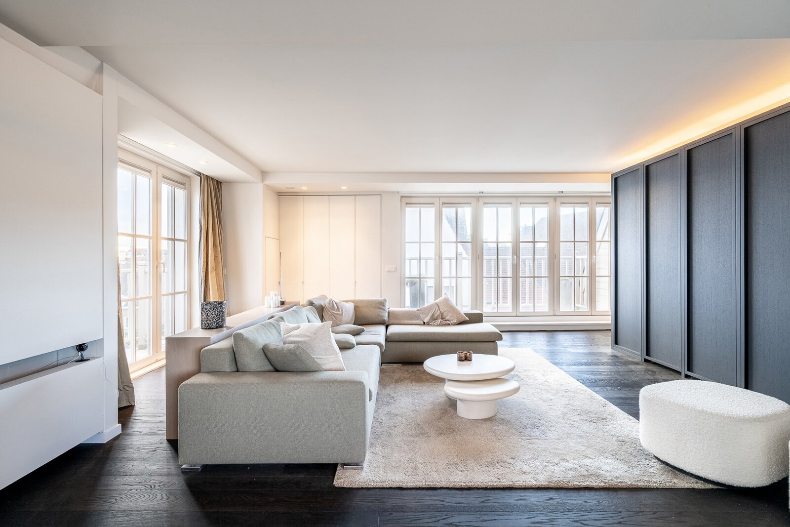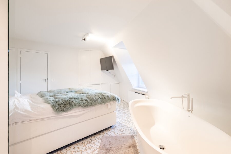This unique villa penthouse is located in a small residential building on Albertstrand beach and offers an exceptional sense of space, light, and comfort. The entrance hall with security door, cloakroom, and guest toilet leads to a spacious dining room with fireplace, a reading corner, and a generous living area with built-in cupboards. There is also a cozy TV room and a luxuriously equipped bar with dishwasher. The fully fitted kitchen features all MIELE appliances, ample storage space, and a pleasant breakfast area. The apartment comprises five bedrooms, each with its own bathroom, complemented by a separate toilet and a laundry room. Every room opens onto one of the six terraces, allowing you to choose between sun and shade at any time of the day. Automatic sun blinds and air conditioning ensure optimal comfort. Recently renovated using high-quality materials such as parquet flooring, glass mosaic floors, and bespoke oak veneer finishes, this apartment is completely move-in ready. There is also the option to purchase an underground parking space. A villa penthouse with this living area, five bedrooms, and five bathrooms is an exceptionally rare find in this prime beachfront location.