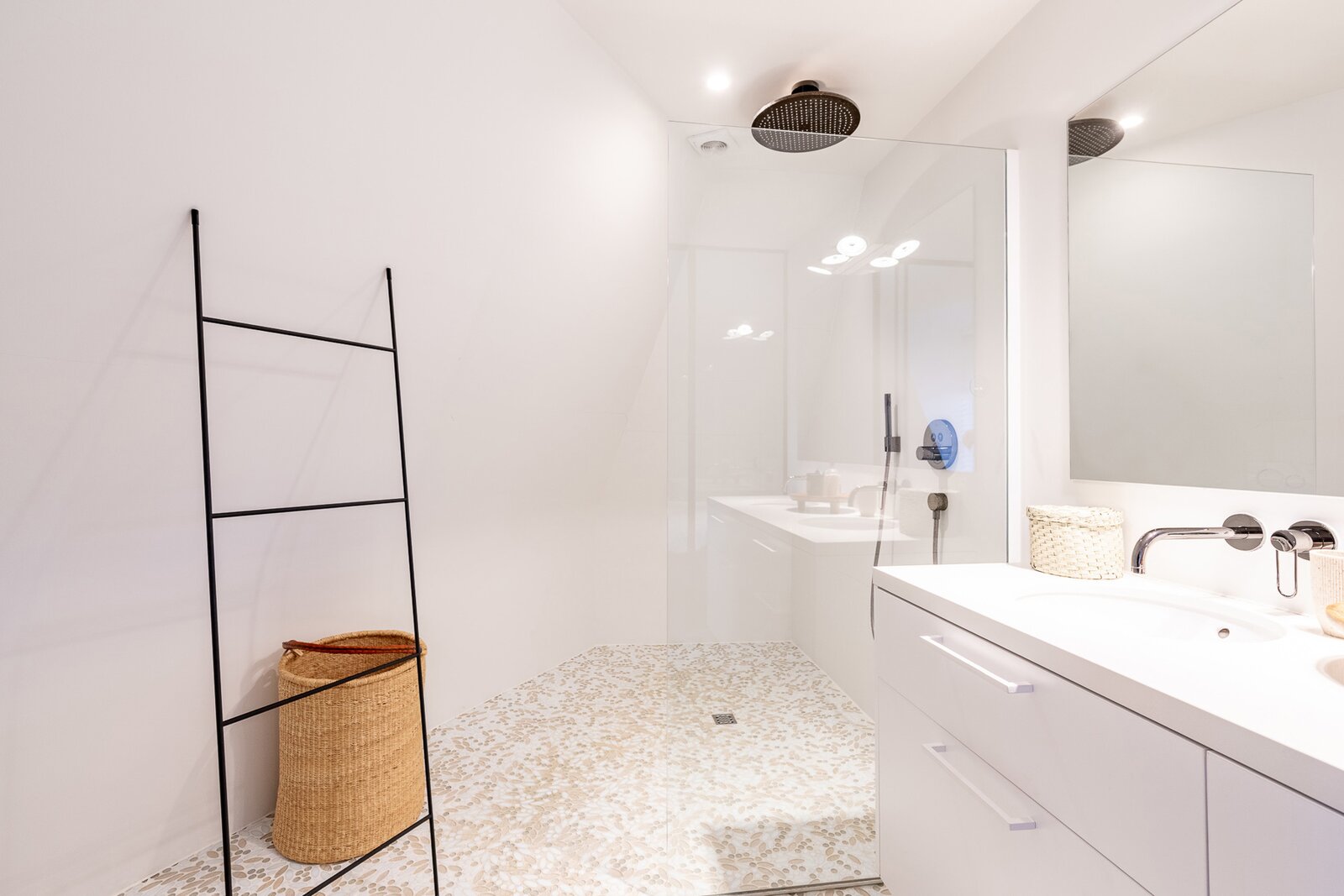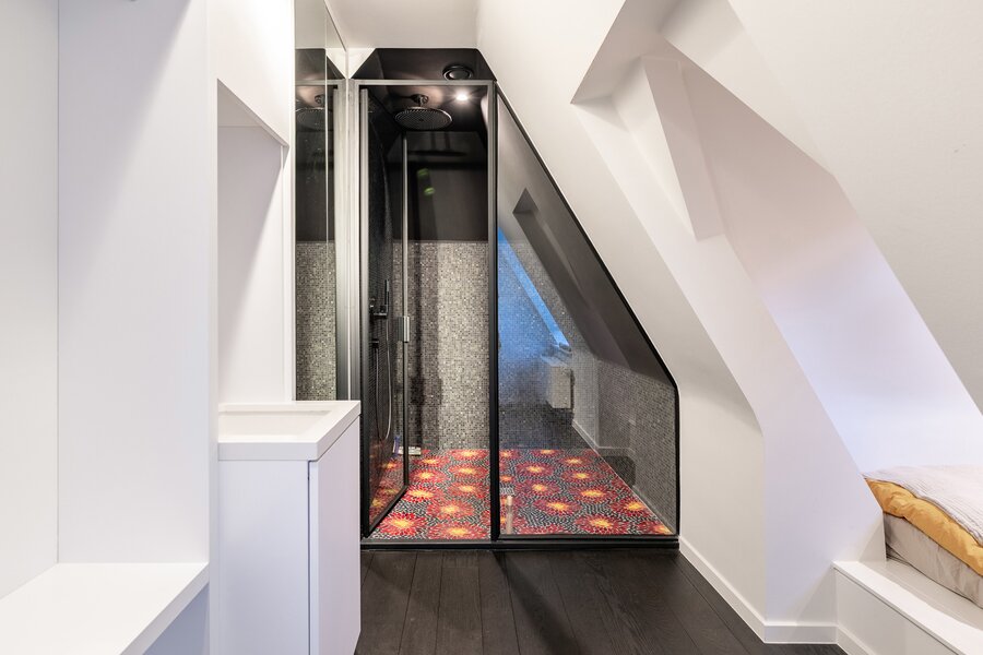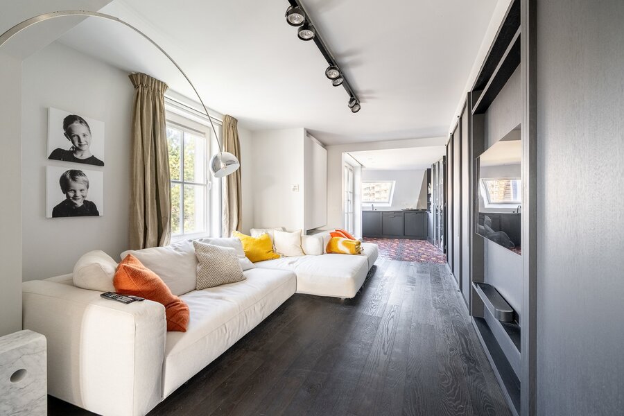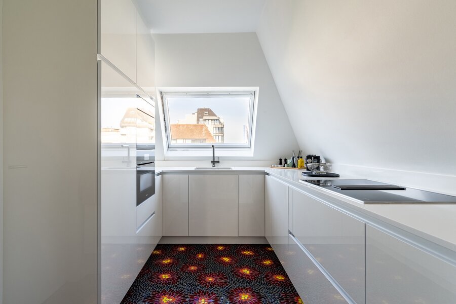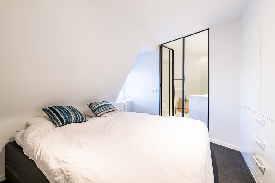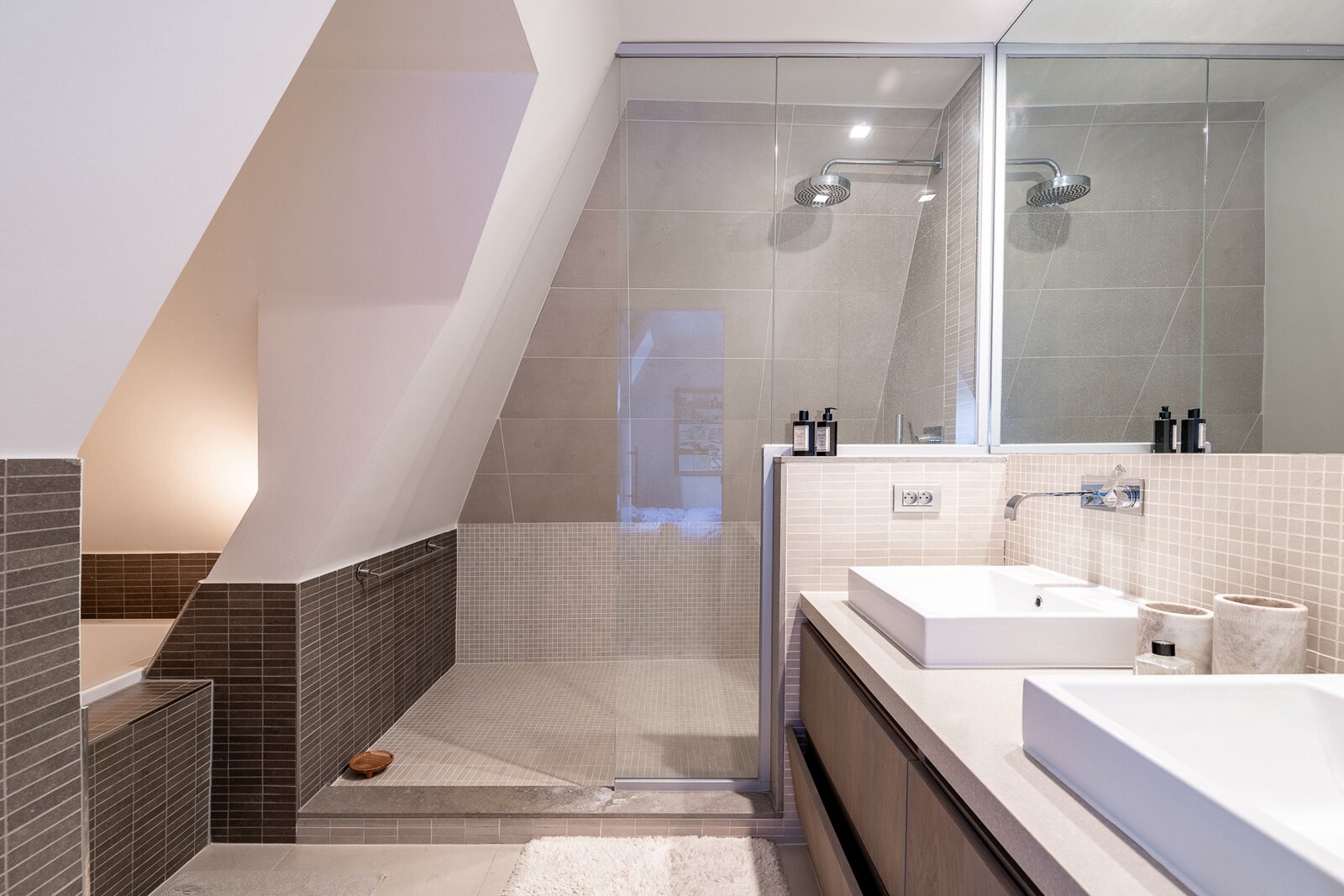 This unique villa penthouse is located in a small residential building on Albertstrand beach and offers an exceptional sense of space, light, and comfort. The entrance hall with security door, cloakroom, and guest toilet leads to a spacious dining room with fireplace, a reading corner, and a generous living area with built-in cupboards. There is also a cozy TV room and a luxuriously equipped bar with dishwasher. The fully fitted kitchen features all MIELE appliances, ample storage space, and a pleasant breakfast area. The apartment comprises five bedrooms, each with its own bathroom, complemented by a separate toilet and a laundry room. Every room opens onto one of the six terraces, allowing you to choose between sun and shade at any time of the day. Automatic sun blinds and air conditioning ensure optimal comfort. Recently renovated using high-quality materials such as parquet flooring, glass mosaic floors, and bespoke oak veneer finishes, this apartment is completely move-in ready. There is also the option to purchase an underground parking space. A villa penthouse with this living area, five bedrooms, and five bathrooms is an exceptionally rare find in this prime beachfront location.