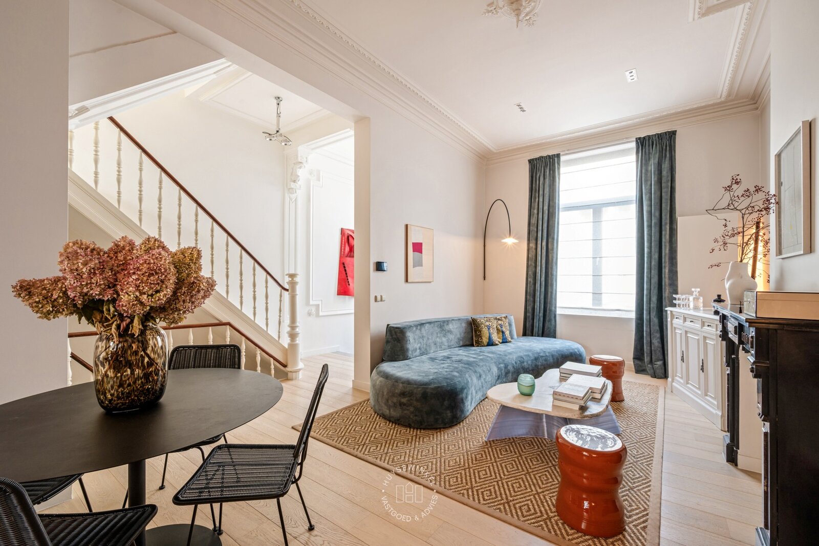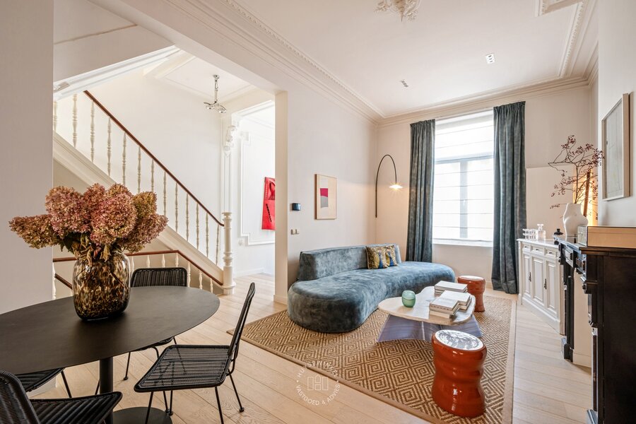 Deze unieke herenwoning met een bewoonbare oppervlakte van 230 m² is gelegen in de Holdaal, op wandelafstand van de Leie en het Citadelpark, met tevens een vlotte bereikbaarheid via de belangrijkste invalswegen en de nabijheid van het station Gent-Sint-Pieters. Een absolute troef is de ligging in een eenrichtingsstraat met enkel lokaal verkeer, wat zorgt voor een uitzonderlijke rustige een aangename woonomgeving. De imposante gevel verleent de woning meteen een statige en authentieke uitstraling. Bij het binnenkomen betreedt u de karaktervolle inkomhal die overgaat naar een charmante trappenhal. Kenmerkend voor de woning zijn de hoge plafonds, die een ruimtelijk gevoel creëren.