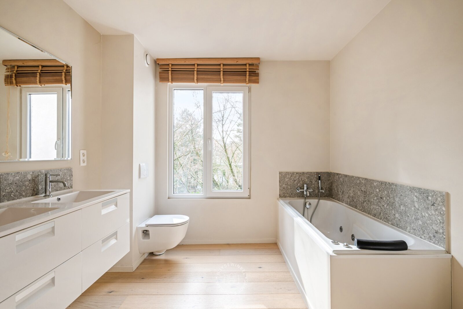 Op de tussenverdieping bevindt zich een ruime badkamer voorzien van dubbele lavabo, douche en een ligbad. De eerste verdieping omvat twee ruime kamers, één ingericht als slaapkamer en de andere momenteel als dressing, maar eenvoudig om te vormen tot een slaapkamer. De tweede verdieping biedt een gelijkaardige indeling met twee kamers en een extra douchekamer.