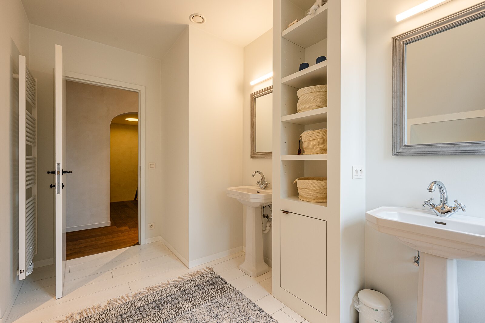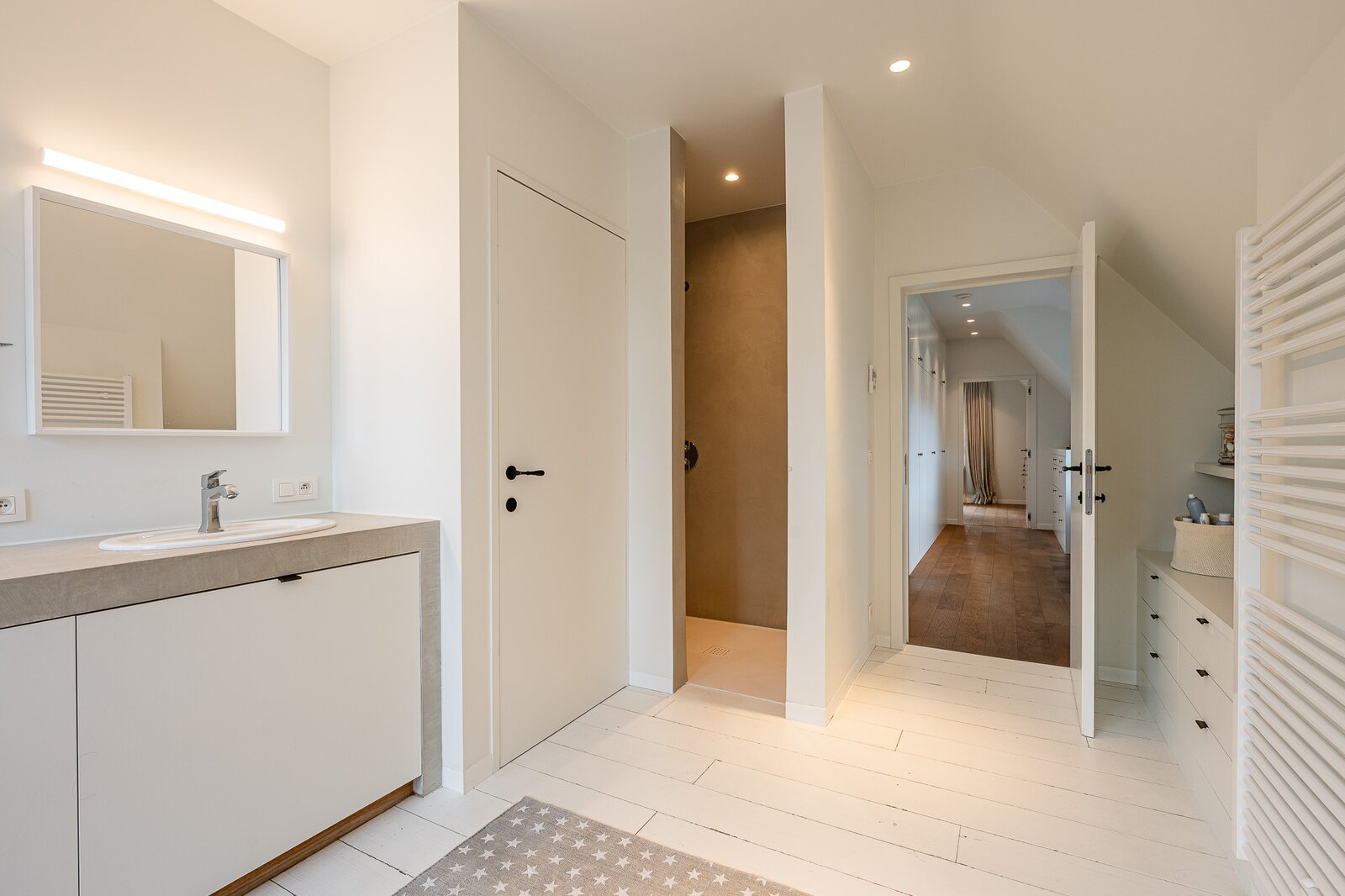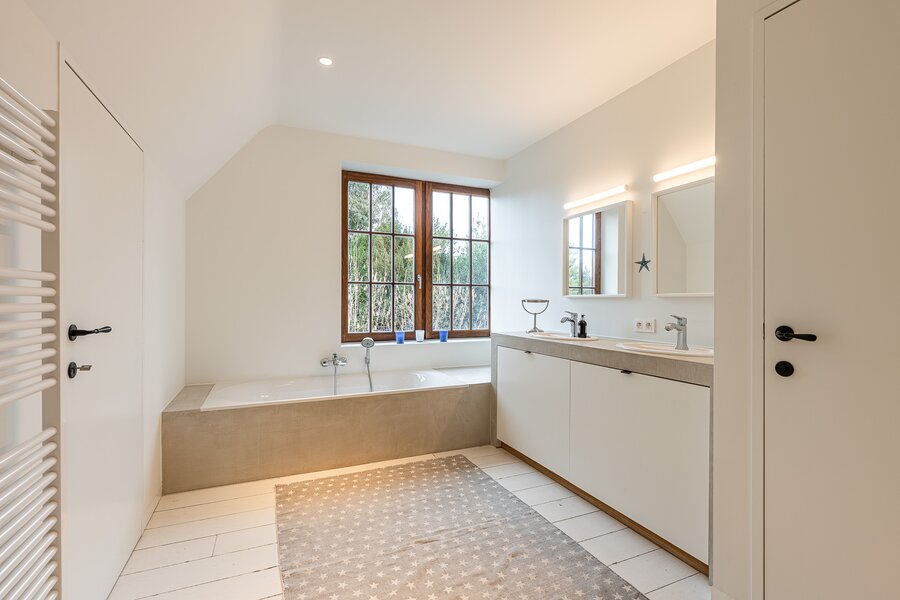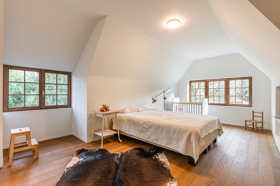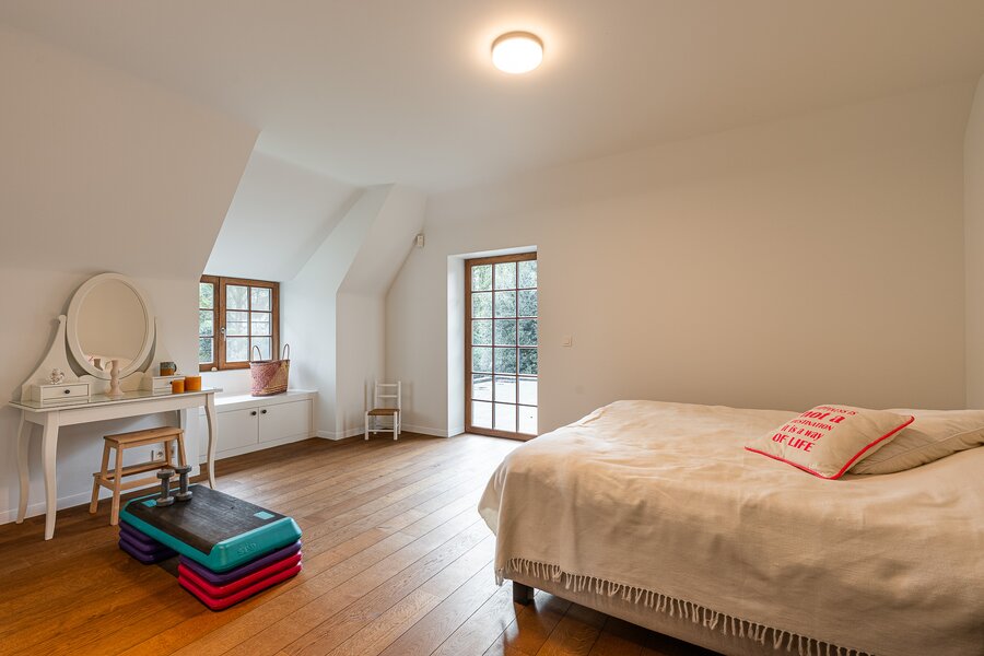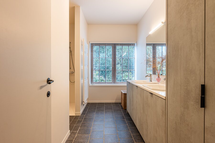 Op de verdieping bevinden zich drie ruime slaapkamers elk met eigen of aansluitend sanitair. En aangevuld met een ruime dressing. Wat véél mogelijkheden biedt voor een groot of eventueel nieuw samengesteld gezin. Met respect voor ieders ruimte en privacy.