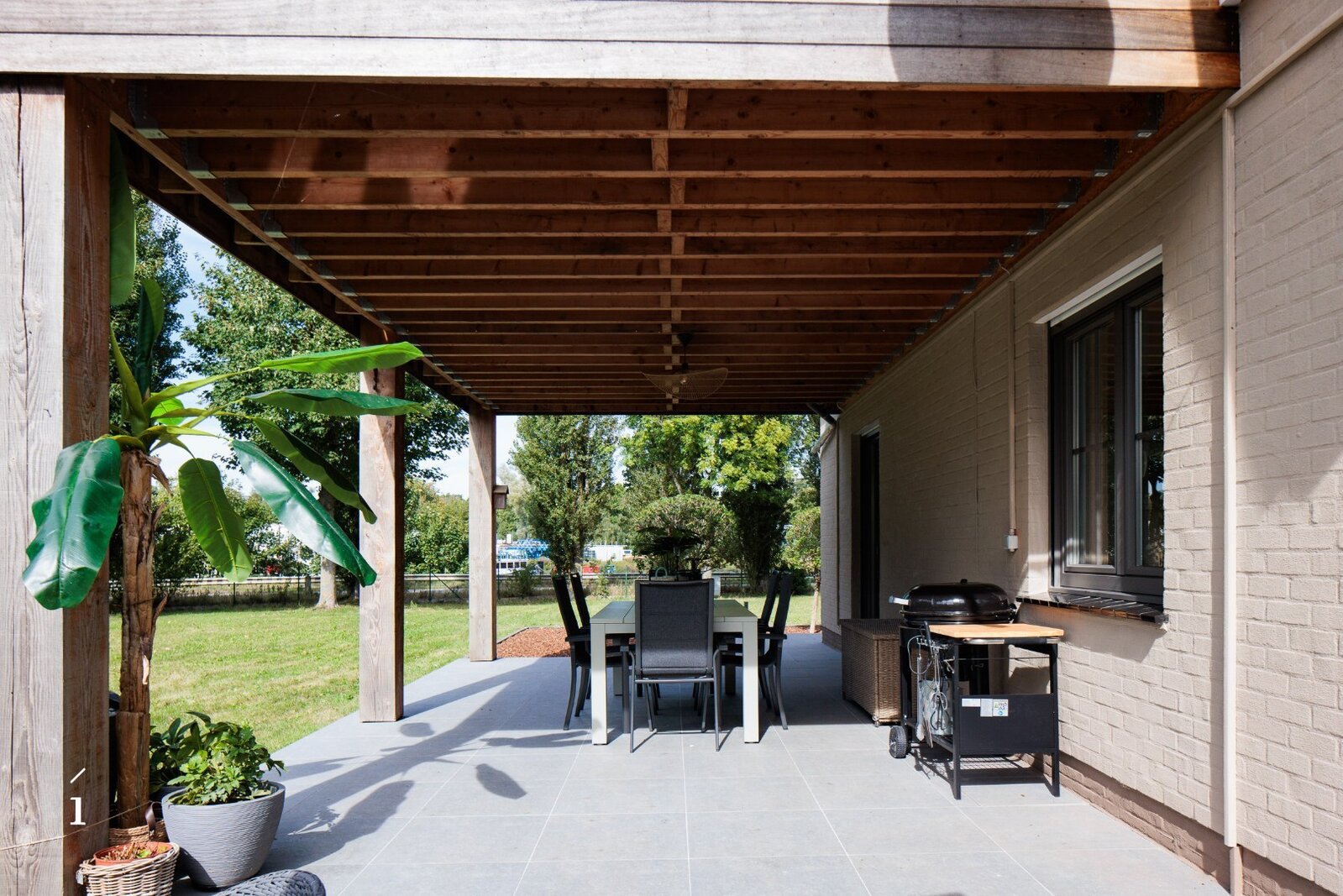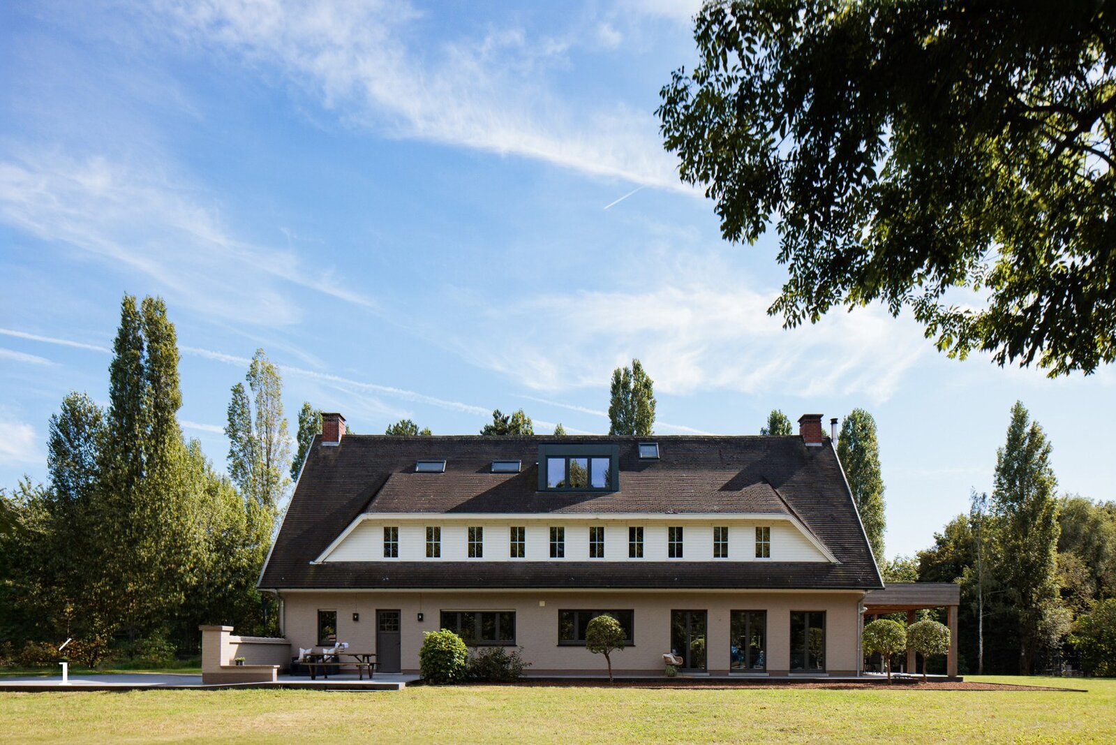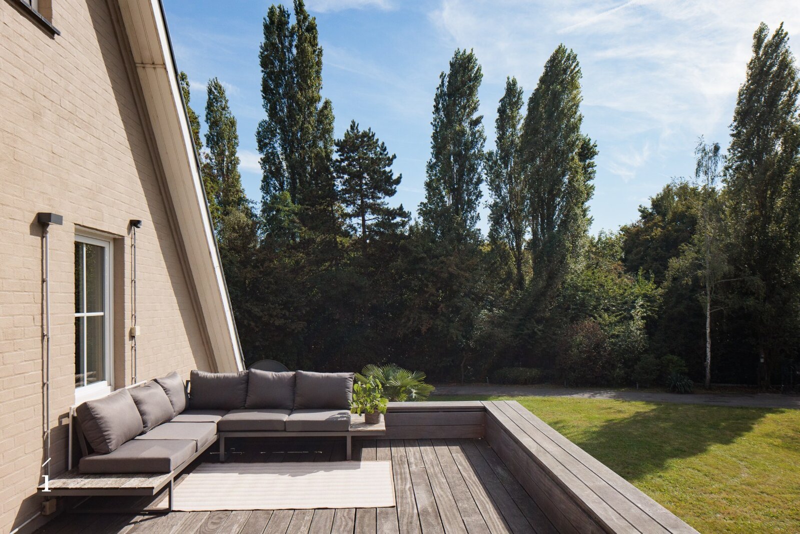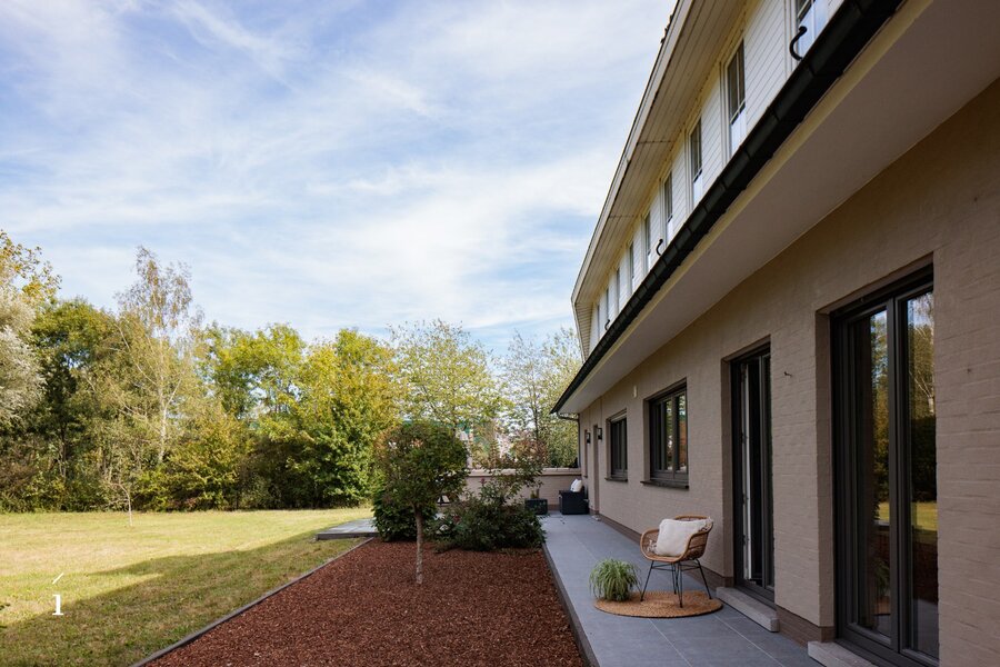 Het perceel zelf is een absolute troef: met een oppervlakte van 5.480 vierkante meter biedt het een zeldzaam gevoel van ruimte en vrijheid. Omringd door volwassen bomen en weelderige natuur, is privacy hier gegarandeerd. Tussen het groen door is er op meerdere plaatsen zicht op het omliggende water, wat zorgt voor een rustige, bijna meditatieve sfeer. De woning staat mooi centraal op het domein en wordt omringd door verschillende terrassen met diverse oriëntaties, waardoor je op elk moment van de dag ergens kan genieten van de zon.