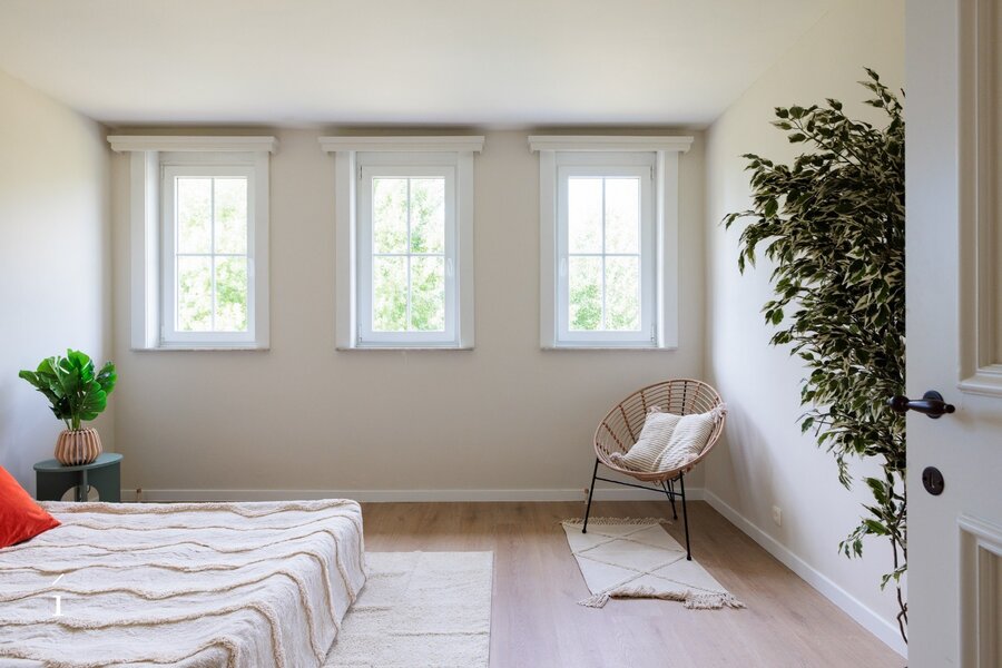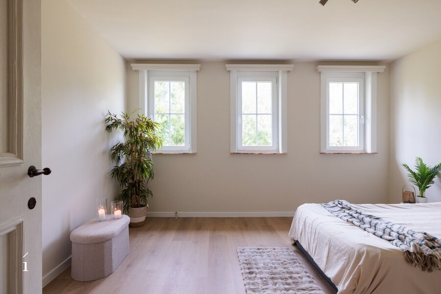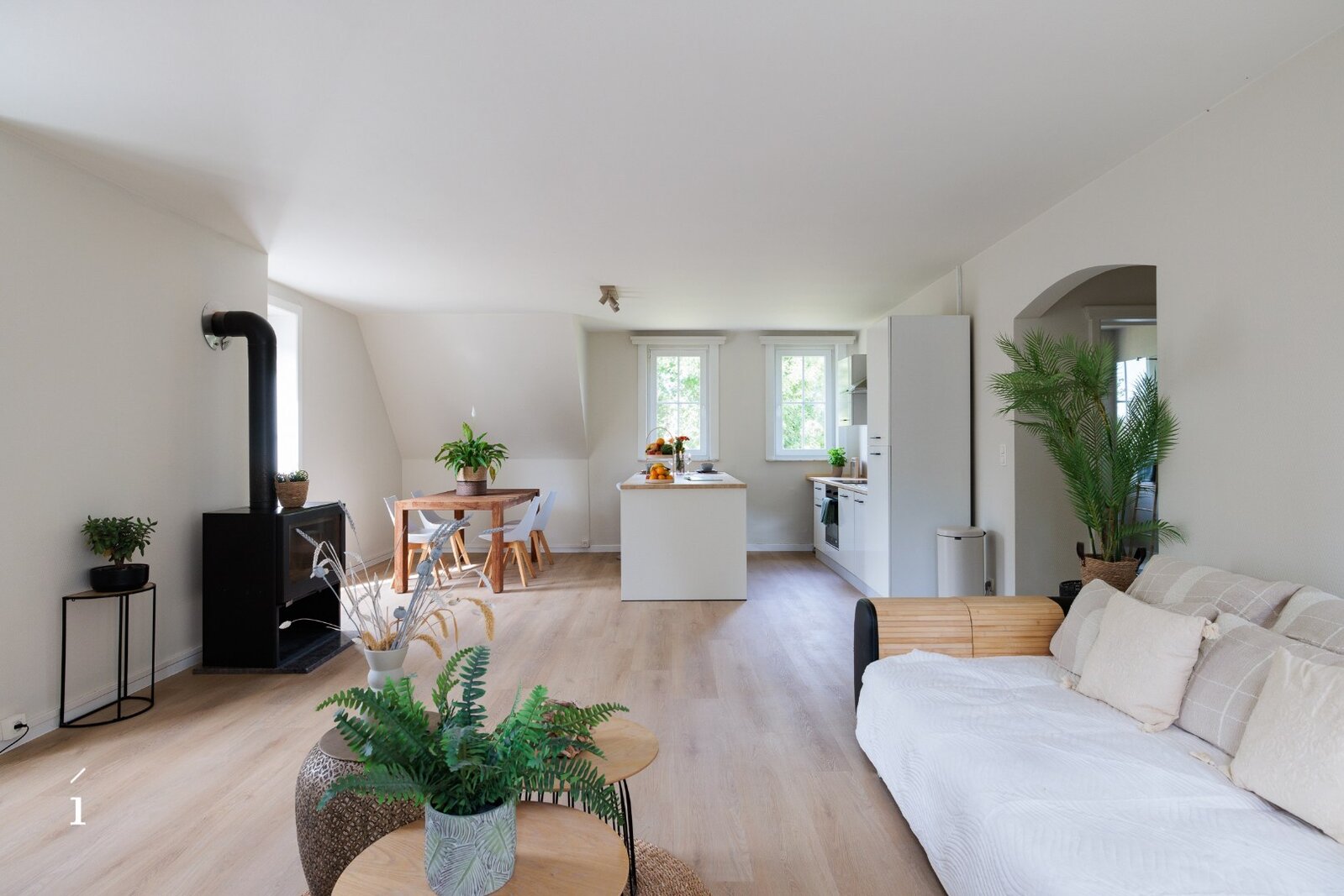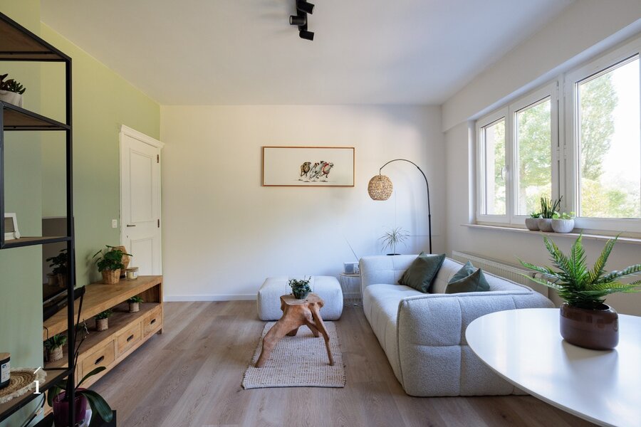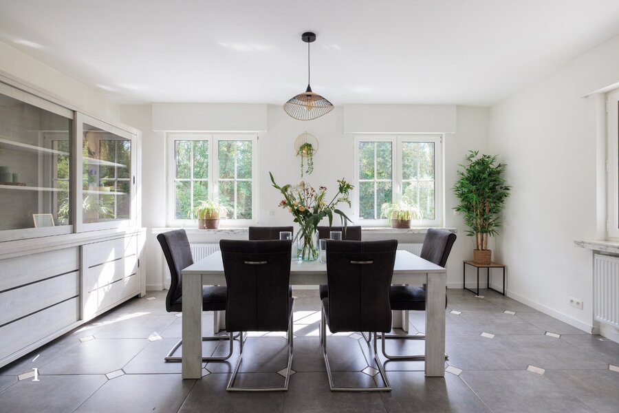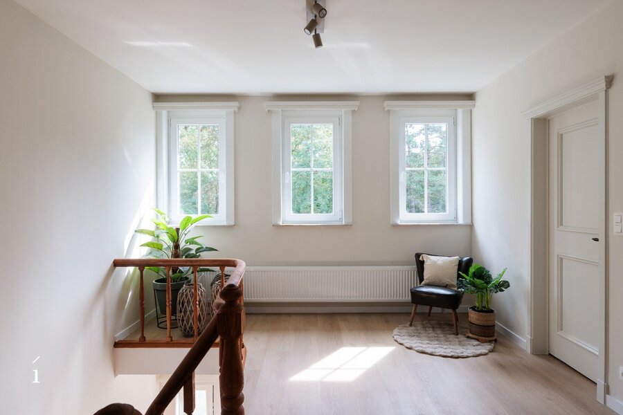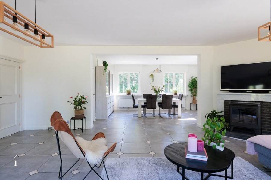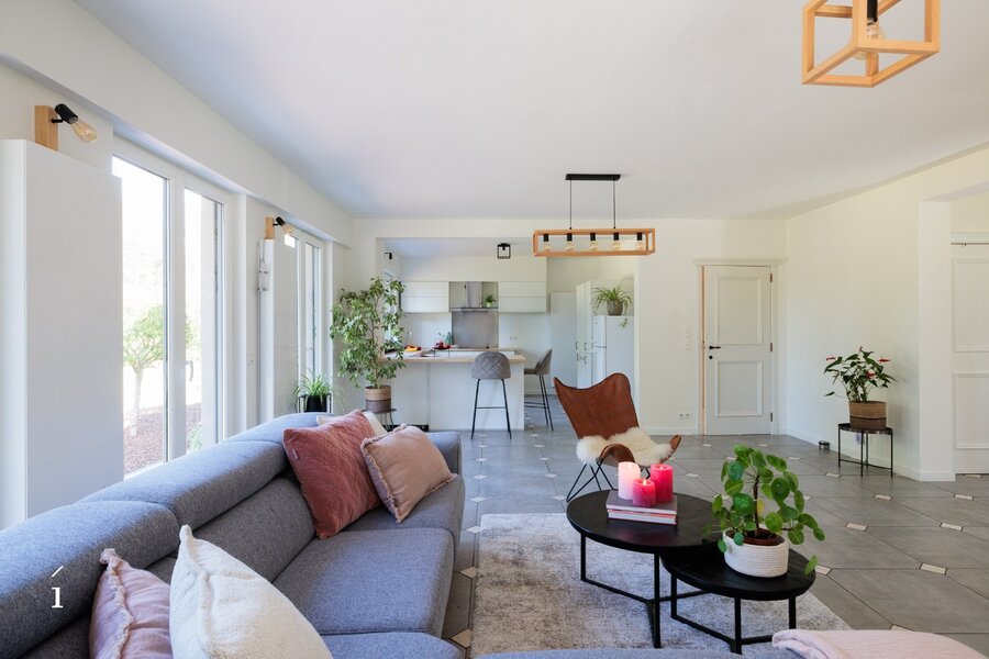 Via de ruime inkomhal, met gastentoilet, komt u binnen in deze open leefruimte. dankzij de indeling vloeien woonkamer, zithoek en keuken naadloos in elkaar over, wat zorgt voor een ruimtelijk en verbonden gevoel. Grote raampartijen langs drie zijden – oost, zuid en west – laten de hele dag door het natuurlijke licht binnenstromen en bieden een prachtig zicht op het omliggende groen.